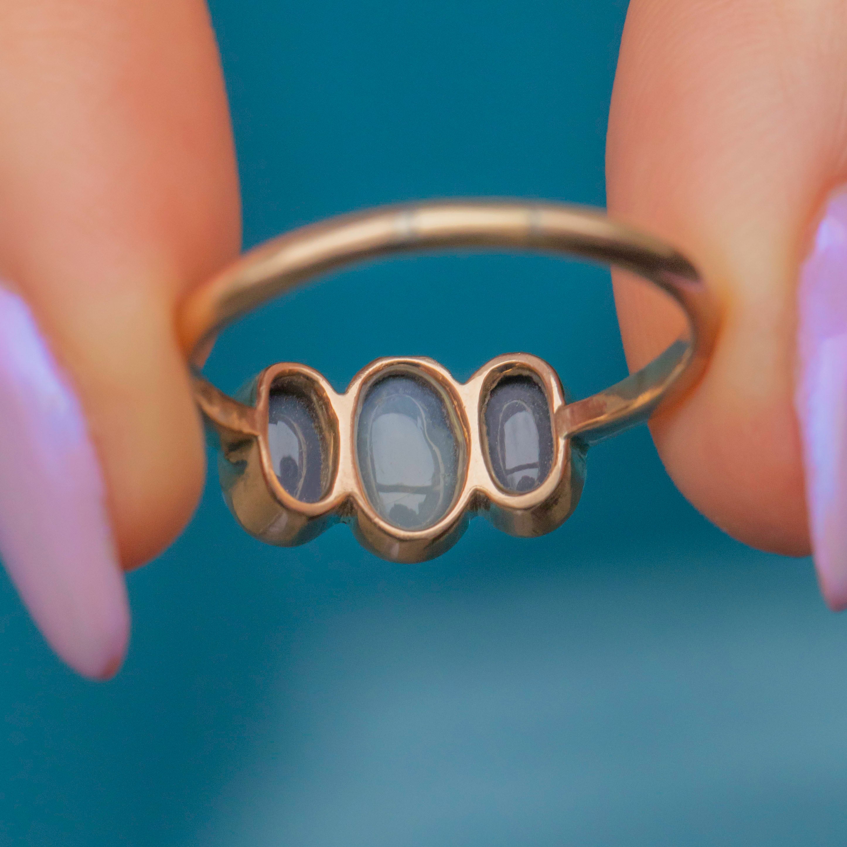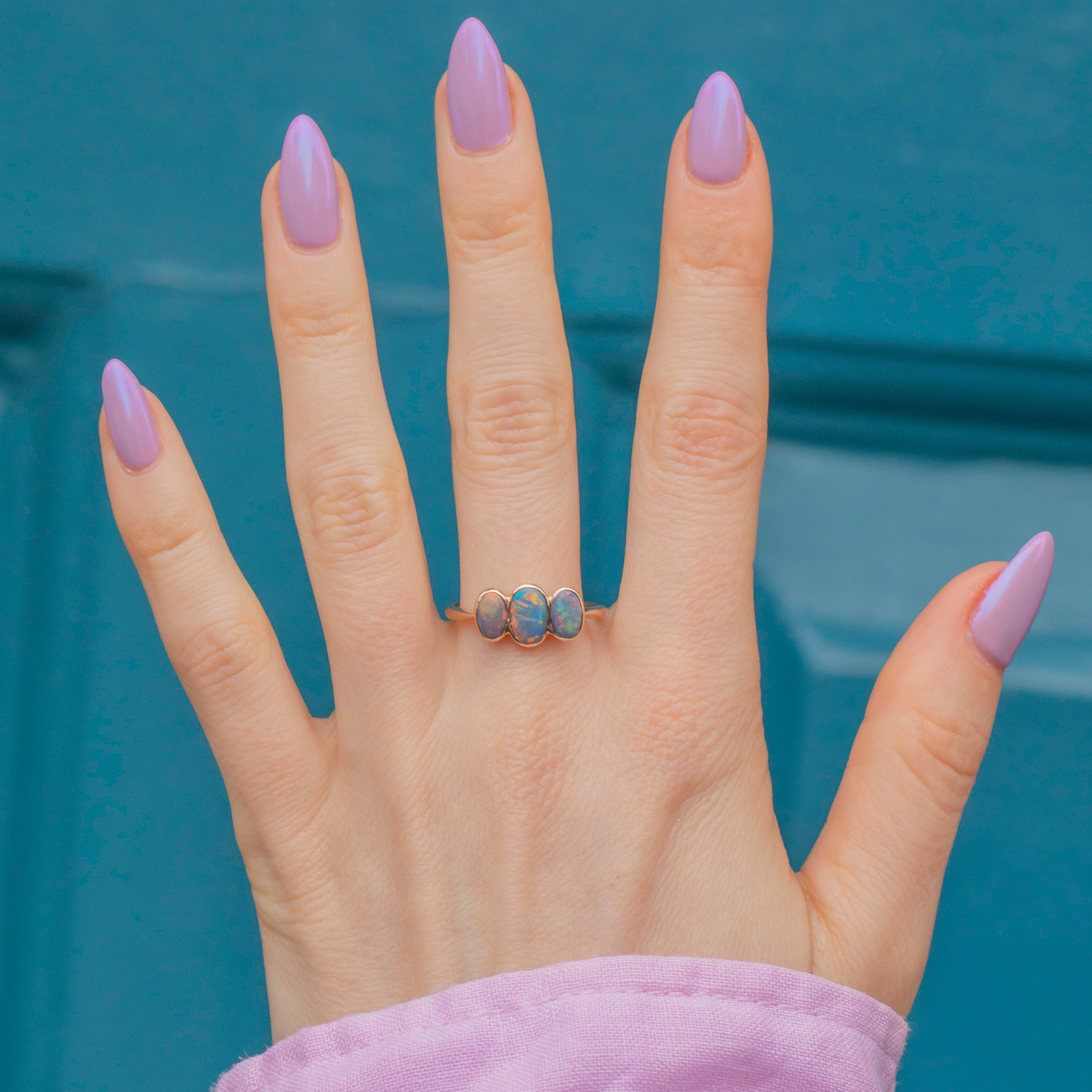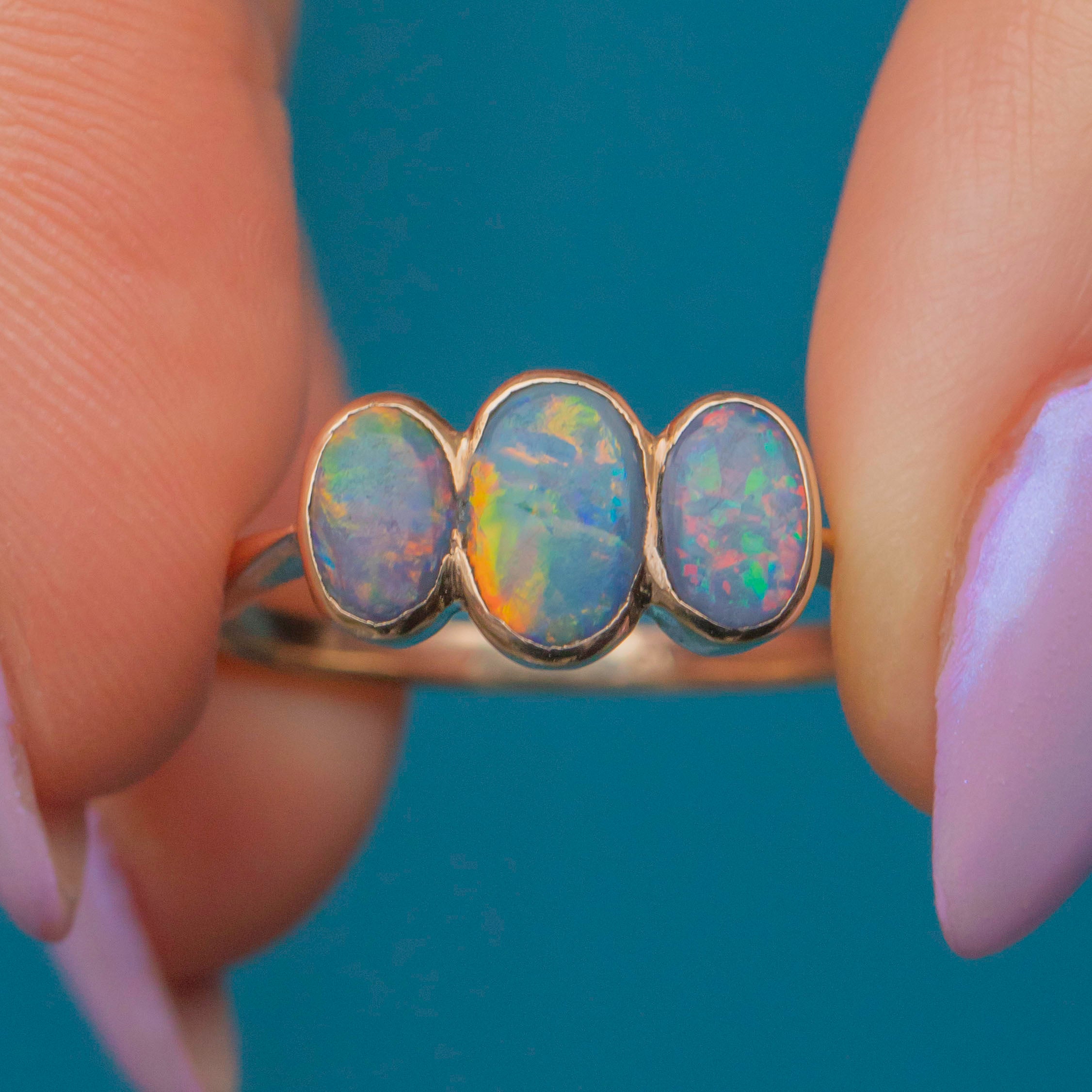 This exquisite antique 9ct Gold Black Opal three stone ring is a timeless treasure, showcasing three mesmerising Black Opals set in warm 9ct Gold. Each Opal shimmers with a captivating play of colour, displaying galactic flashes of deep blues, rich greens, fiery reds, and hints of violet as they catch the light.