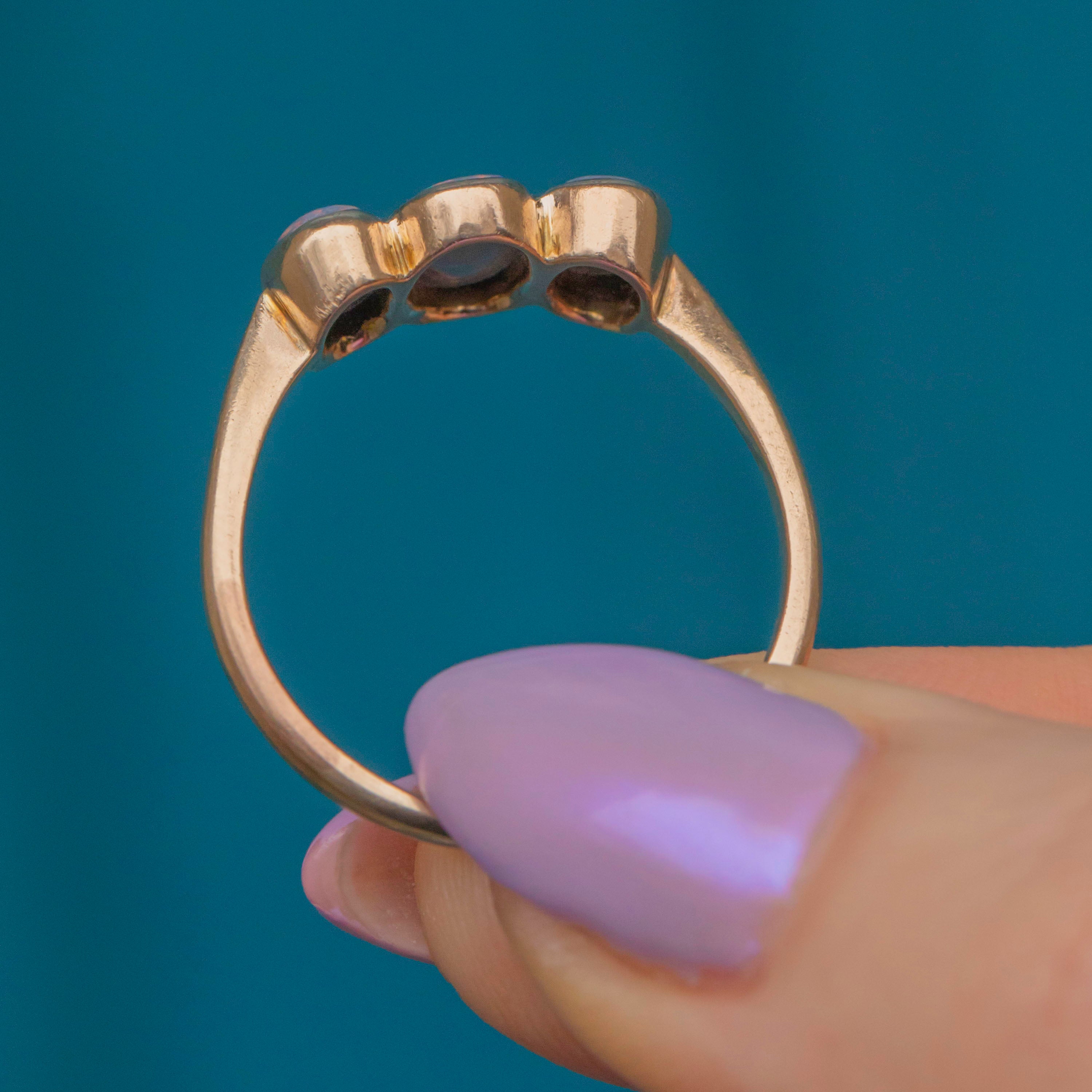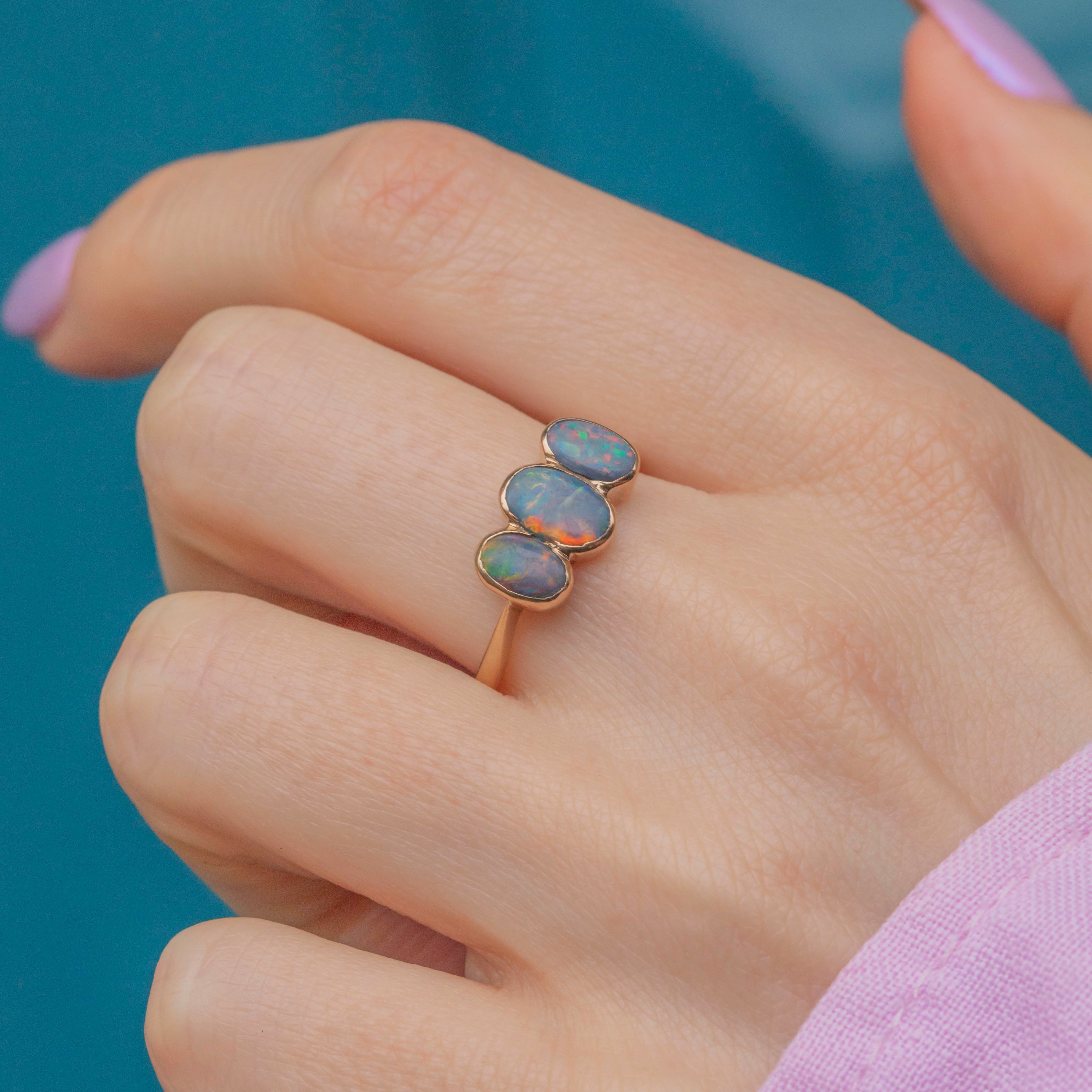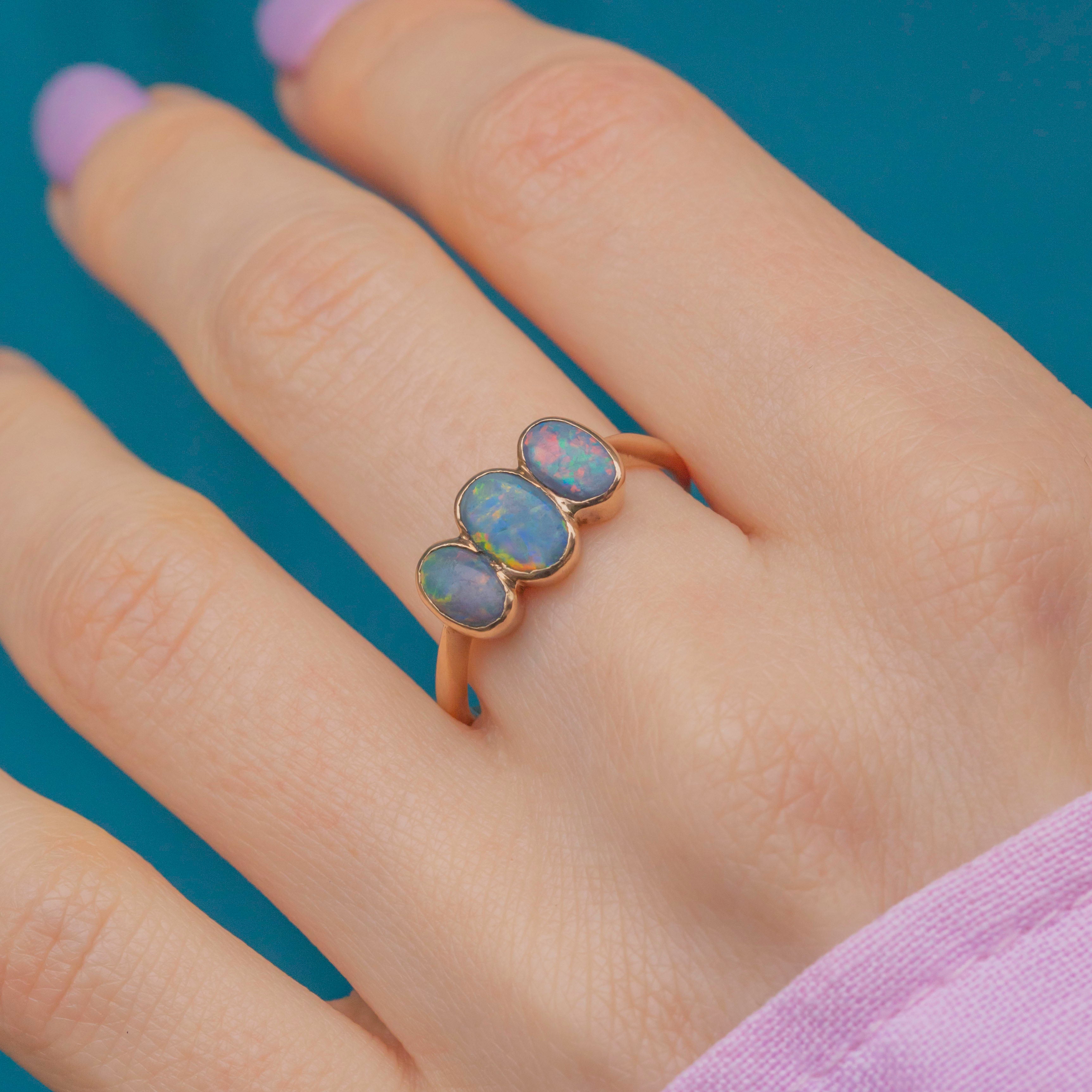 The elegant bezel settings enhance the Opals’ natural beauty, with the smooth band providing comfortable wear. A true statement piece, this antique Opal ring embodies the opulence and romance of the Victorian era!