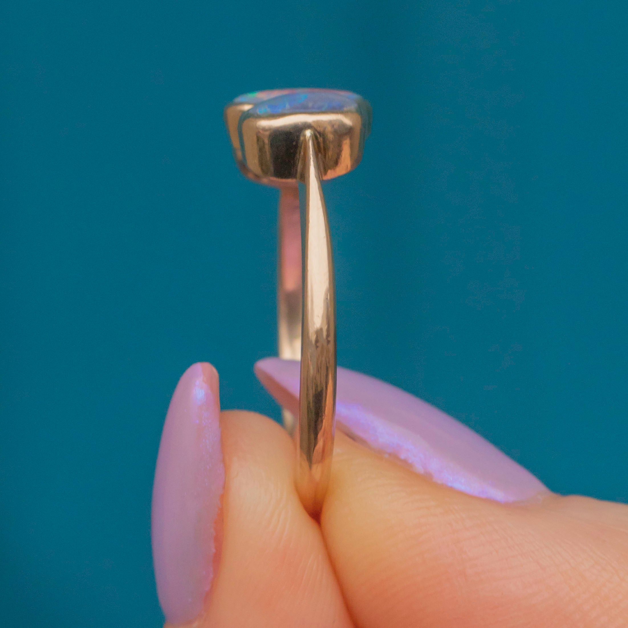 Central Black Opal is 7mm long x 4.5mm wide, weighing approx. 0.35ct.