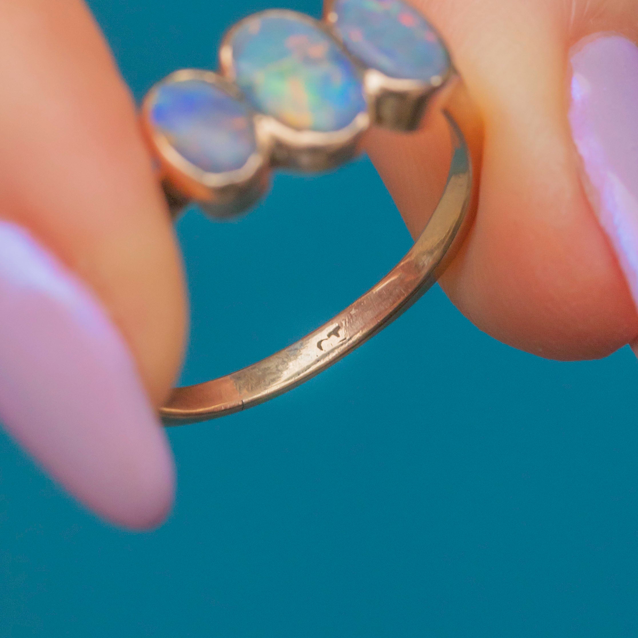 FAIR - GOOD This antique 9ct Gold Black Opal three stone ring is in fair condition, with signs of age and wear consistent with her history. The central Opal has suffered an impact, resulting in a split, while another Opal bears surface scratches, however this does not impact the colour or vibrancy of the stones which still sparkle with vibrant hues. The Gold settings have worn with time but the stones remain securely set. Her band shows evidence of resizing, with a slight variation in the Gold's hue at the join. Despite these imperfections, the ring remains structurally sound, and the Opals still display their mesmerising play of colour, making it a charming and wearable antique piece!