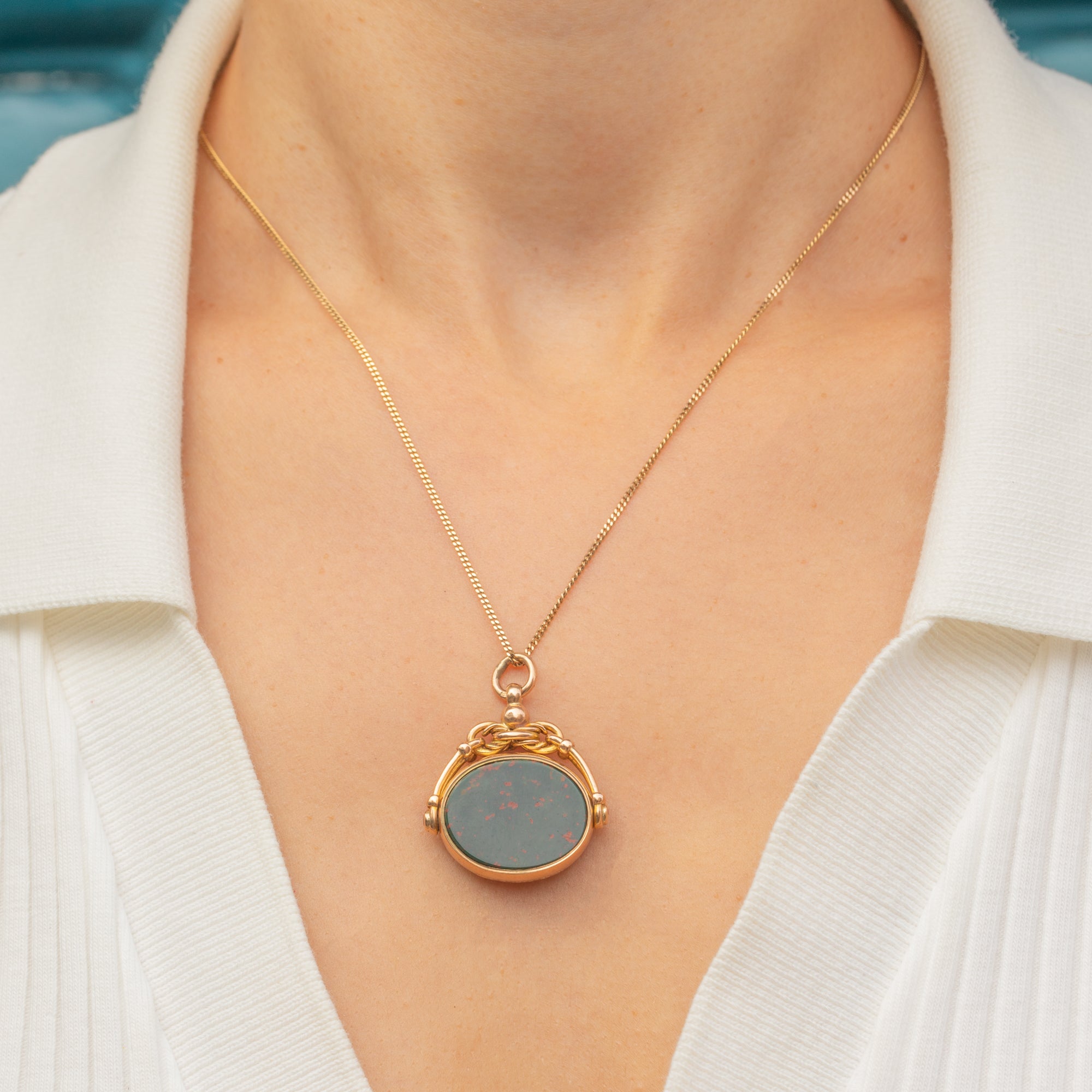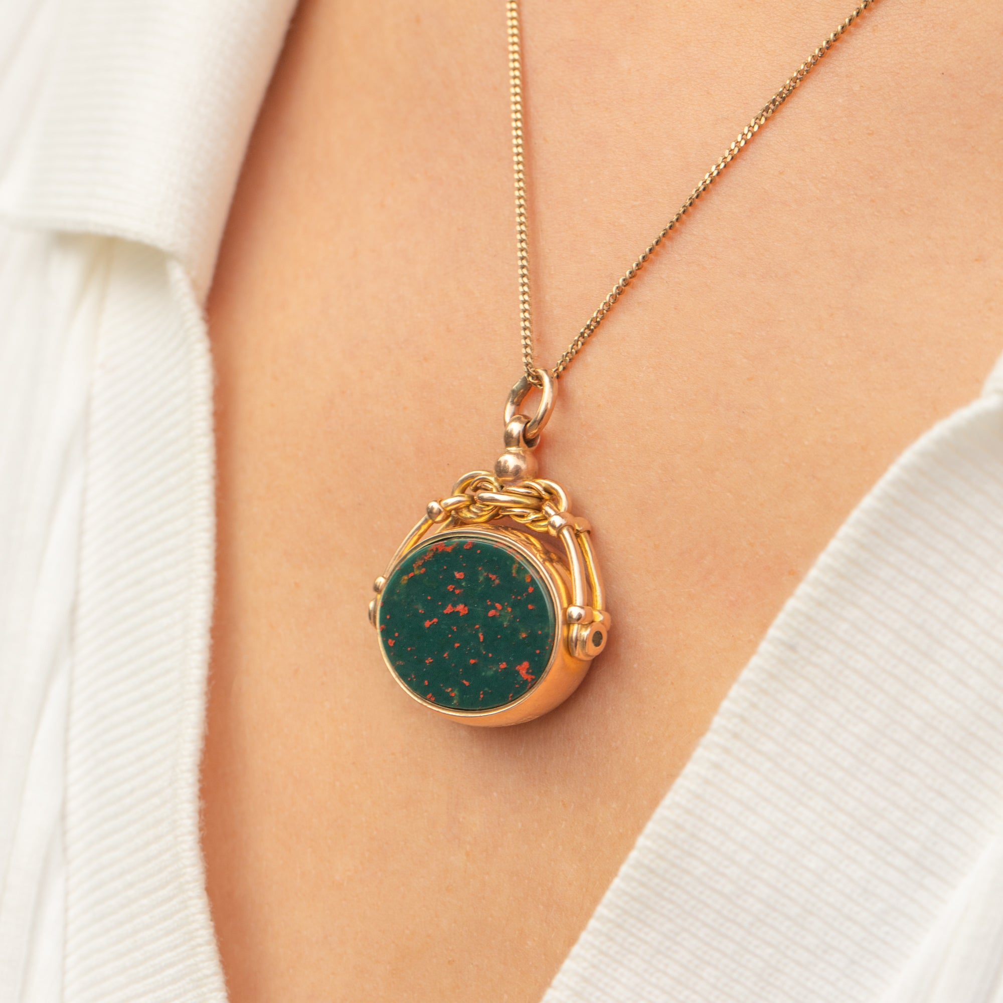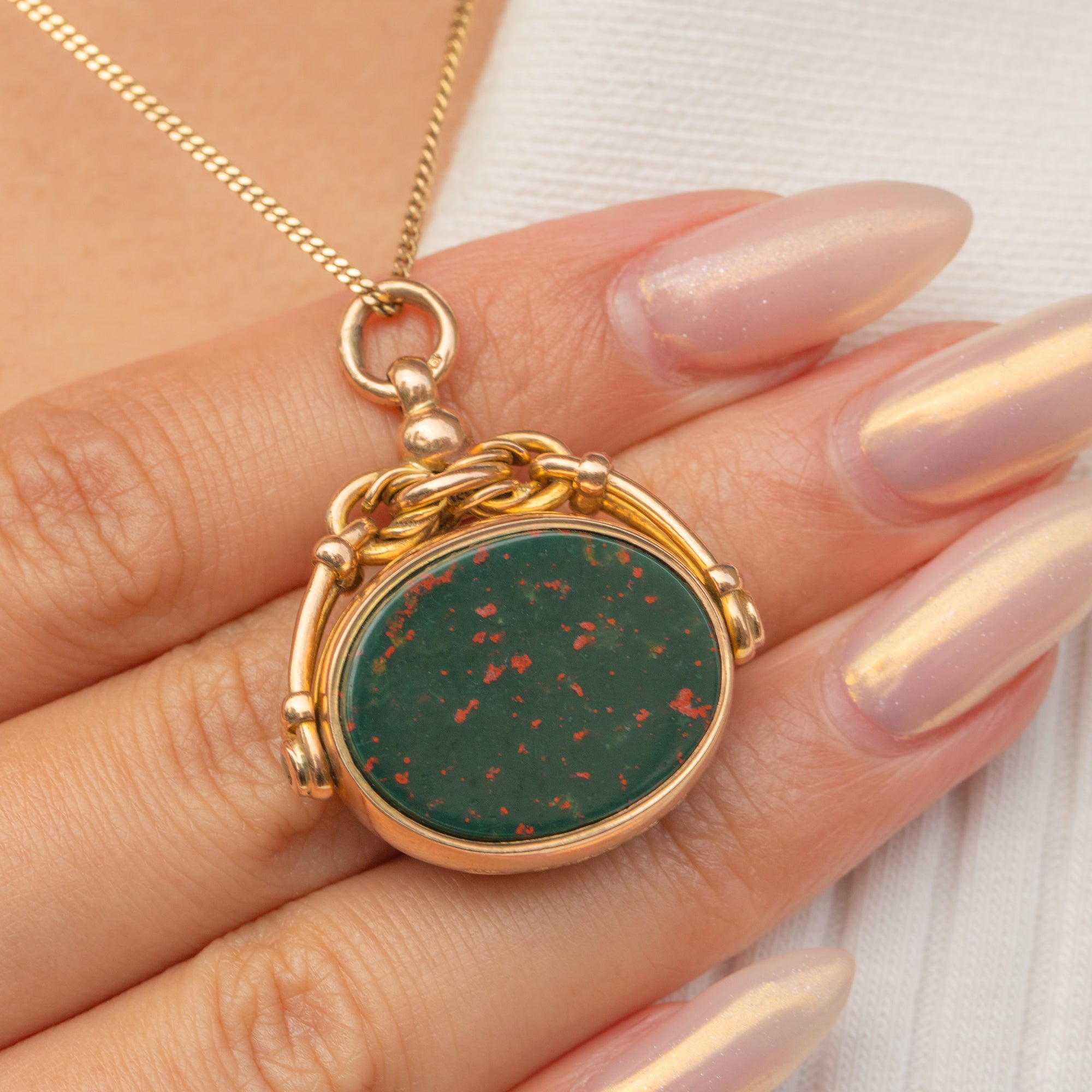 This Edwardian spinning fob pendant is crafted in 9ct Gold and set with two classic hardstones: a deep green Bloodstone flecked with vivid red, and a rich orange-red Carnelian. Each side is flat-polished, offering a smooth surface that captures the light with subtle lustre.