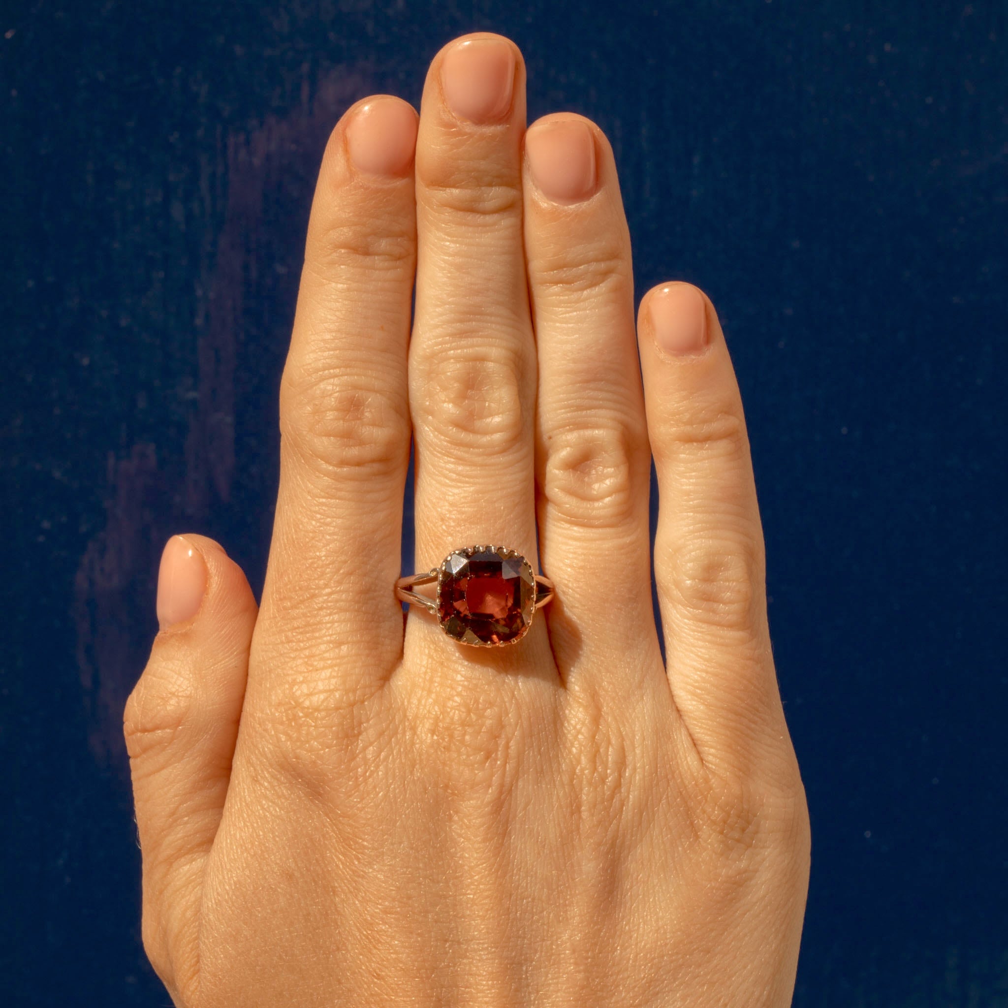 VERY GOOD. This antique 9ct Gold brown Zircon ring is in very good condition. The Zircon has kept beautifully and has wonderful double refraction lines visible- a typical trait of Zircons; she is free of chips and looks gorgeous. The setting does have some discolouration present but nothing that draws the eye. The ring has been resized once upon a time, which has left a solder mark, but the ring band wears super smoothly and comfortably.