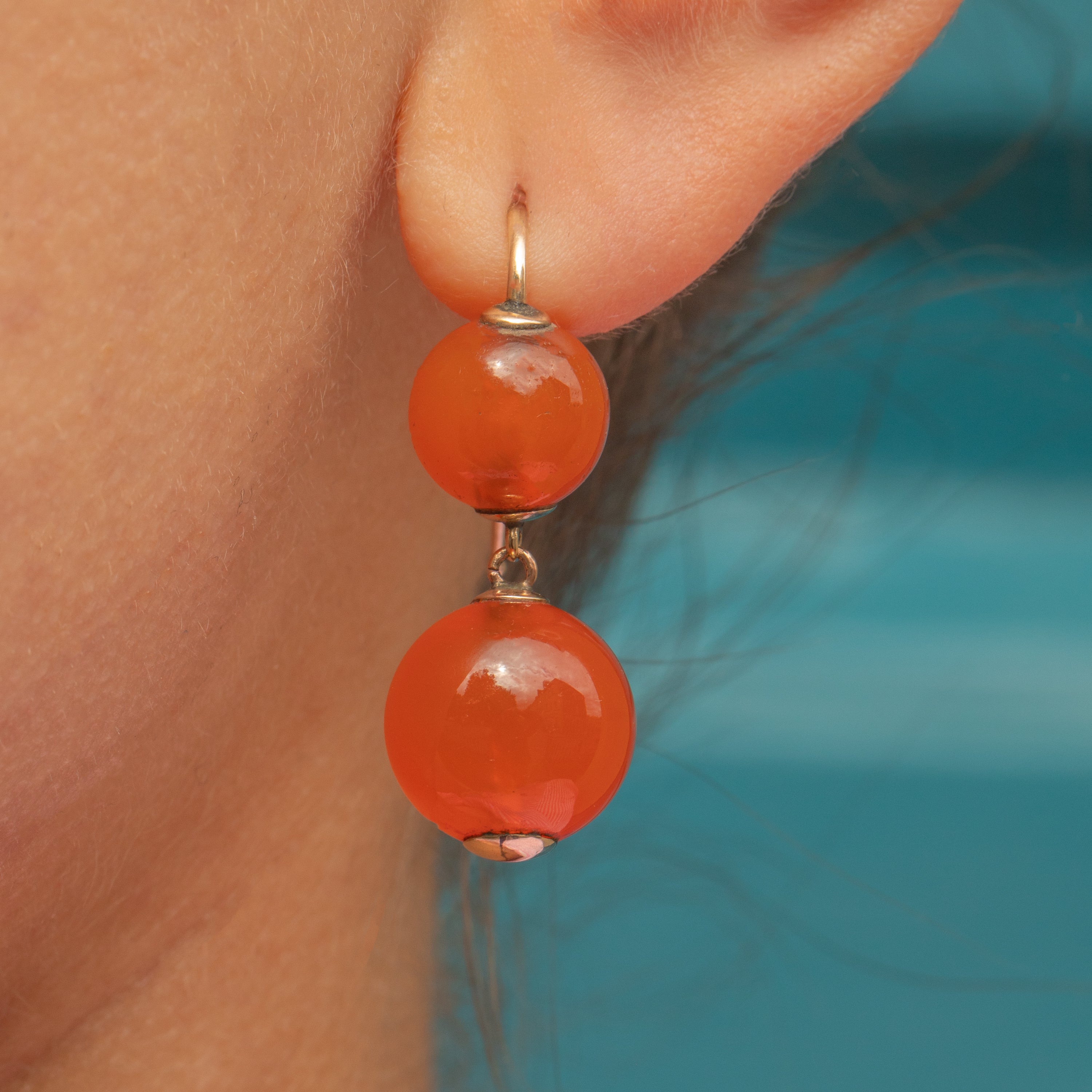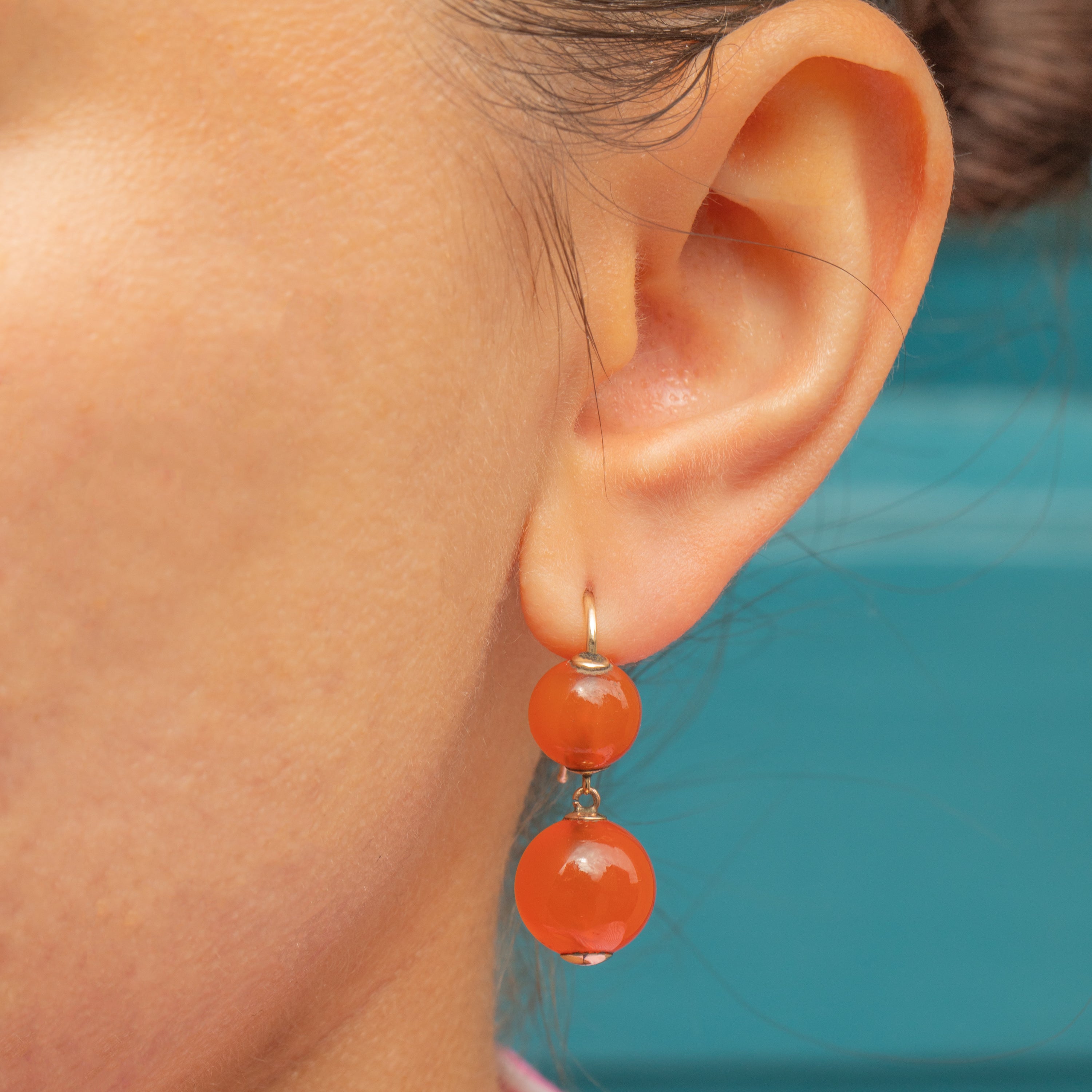 These peachy delights are endlessly satisfying, with their smooth Carnelian orbs swaying gently as they suspend from your lobes. The vibrant ornage Carnelian spheres are beautifully complemented by the buttery 9ct Gold, creating an elegant pair for everyday or occasion wear.
