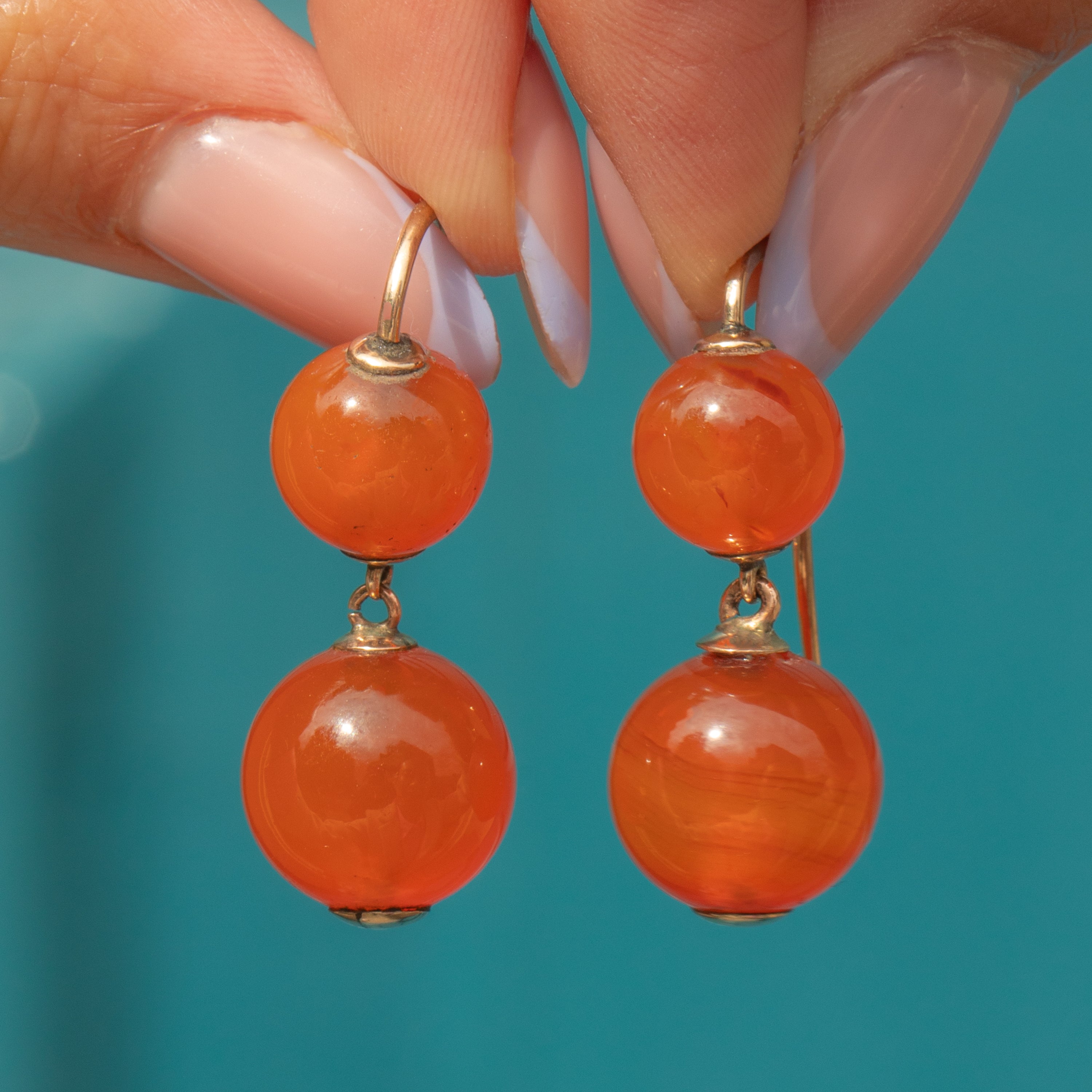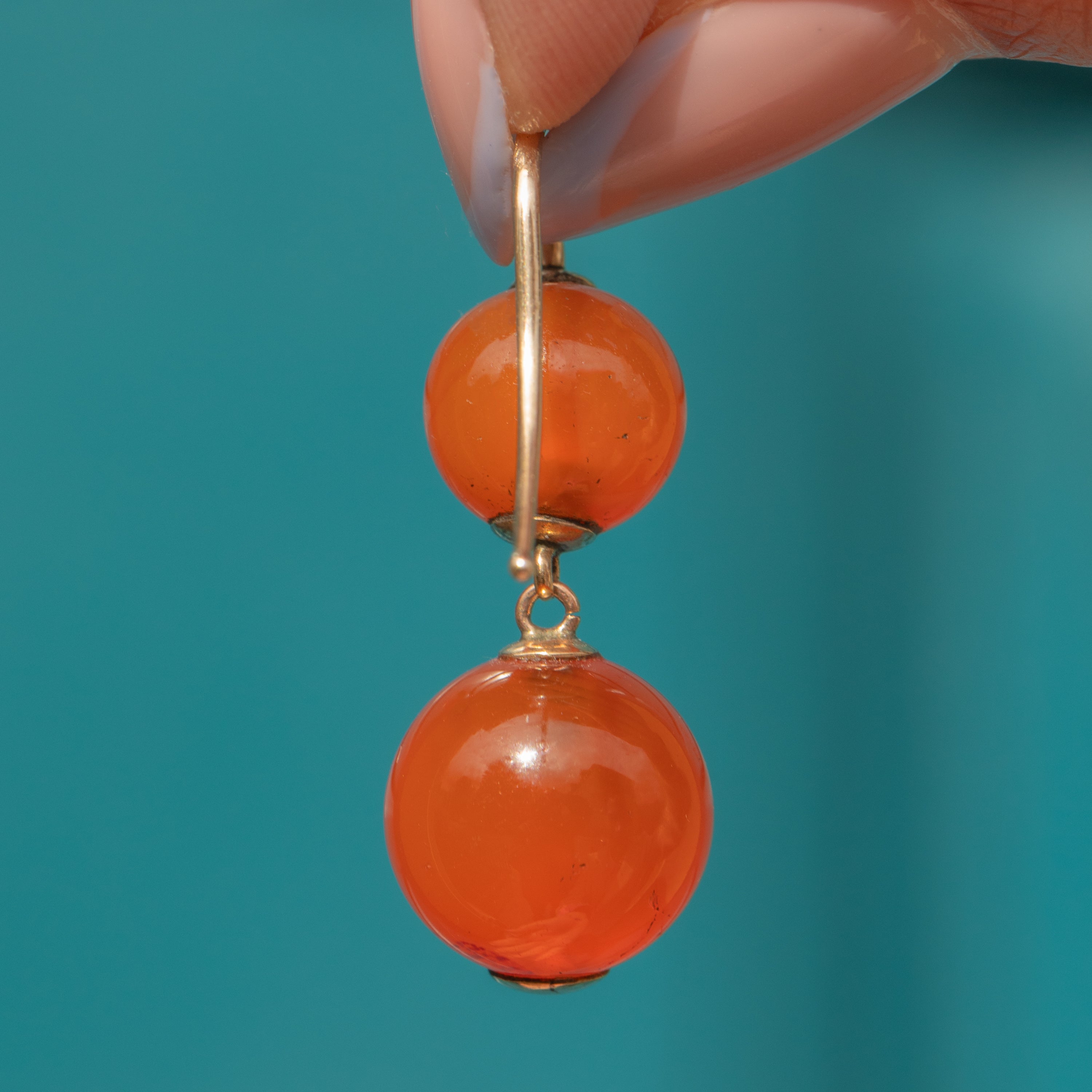 VERY GOOD-EXCELLENT: These antique 9ct Gold Carnelian drop earrings are in fantastic condition. The Carnelian beads are smooth and secure, with only mild wear commensurate with age. The Gold is radiant and the hooks are robust, promising years f wear and enjoyment!
