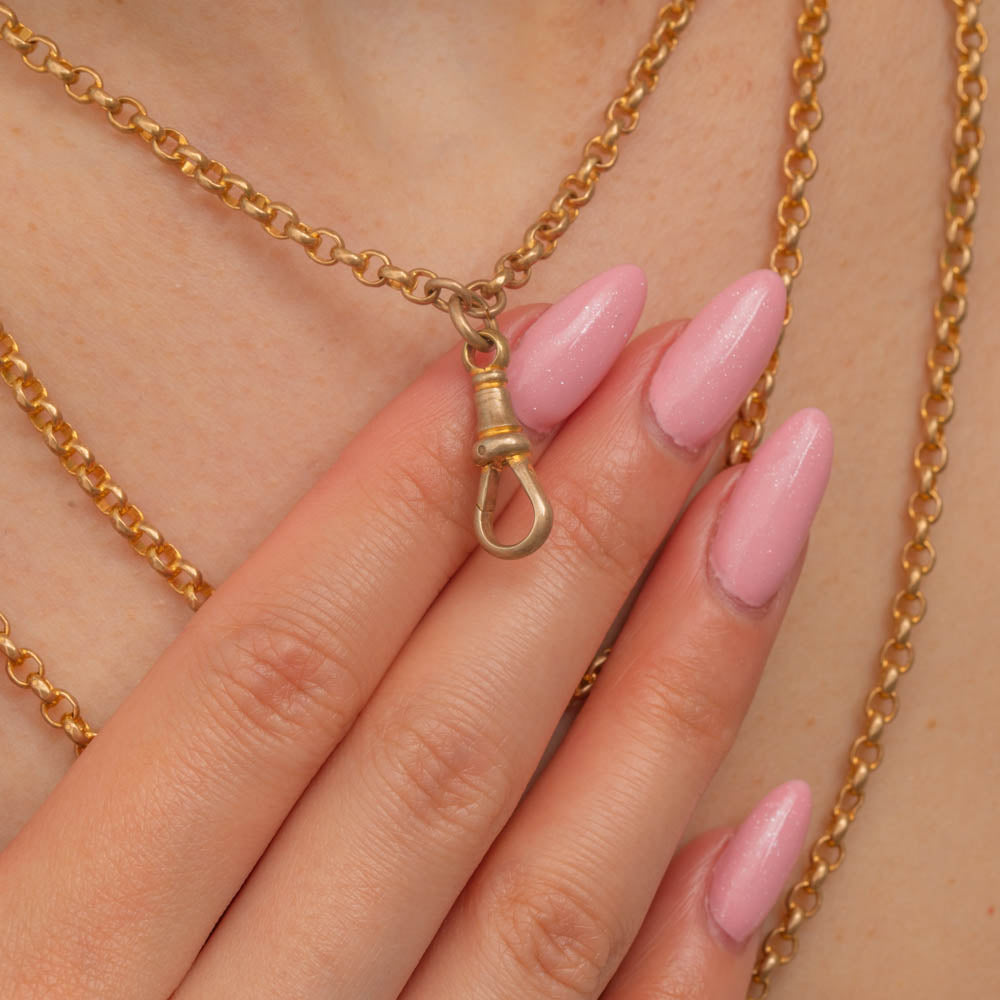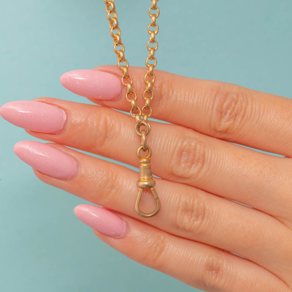 VERY GOOD: This antique 9ct Gold cased faceted longuard chain is in very good condition! The links are all securely interlinked, with a lovely honey hue throughout. The dog-clip shows some slight discolouration near the base of the clip, but this doesn't affect her functionality at all! The links of the chain are all soldered with no clasp, meaning you can wrap this chain around her to the desired length. A versatile antique belcher chain that is set to become a staple within your collection!