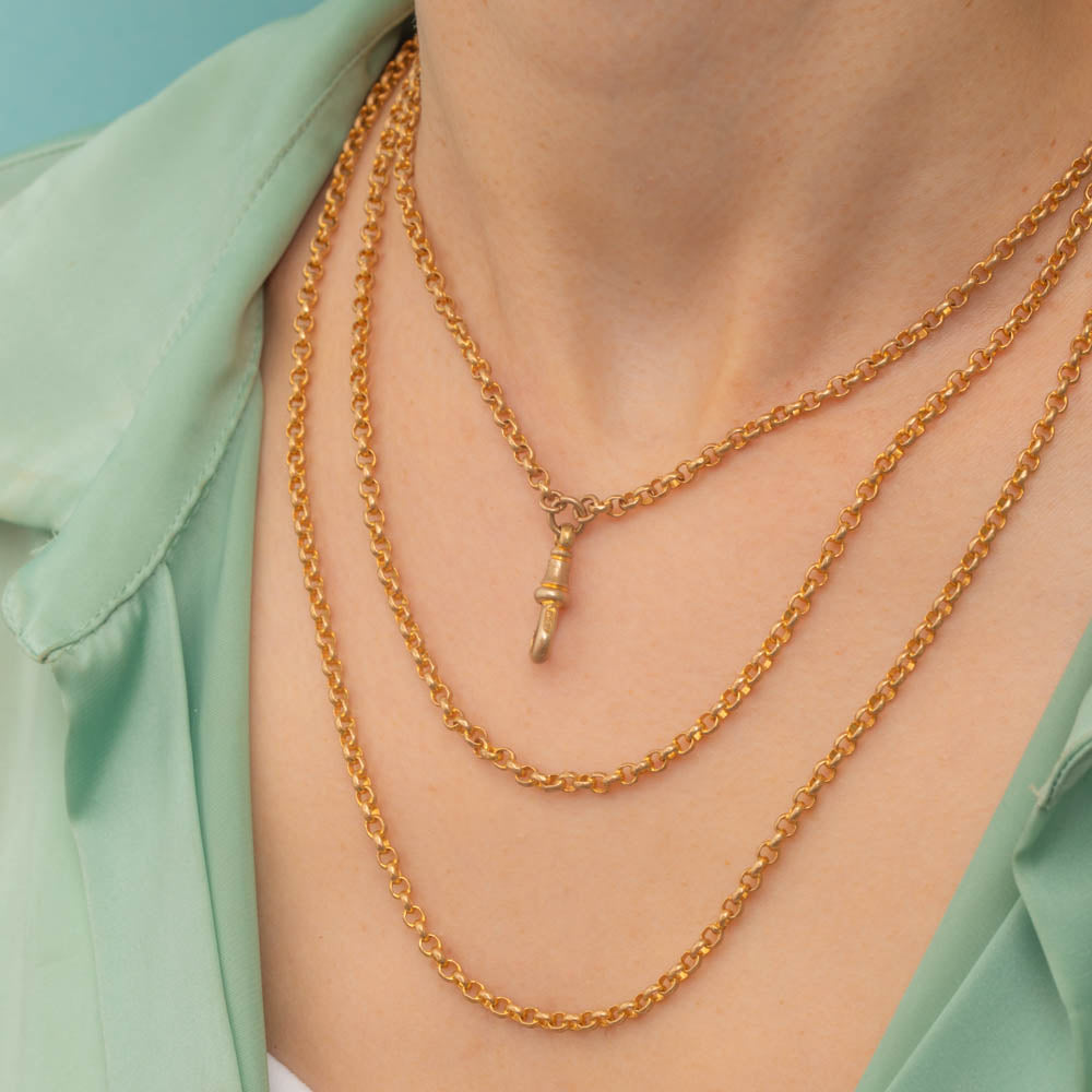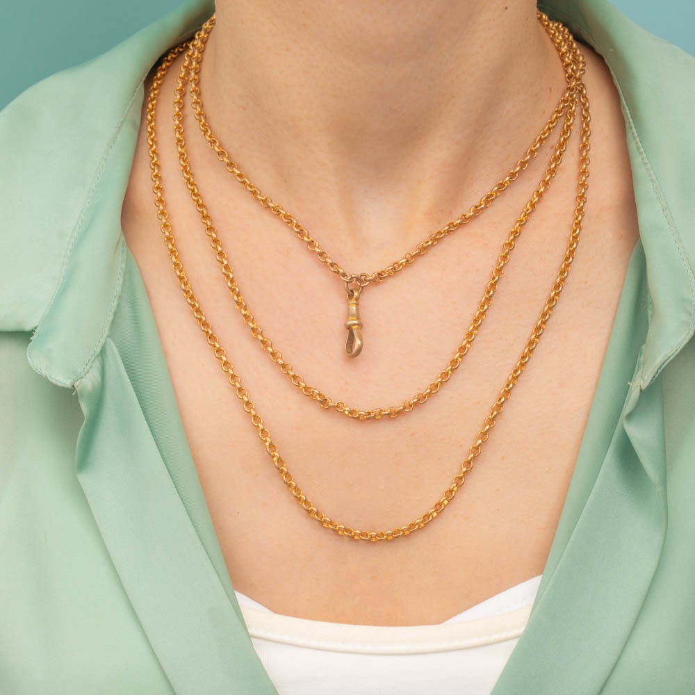 Measuring 56" long, this Gold cased longuard chain can be wrapped around your neck twice for a layered look, and you can even attach a charm to the dog-clip! This antique chain gives you the look of solid Gold for a fabulous price, and no one will know the difference!