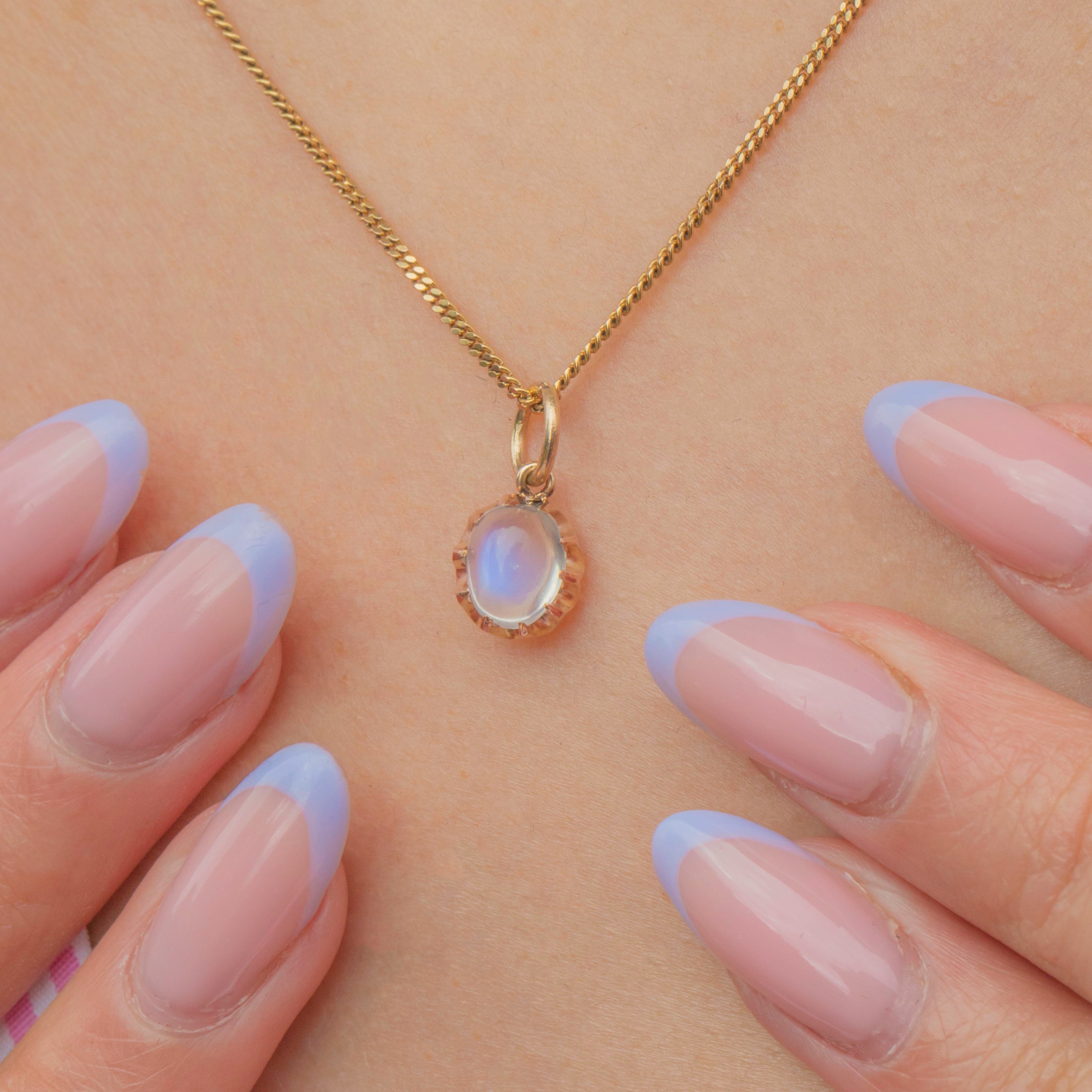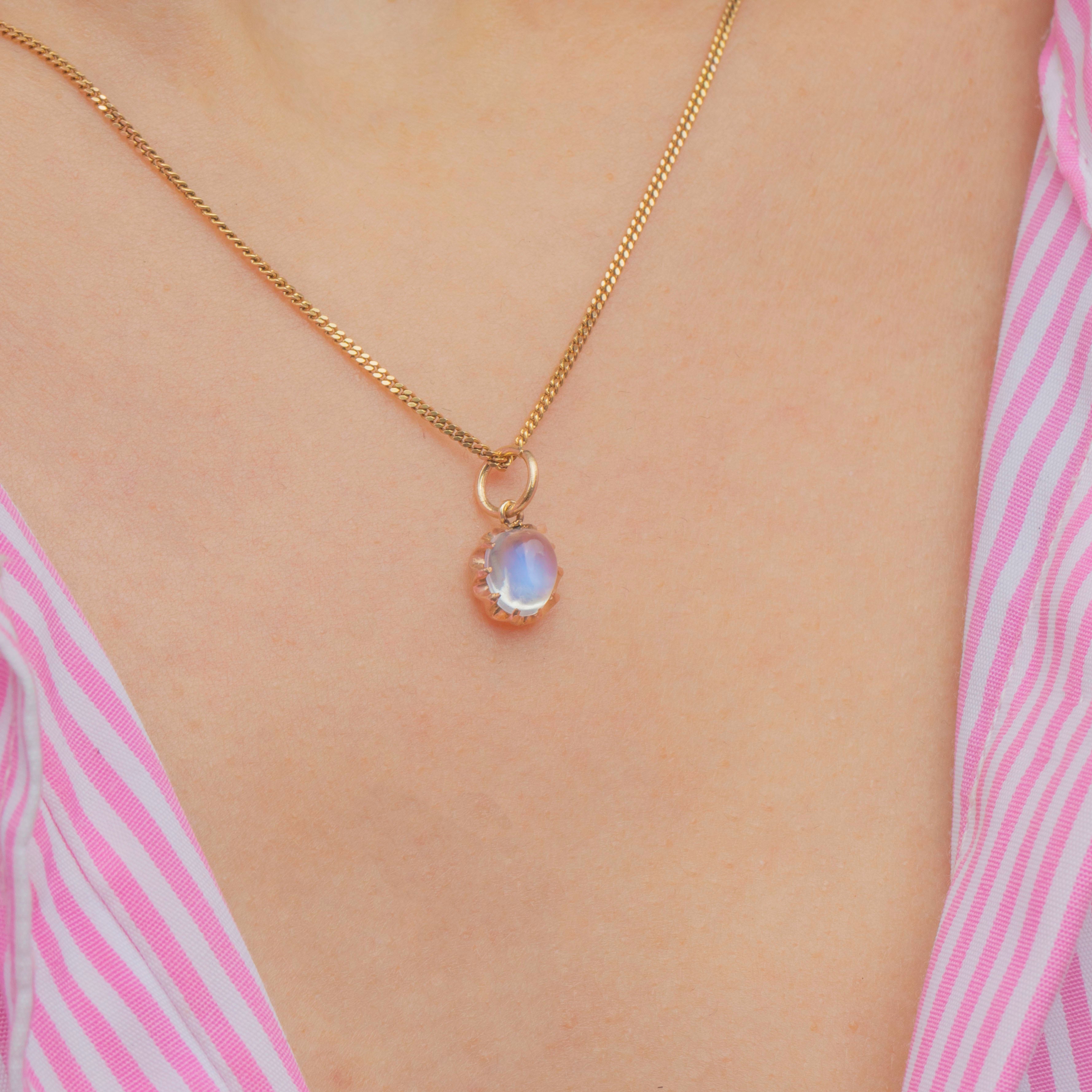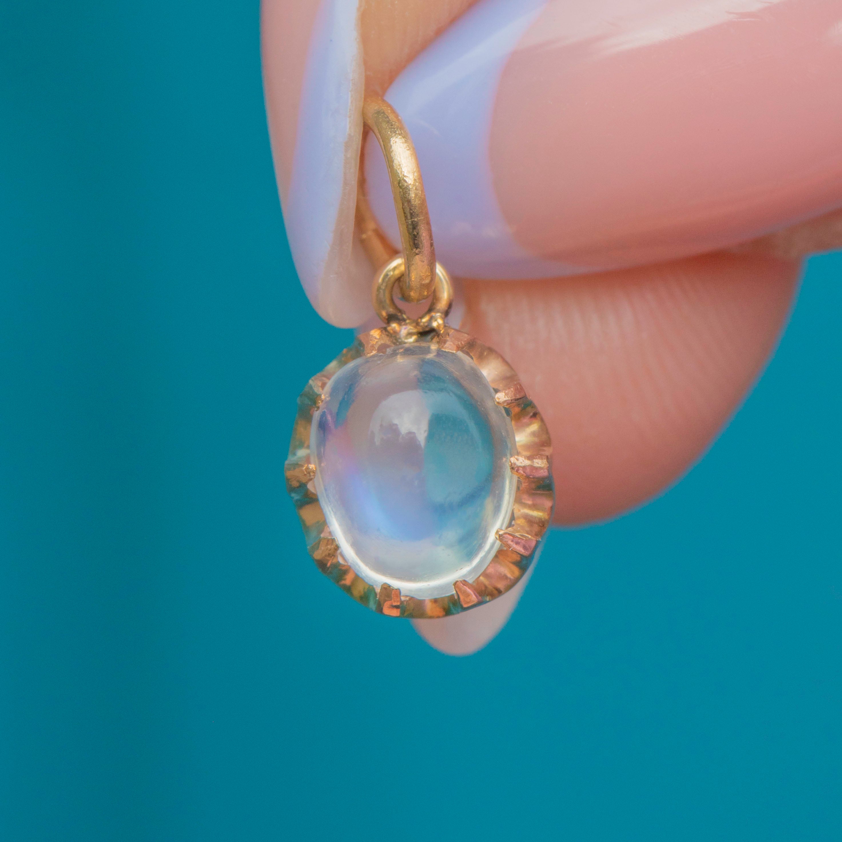 VERY GOOD: This Victorian 9ct Gold Ceylon Moonstone charm is in very good condition. The Moonstone is radiant and set securely within her claw settings. There are some small nibbles to the Moonstone, though this is commensurate with age and only visible under close inspection. With a securely soldered jump ring, you can wear this antique charm with utmost confidence!
