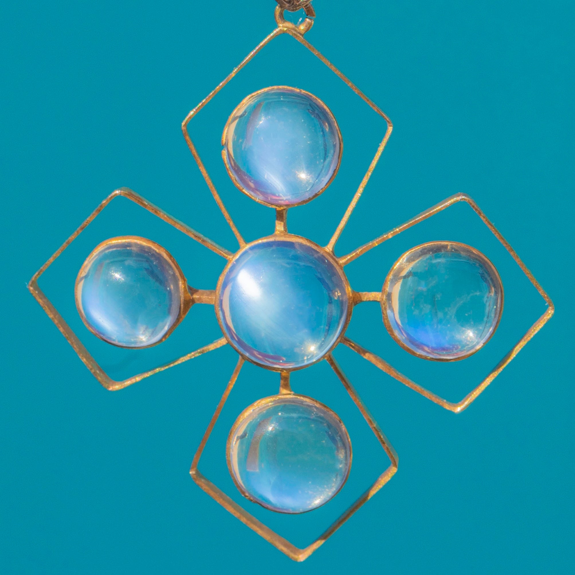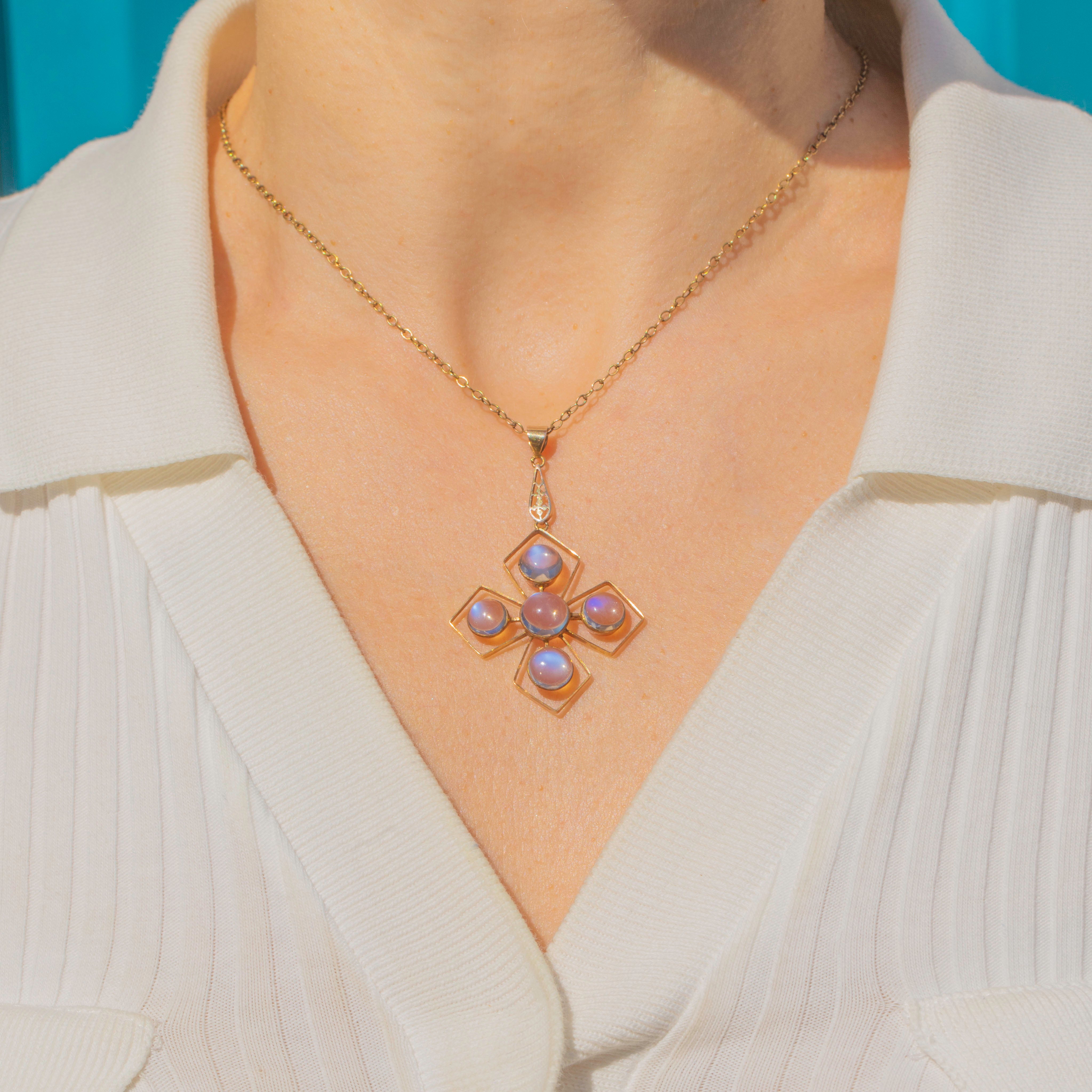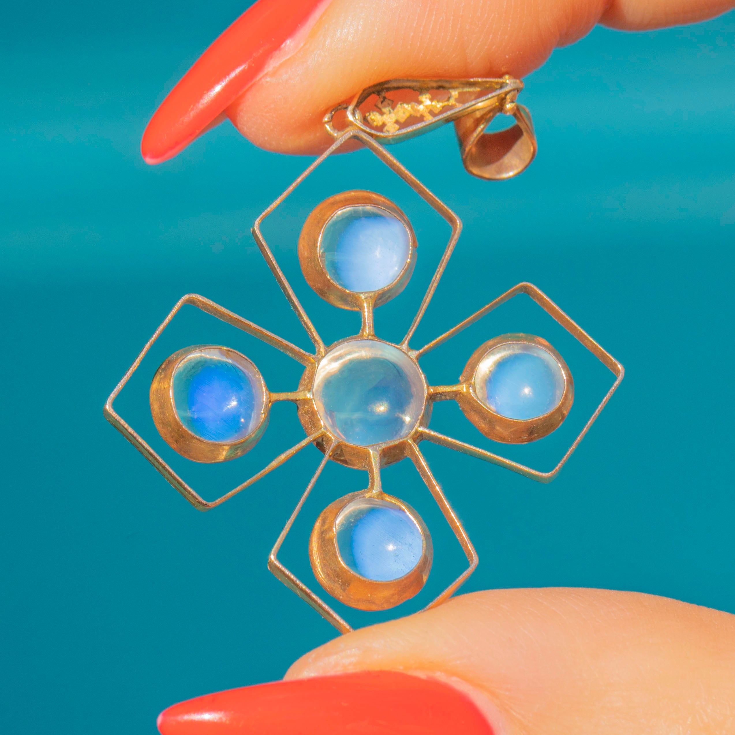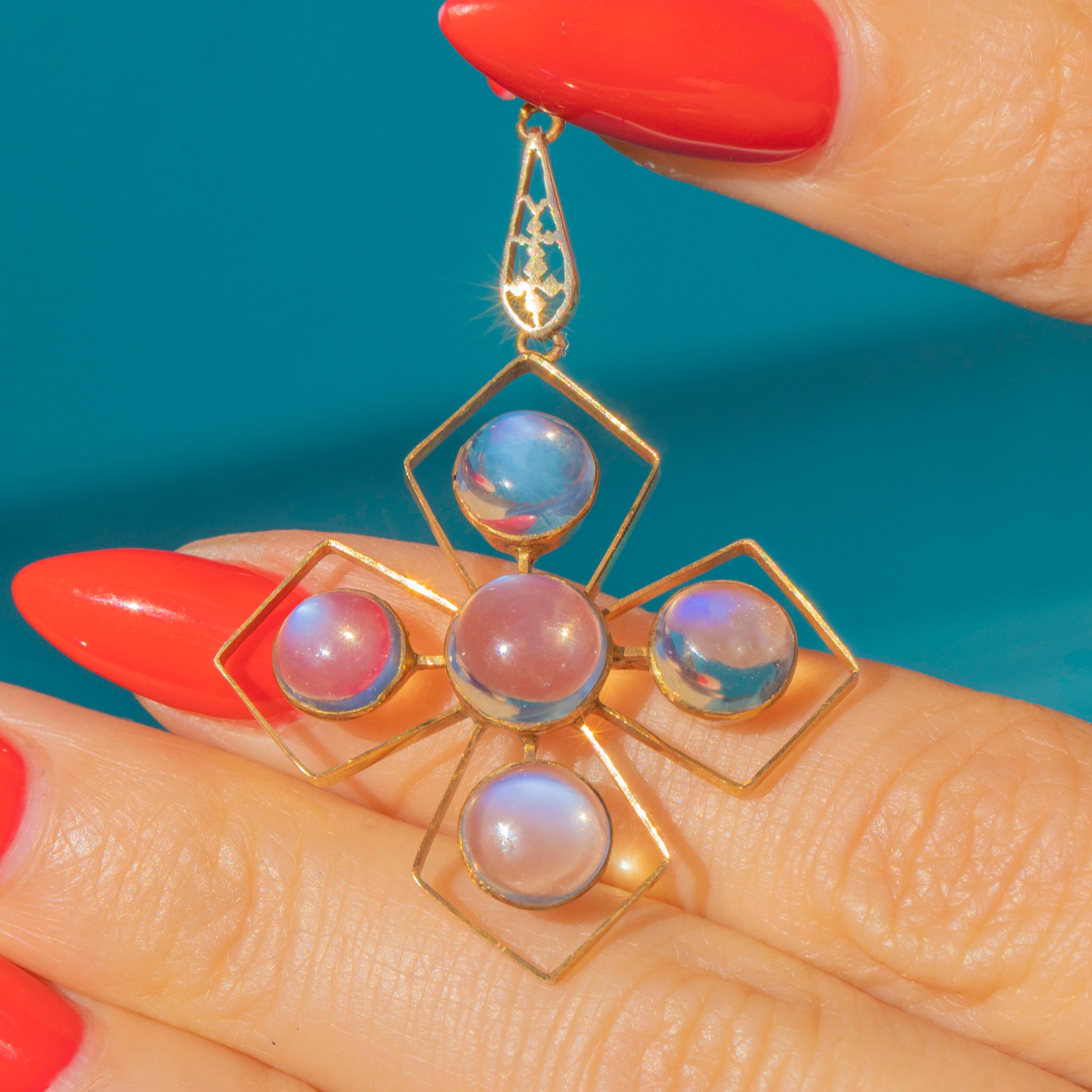 Crafted from buttery 9ct Gold, she features five iridescent Ceylon Moonstones, each boasting a gorgeous silvery blue adularescence as they catch the light. The Moonstones are set within geometric settings and complete with an elongated bale, making this pendant an exemplar of Victorian craftsmanship.