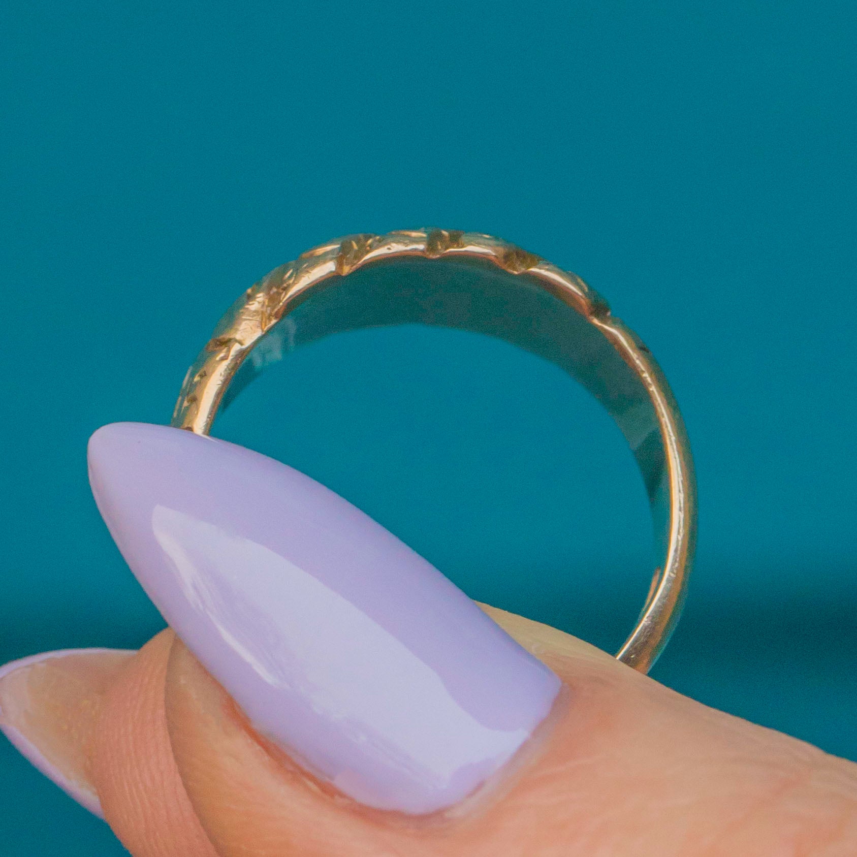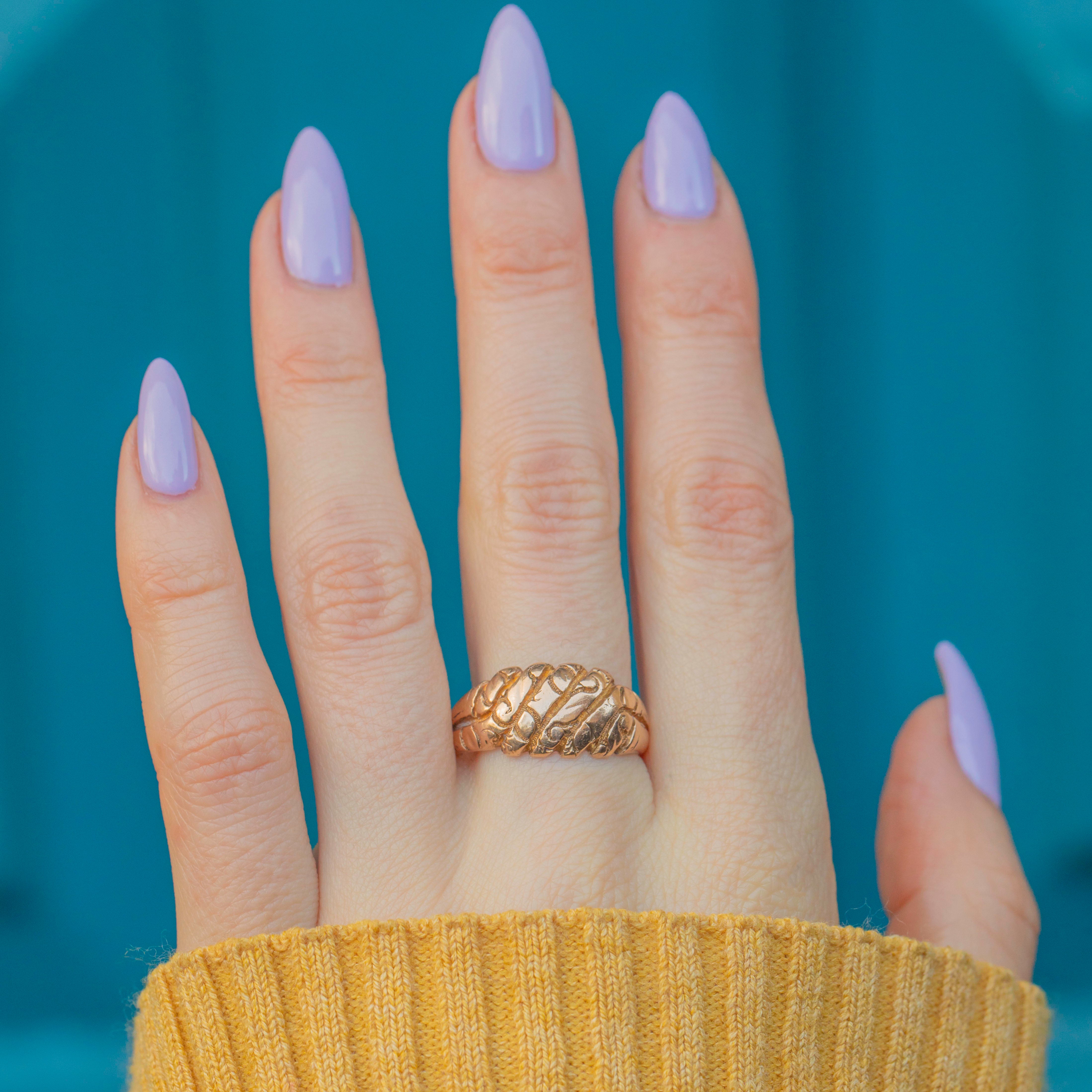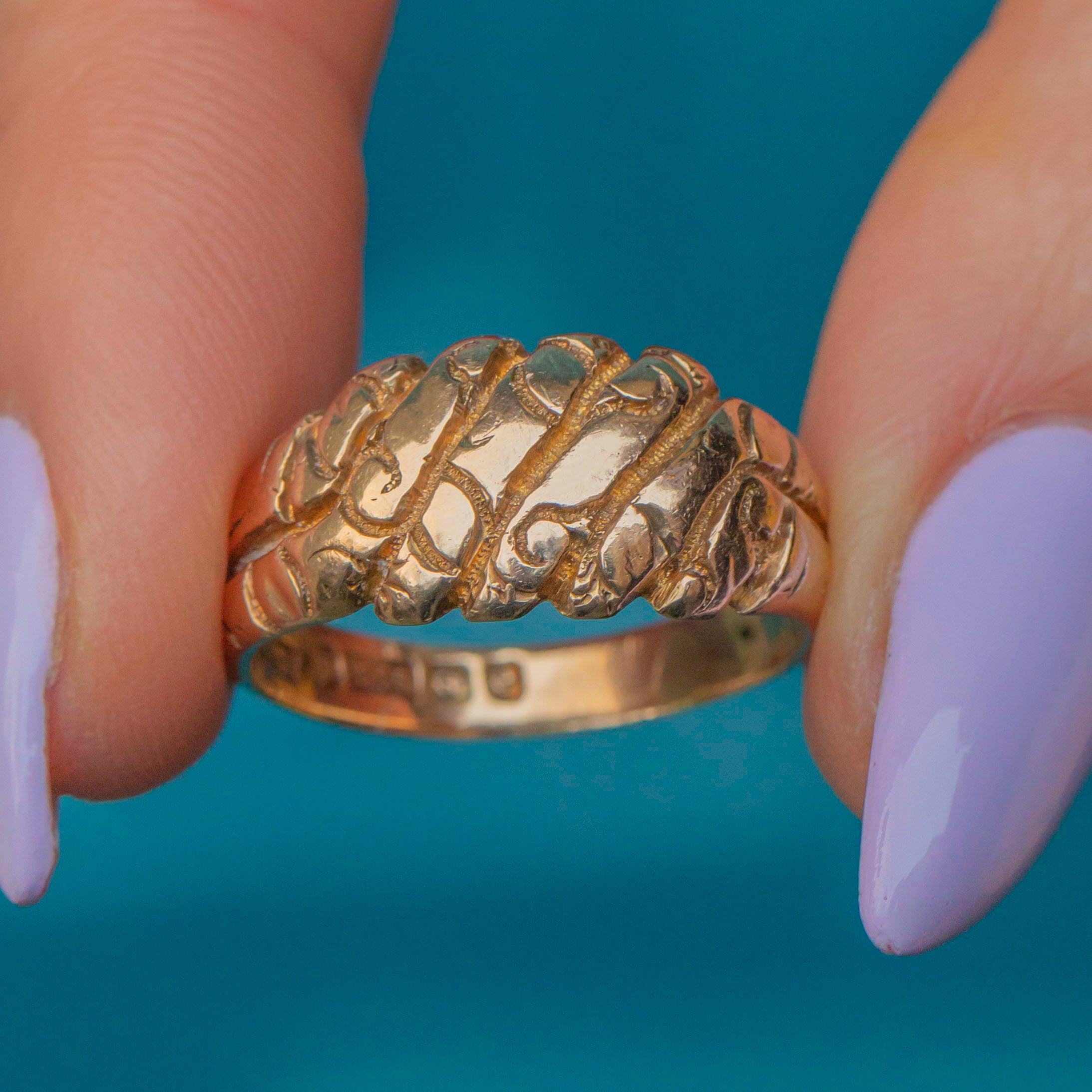 Crafted from over 5 grams of solid 9ct Gold and hallmarked to 1904, this chunky Edwardian ring will be something you reach for time and time again! Its low profile makes it perfect for everyday wear and its bold engraved front will bring texture to your ring stack.