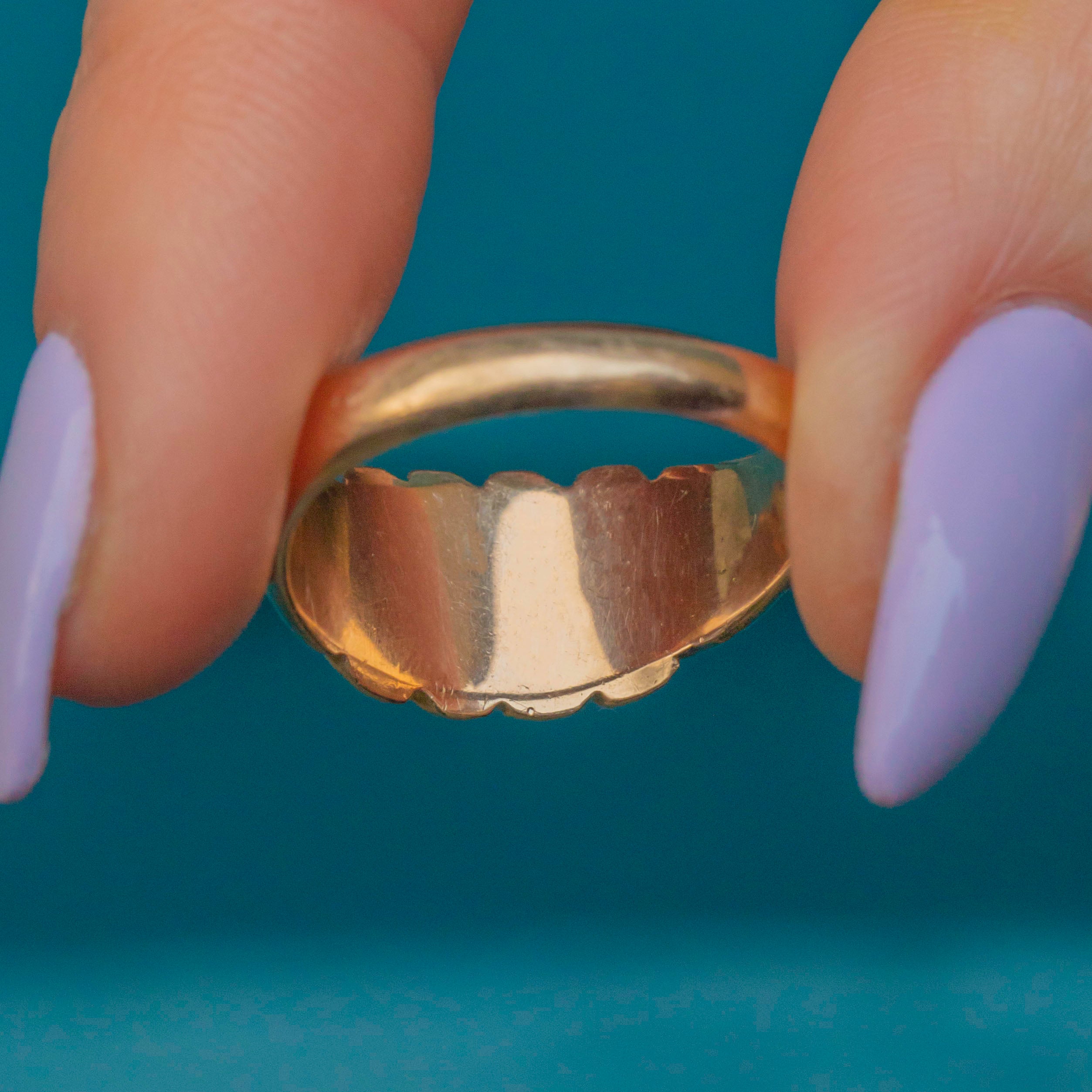 VERY GOOD. This antique 9ct Gold chunky engraved ring is in very good overall condition! The front has a timeless design that you can't help but love, and the inside of the band has a full set of hallmarks. There is a resize mark visible on the back of the band, but when you wear it, it becomes very discreet. With plenty of wear potential, this Edwardian Gold ring will become a staple in your antique jewellery collection!