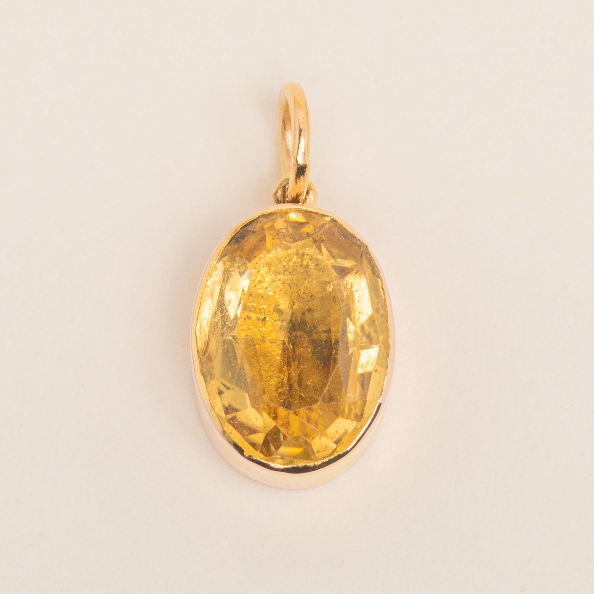 VERY GOOD. This antique 9ct Gold Citrine charm is in very good condition! The Citrine sits securely within the bezel setting, flaunting a fabulously faceted form. The bezel setting is smooth and although there is some slight variation in the tone of the Gold, she has a rich saturation throughout. The D hoop & jump-ring are soldered slightly off-centre so the Citrine falls at a slight angle, however we find this quite endearing!