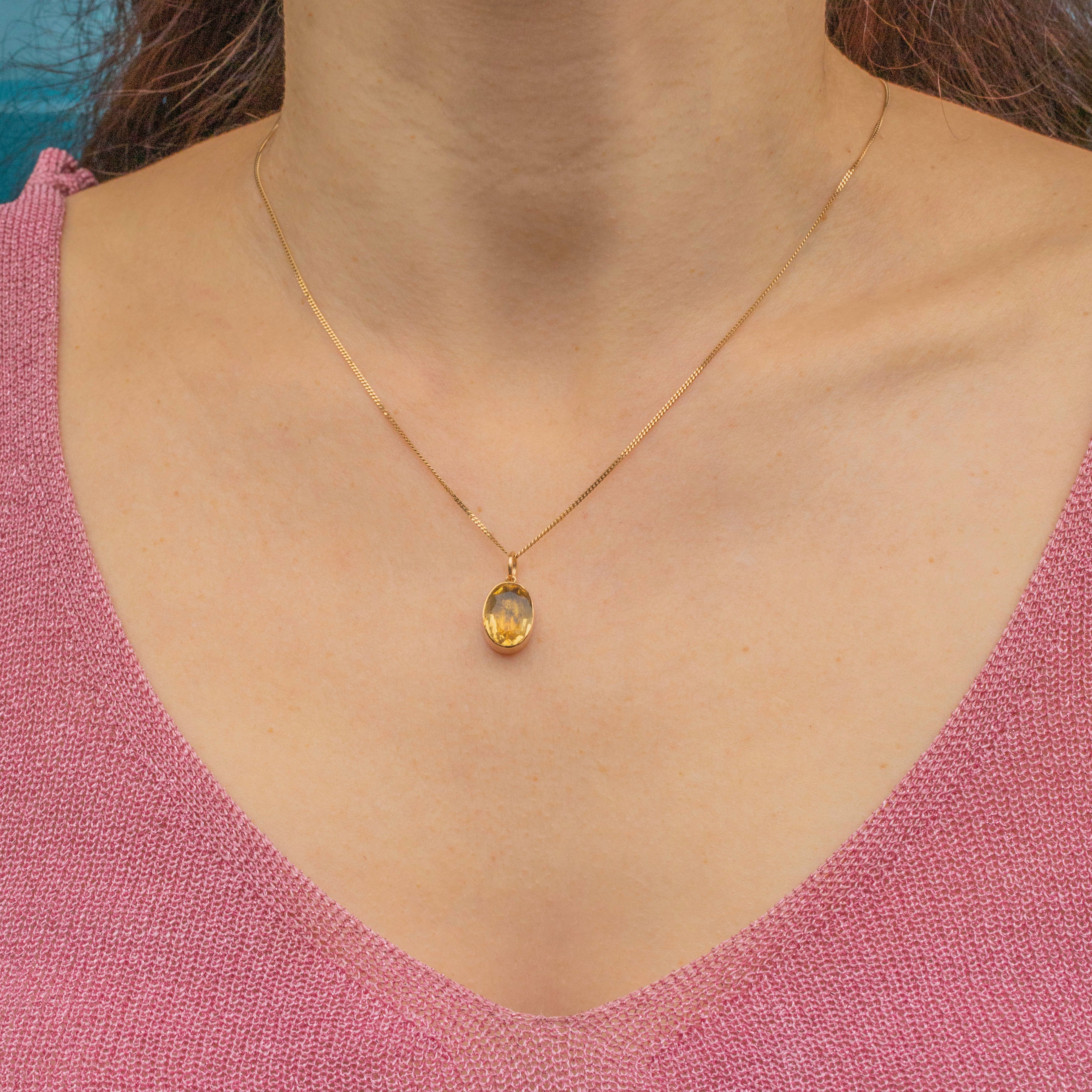 Embraced by a closed-back sun-kissed 9ct Gold bezel setting, this Victorian pendant will sit comfortably against your décolletage whilst radiating warmth. You will brighten up any room you enter with this antique Citrine charm adorning your neck!