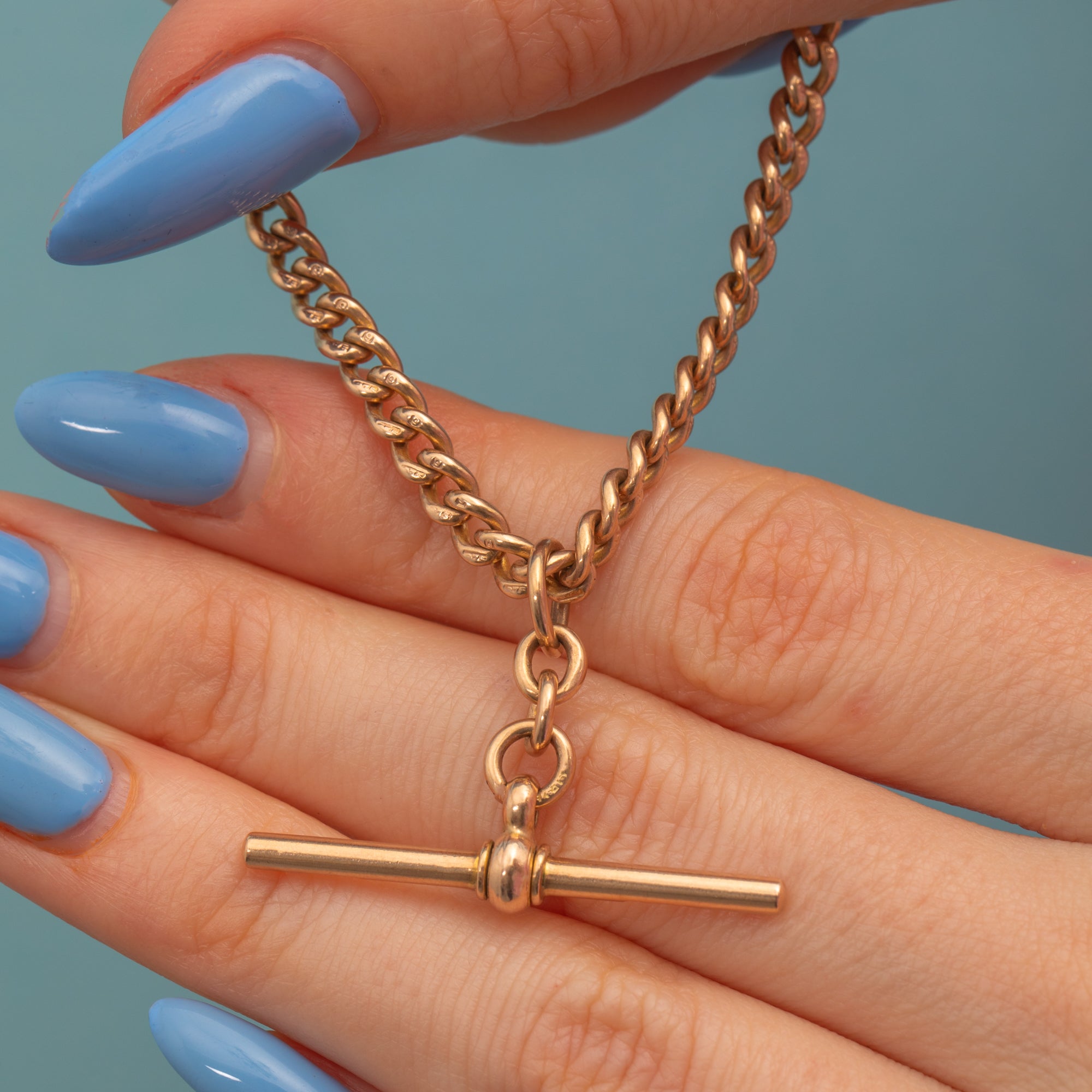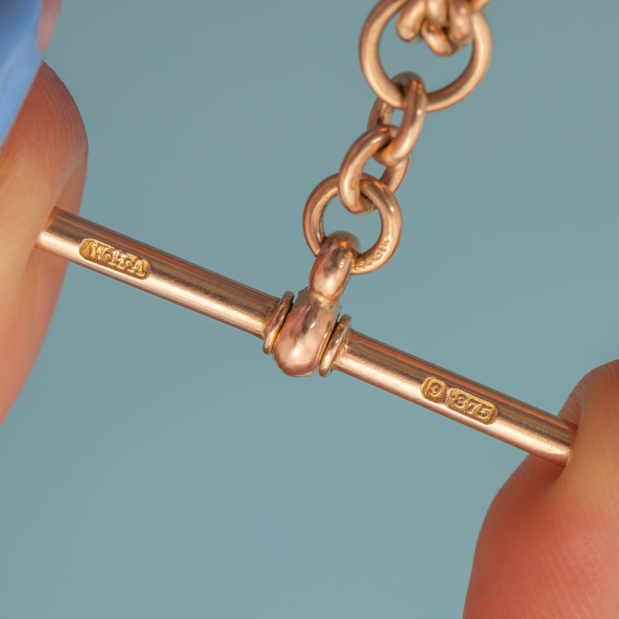 Featuring a stamped solid antique 9ct Gold T-BAR, a truly sumptuous and scrumptious piece, this Albert chain will instantly become your grab-and-go chain for an elevated and luxe finish. This gorgeous unique chain is fastened by two rare matching dog clips, both hallmarked "VHM"- how marvellous!