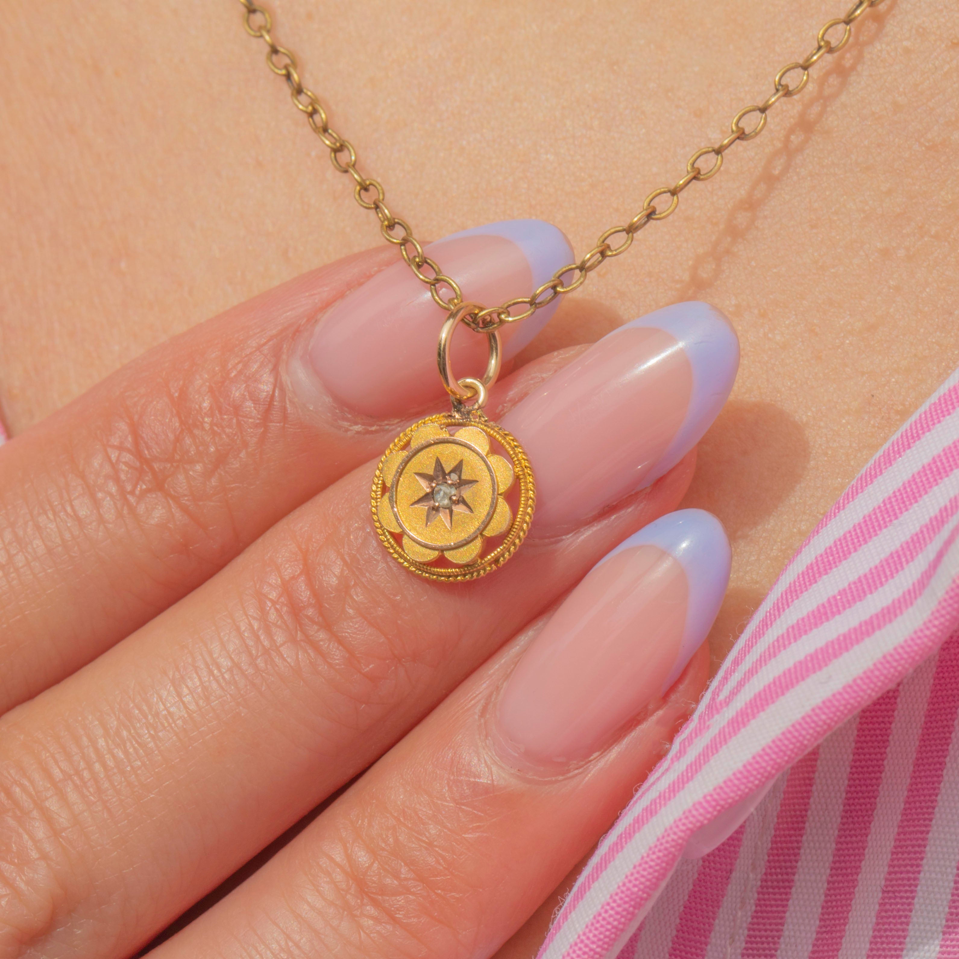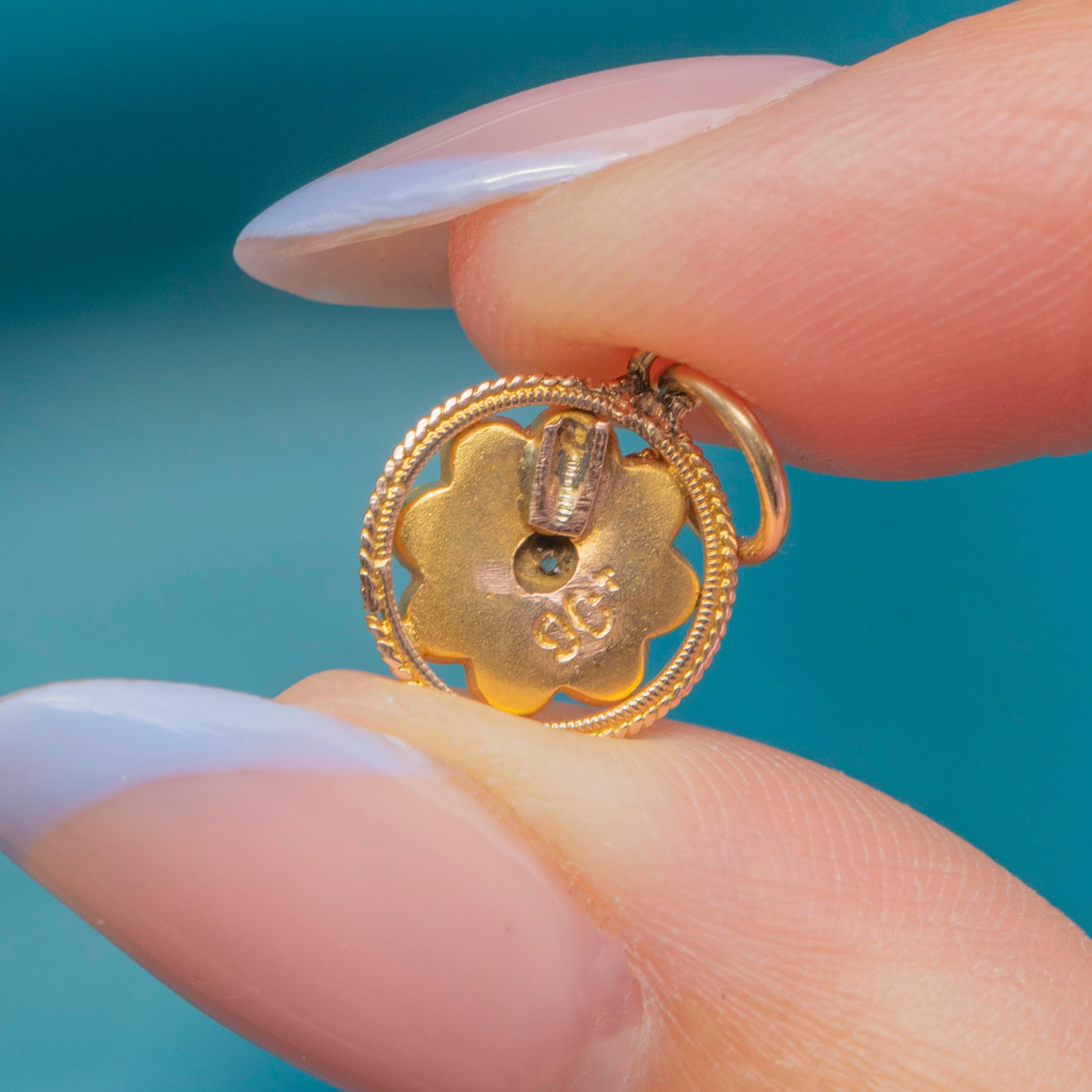 Crafted from buttery 9ct Gold, this antique charm is crafted into a dainty floral motif and adorned with a scintillating rose-cut Diamond in her centre. The Diamond is displayed within bold star settings, adding a touch of celestial charm.