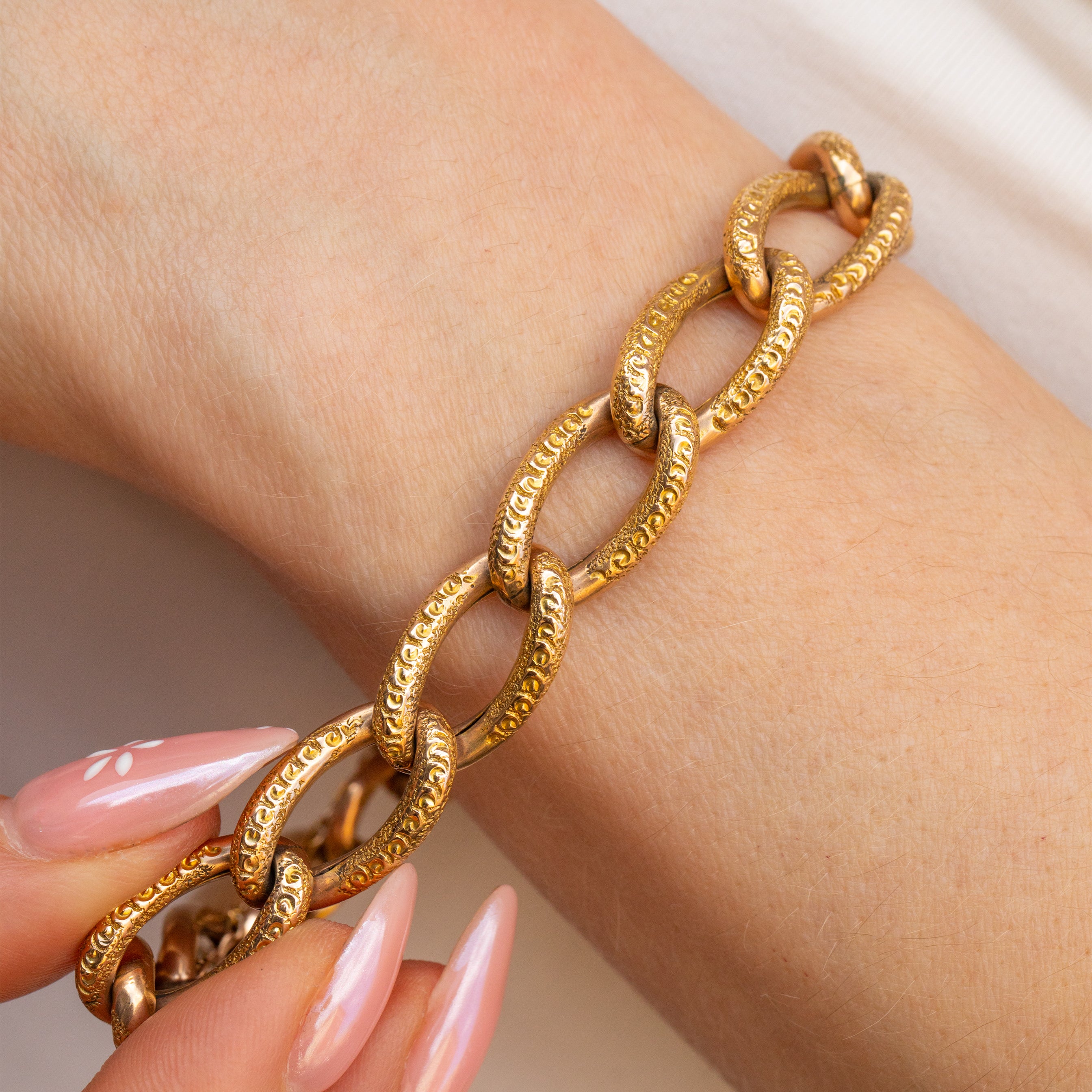 EXCELLENT. This antique 9ct Gold engraved curb link bracelet is in excellent condition. The links and padlock are beautifully detailed and the engravings have remained crisp. There are some visible solder marks, from where the links have been securely adjoined, but this isn't noticeable while the bracelet is worn. The bracelet has been finished with a Gold safety chain for extra reassurance allowing you to wear her confidently all day long!