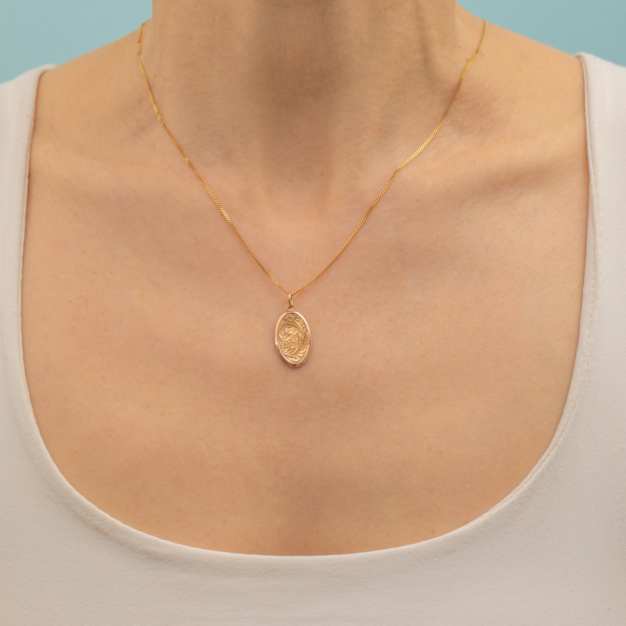This gorgeously crafted antique 9ct Gold engraved disc pendant will make an enchanting addition to your everyday attire! Displaying ornate acanthus leaf details engraved into buttery 9ct Gold, this dainty treasure is the perfect piece to bring some antique luxury to your necklace stack.
