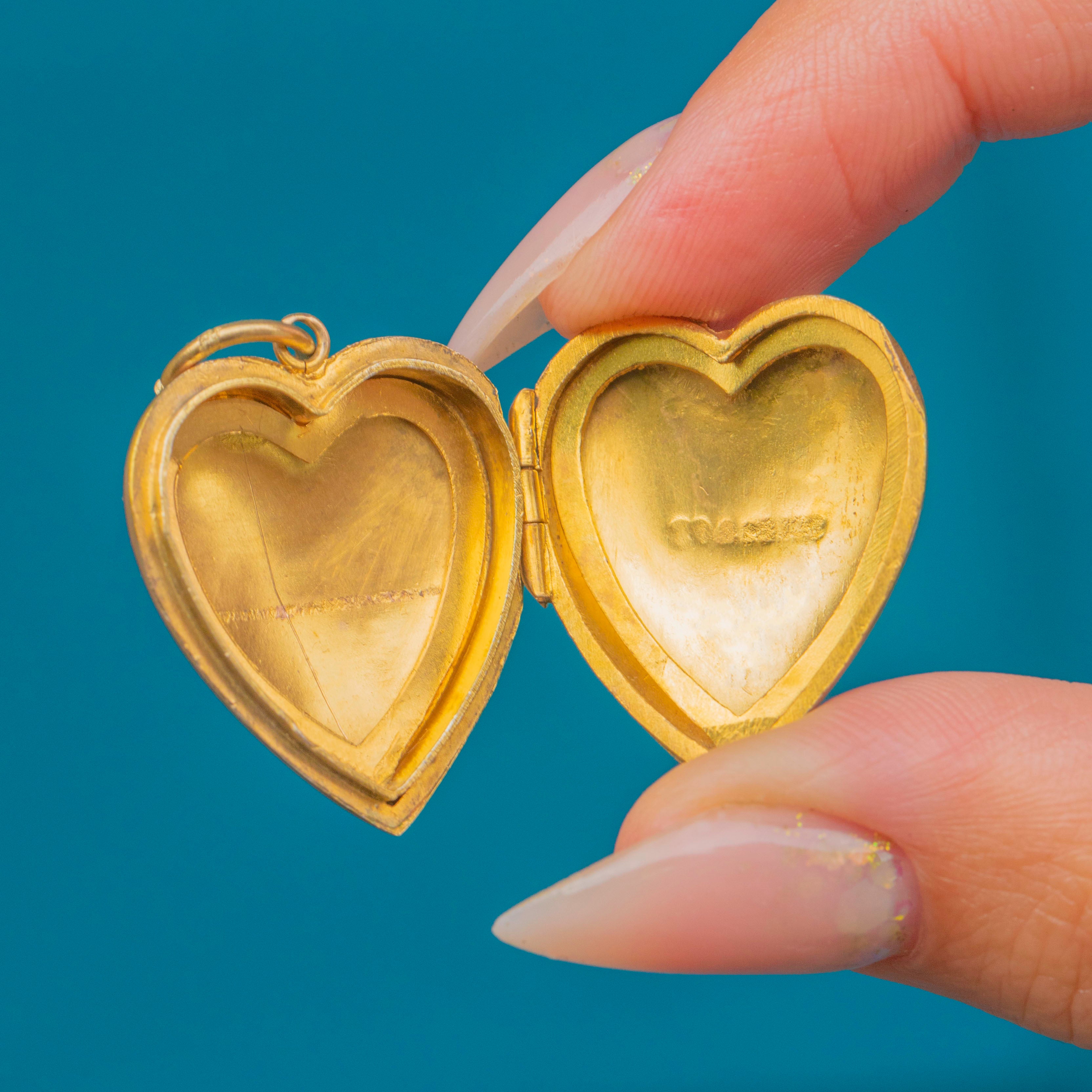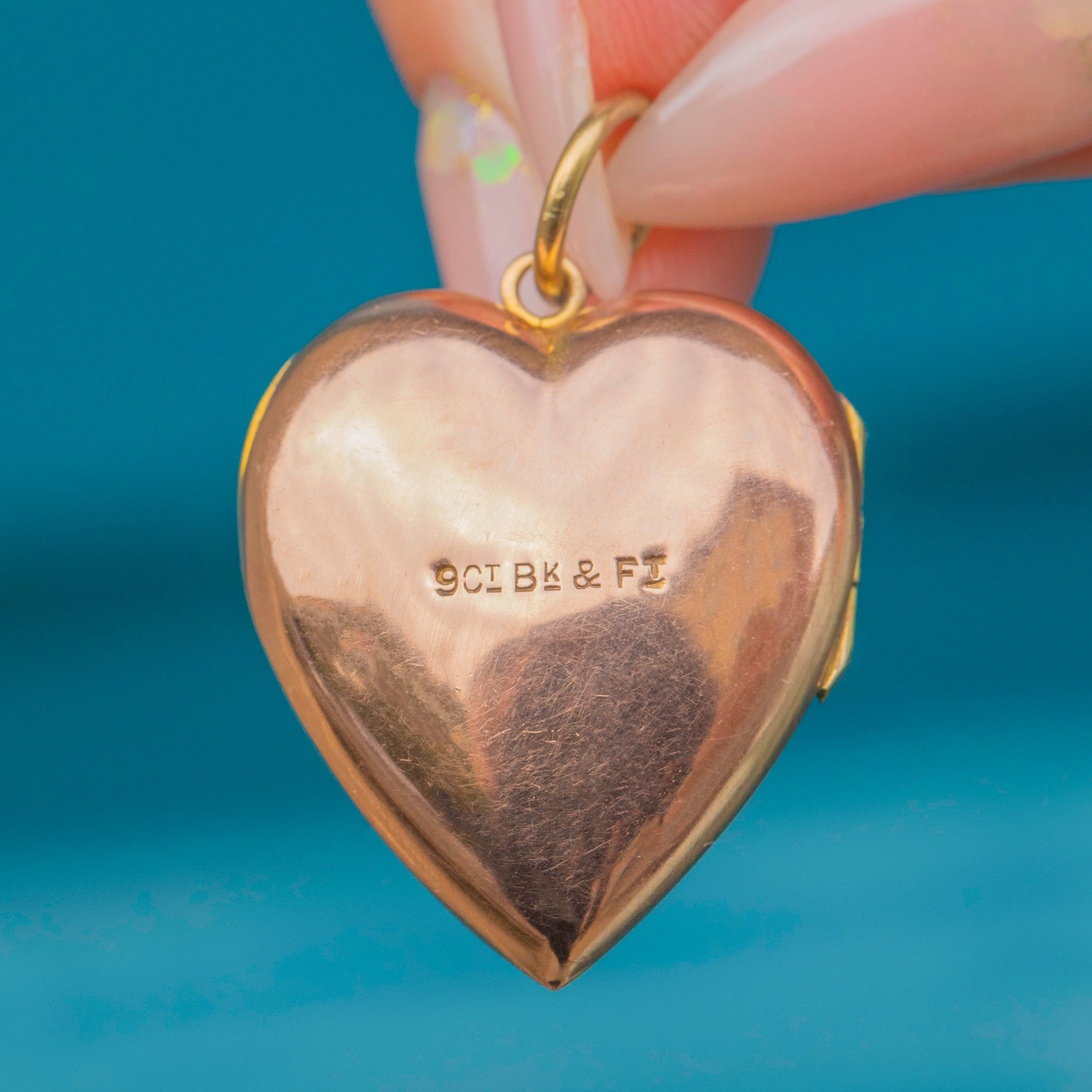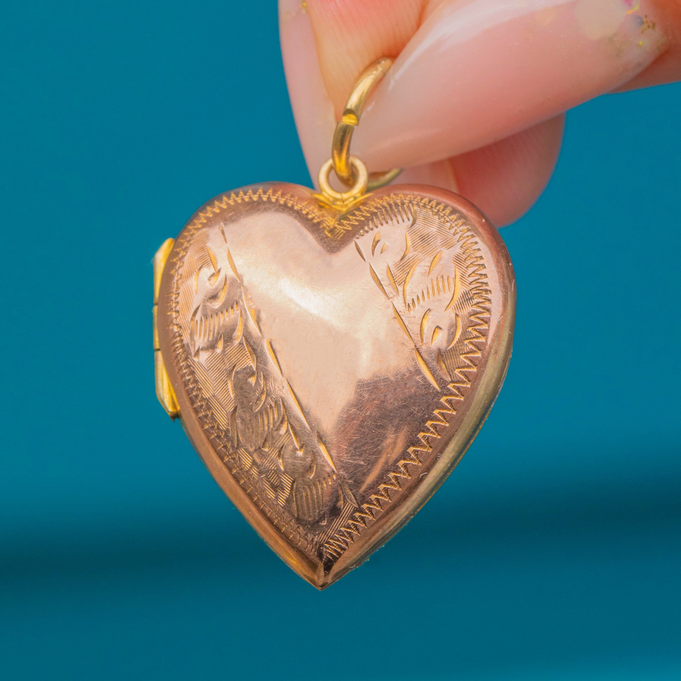 This Edwardian heart locket is a classic piece of sentimental jewellery, crafted in warm 9ct Gold. The front is beautifully decorated with a split panel of smooth polish and hand-engraved foliage, framed with zig-zag detailing around the edges. It opens to reveal two frames inside, perfect for holding cherished photographs.