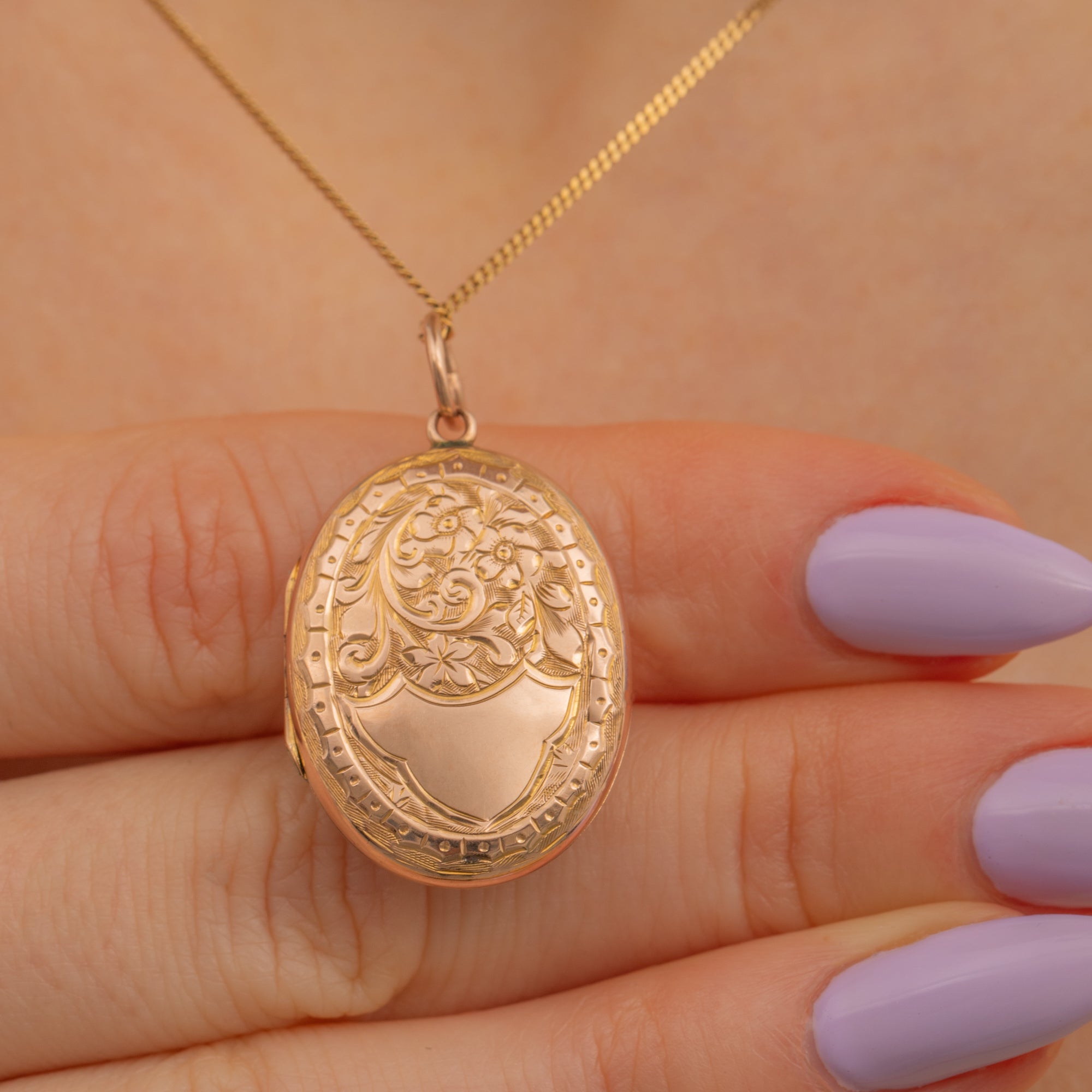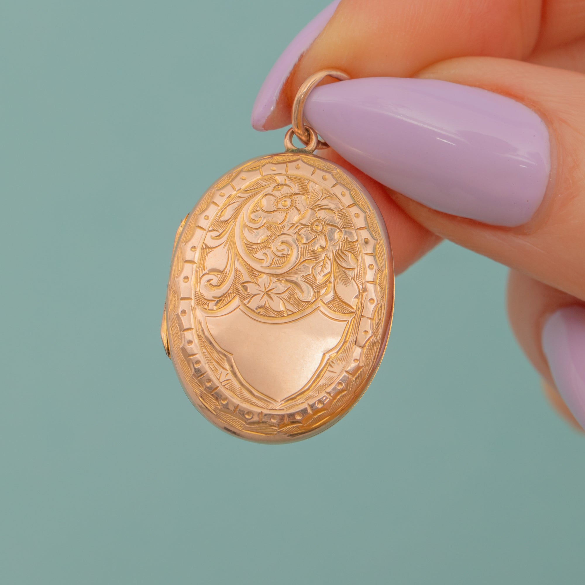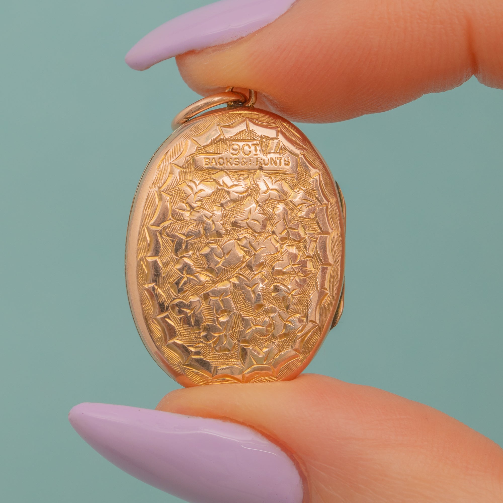 Radiating warmth from her rosy 9ct Gold, this Victorian locket features gorgeous floral forget-me-not and ivy engravings across both sides - quintessential Victorian motifs symbolising ever-lasting love.