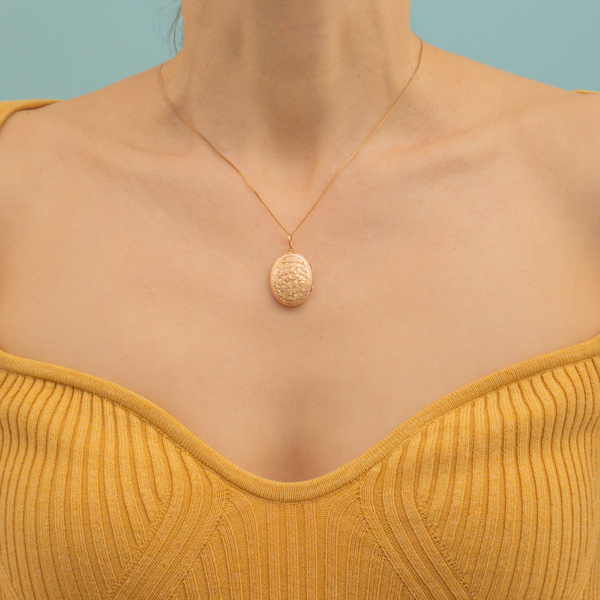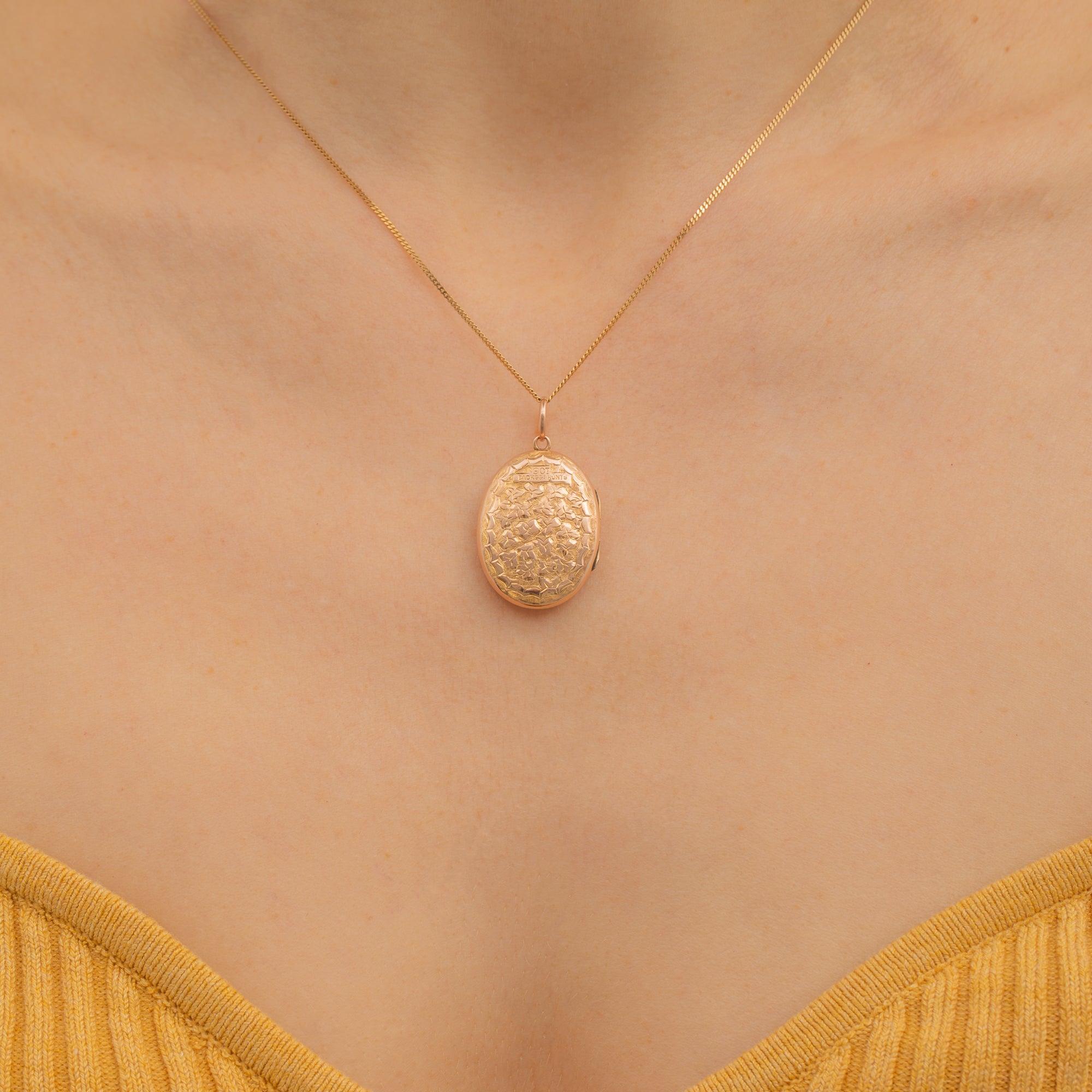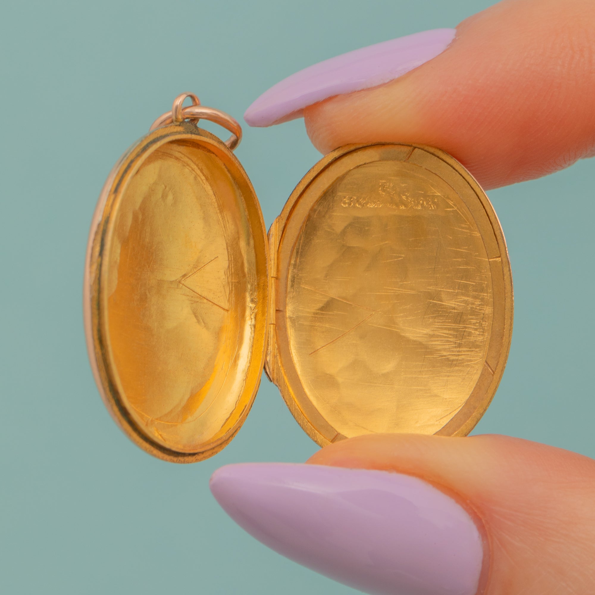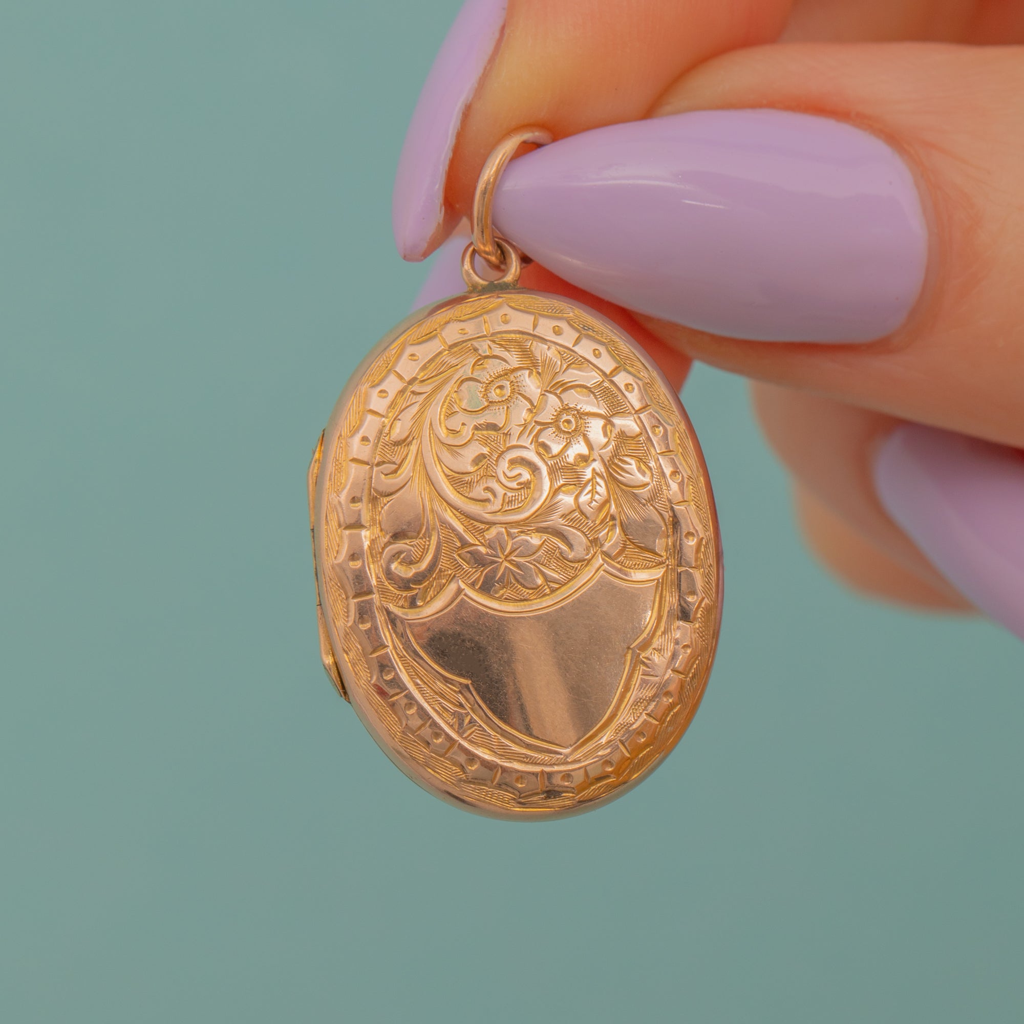 Radiating warmth from her rosy 9ct Gold, this Victorian locket features gorgeous floral forget-me-not and ivy engravings across both sides - quintessential Victorian motifs symbolising ever-lasting love.