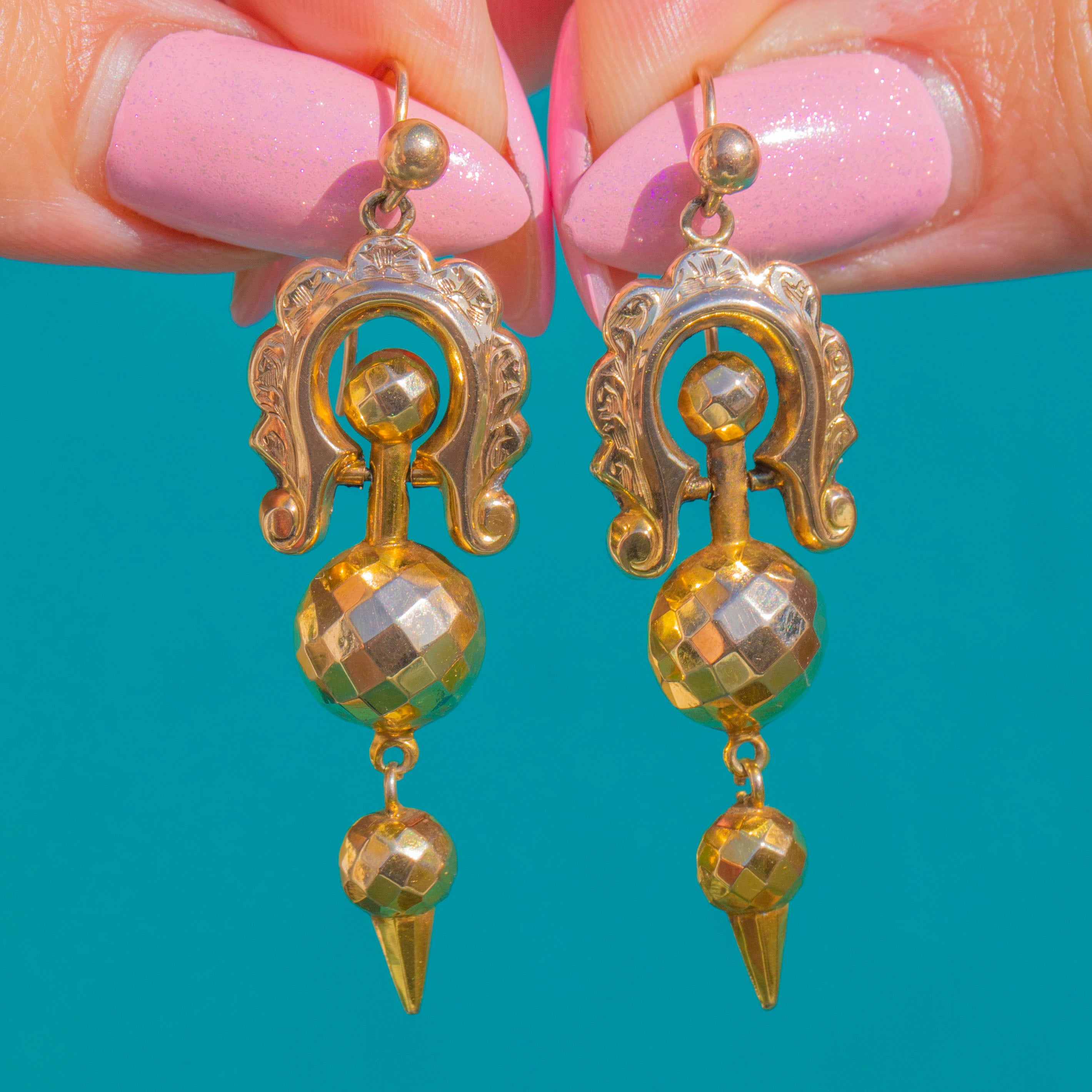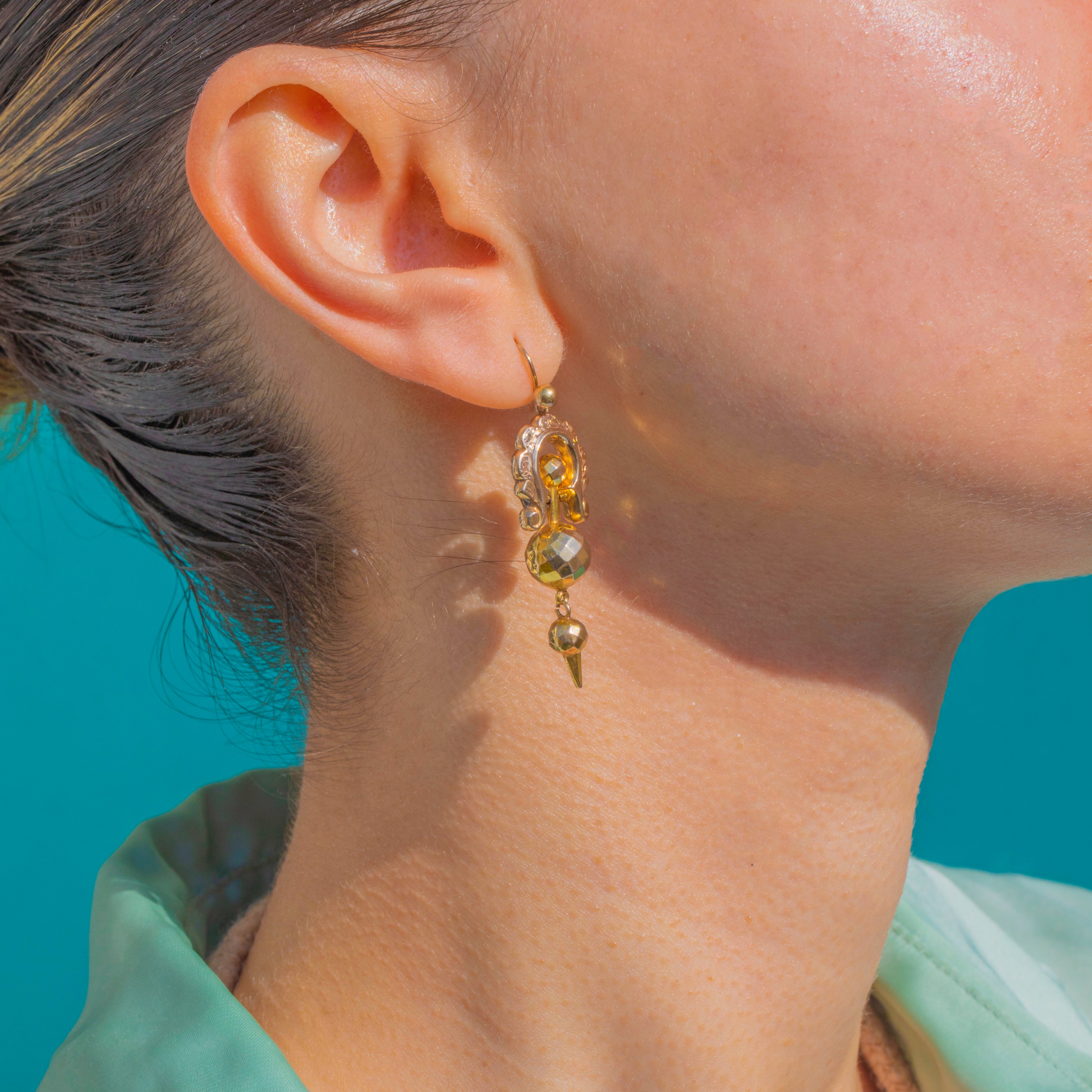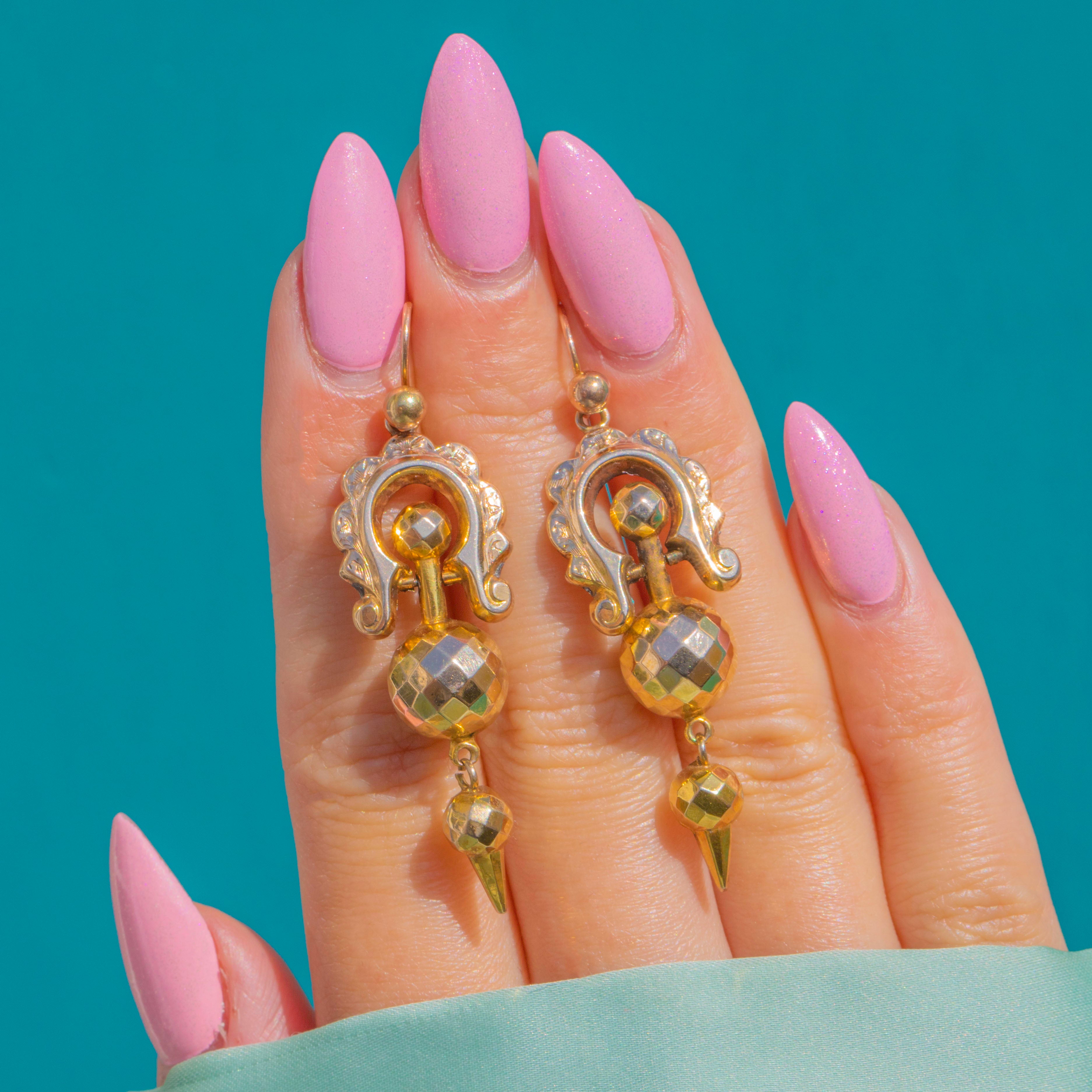 贅沢で彫刻的な美しさを湛えた、Victorian エトラスカン・リヴァイバル ドロップピアス。艶やかな9ctゴールドで仕立てられ、縦に伸びるアーティキュレートシルエットが優雅な動きを生み出します。装飾的なディテールとグラデーションのオーバルモチーフが、フレンチフックからしなやかに揺れます。