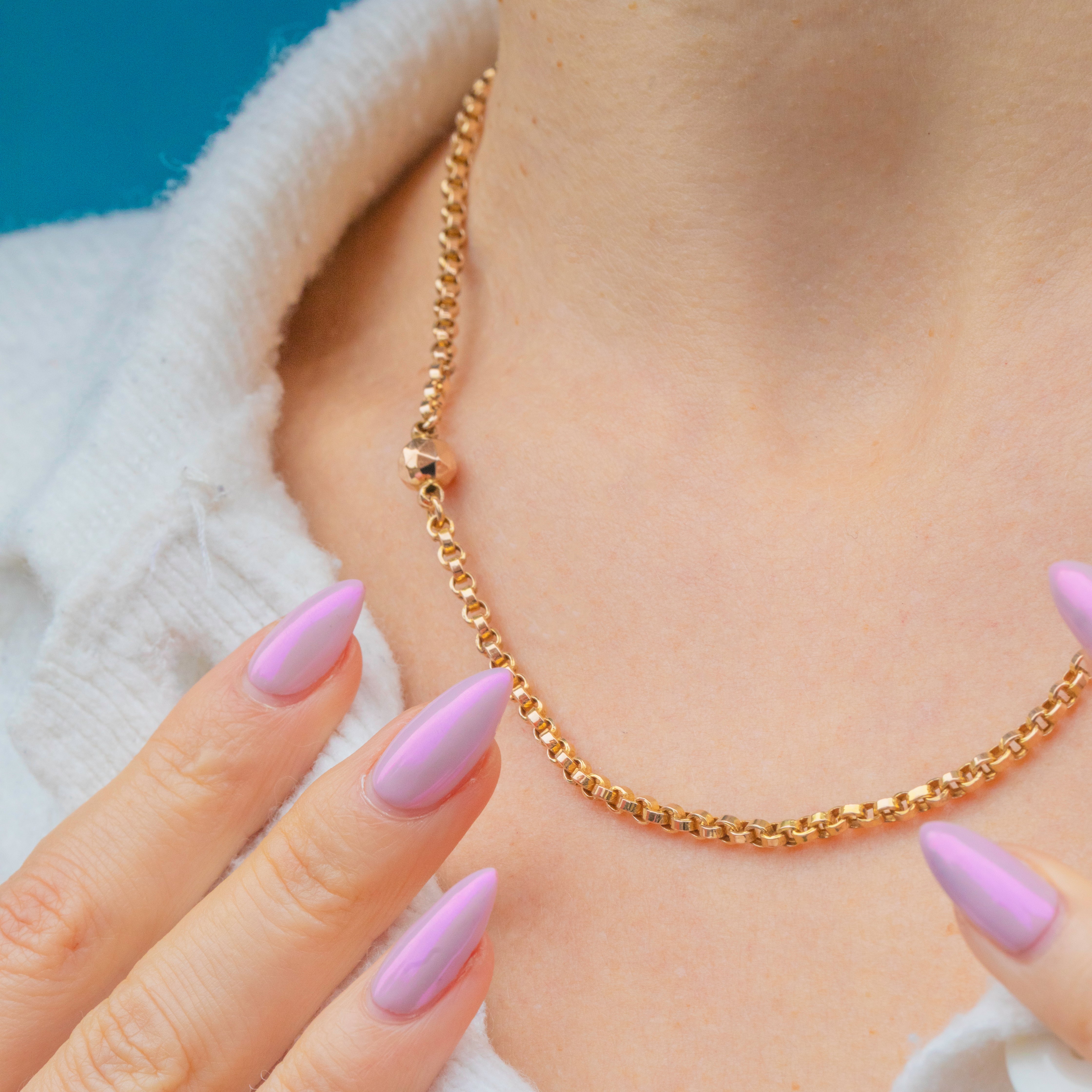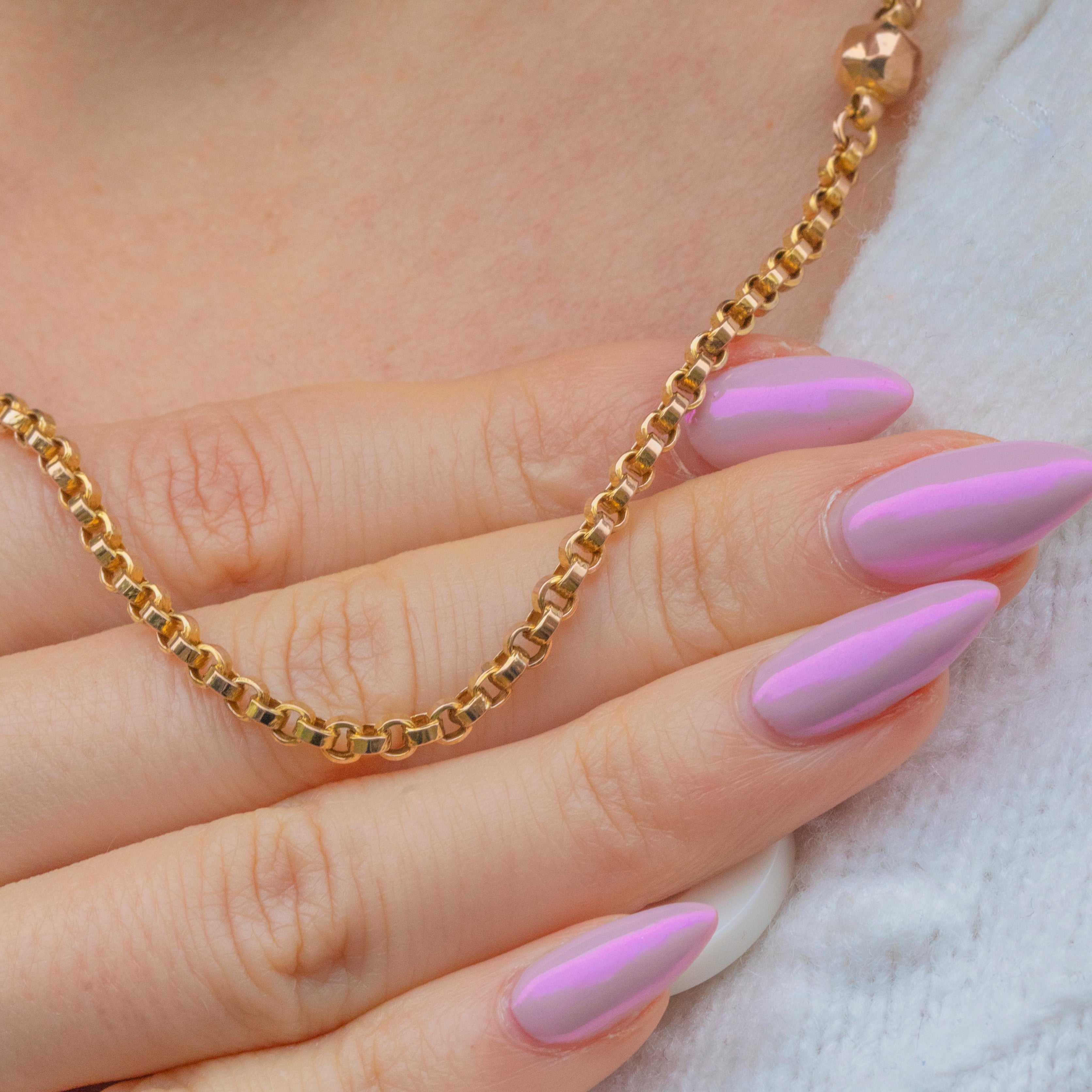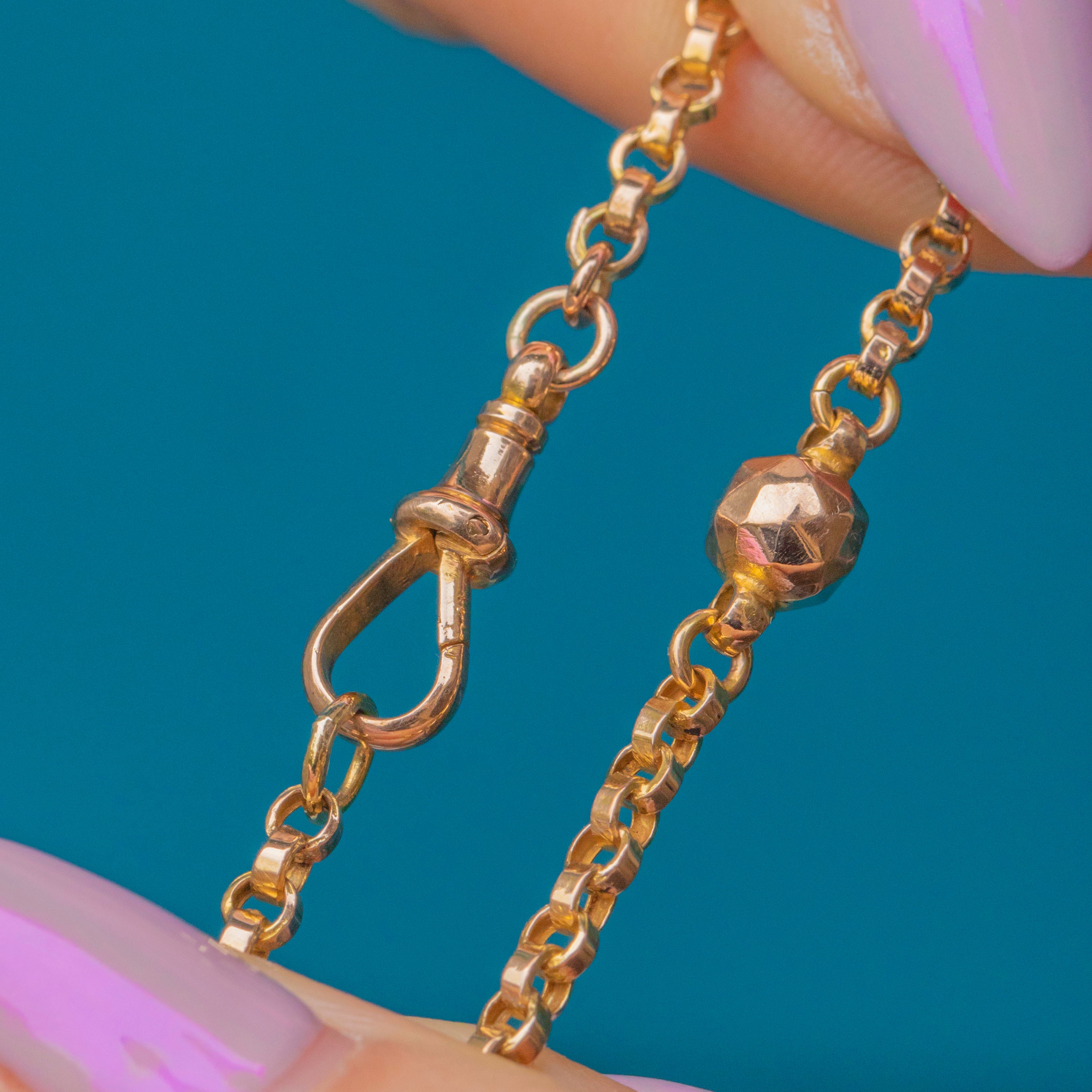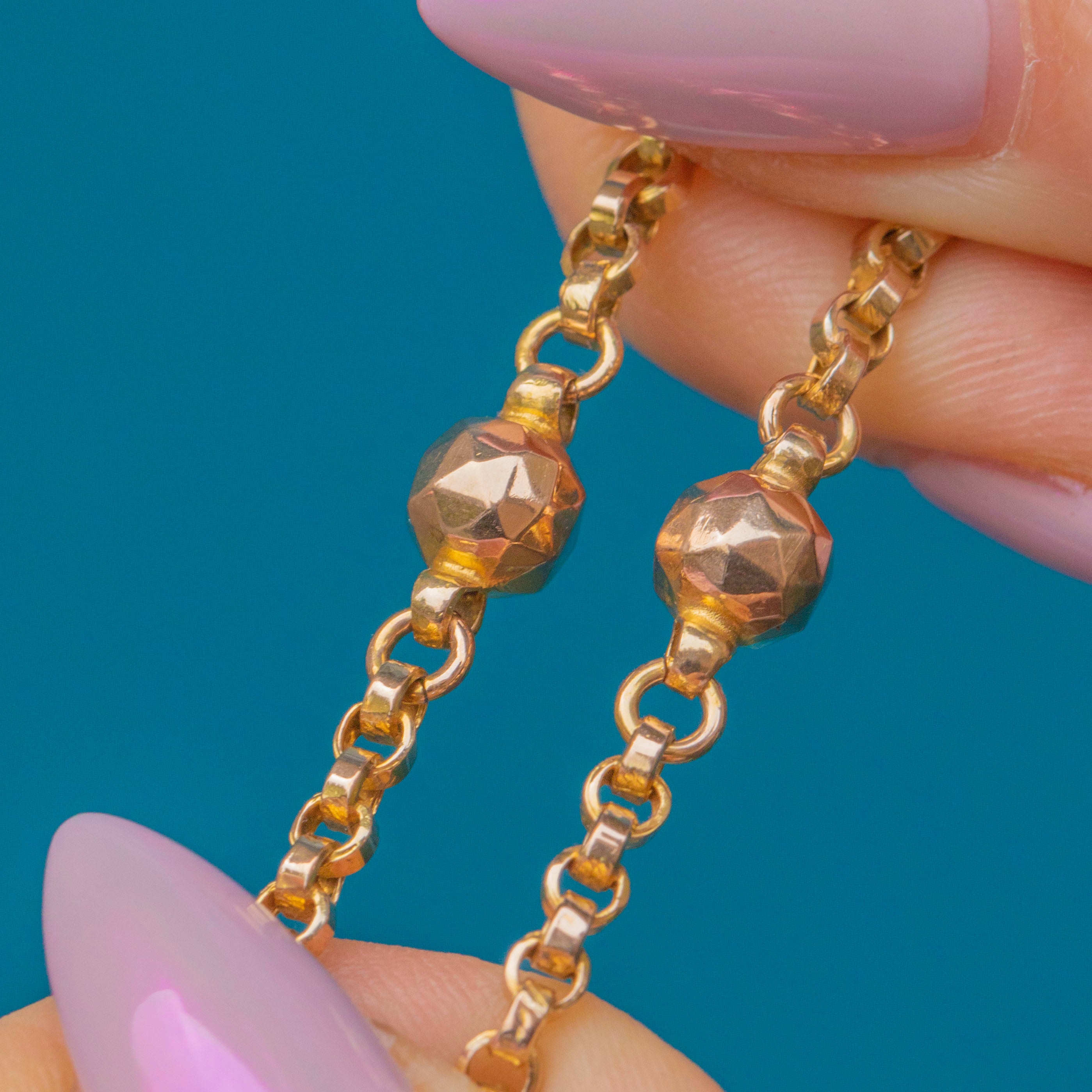 A beautiful Antique Victorian 9ct Gold chain featuring elegant faceted bead stations and a traditional dog-clip clasp. Each Gold bead is finely faceted to catch the light, adding a subtle sparkle to the warm, rosy tone of the Gold links.