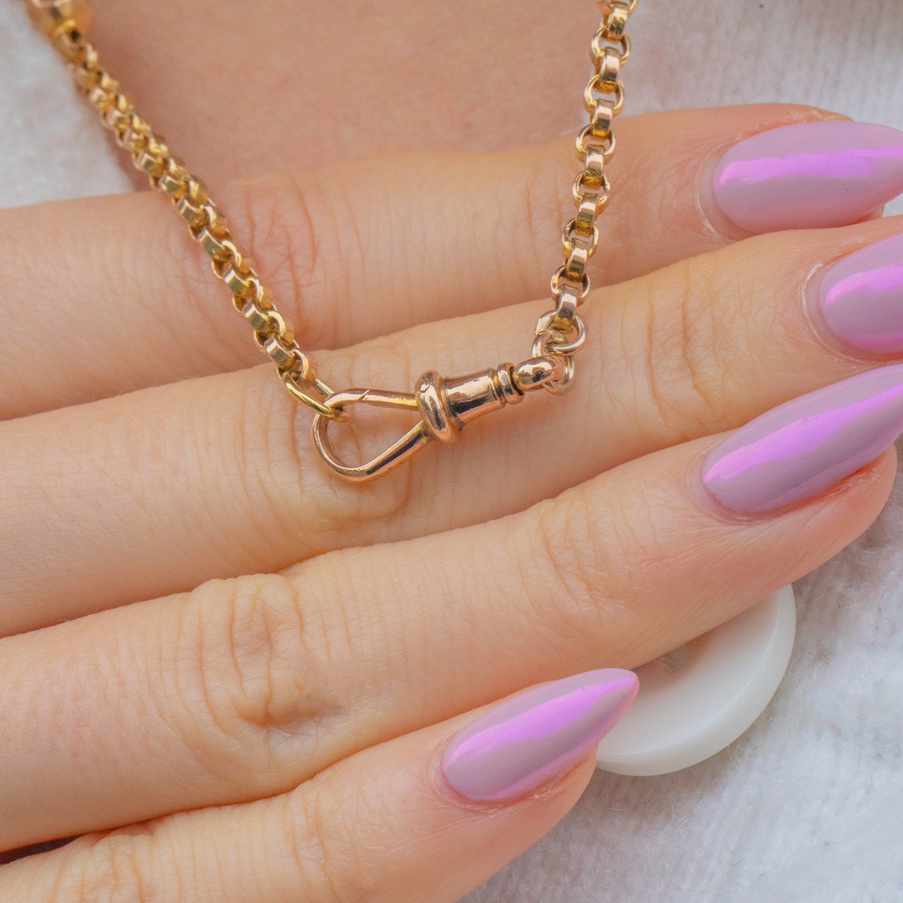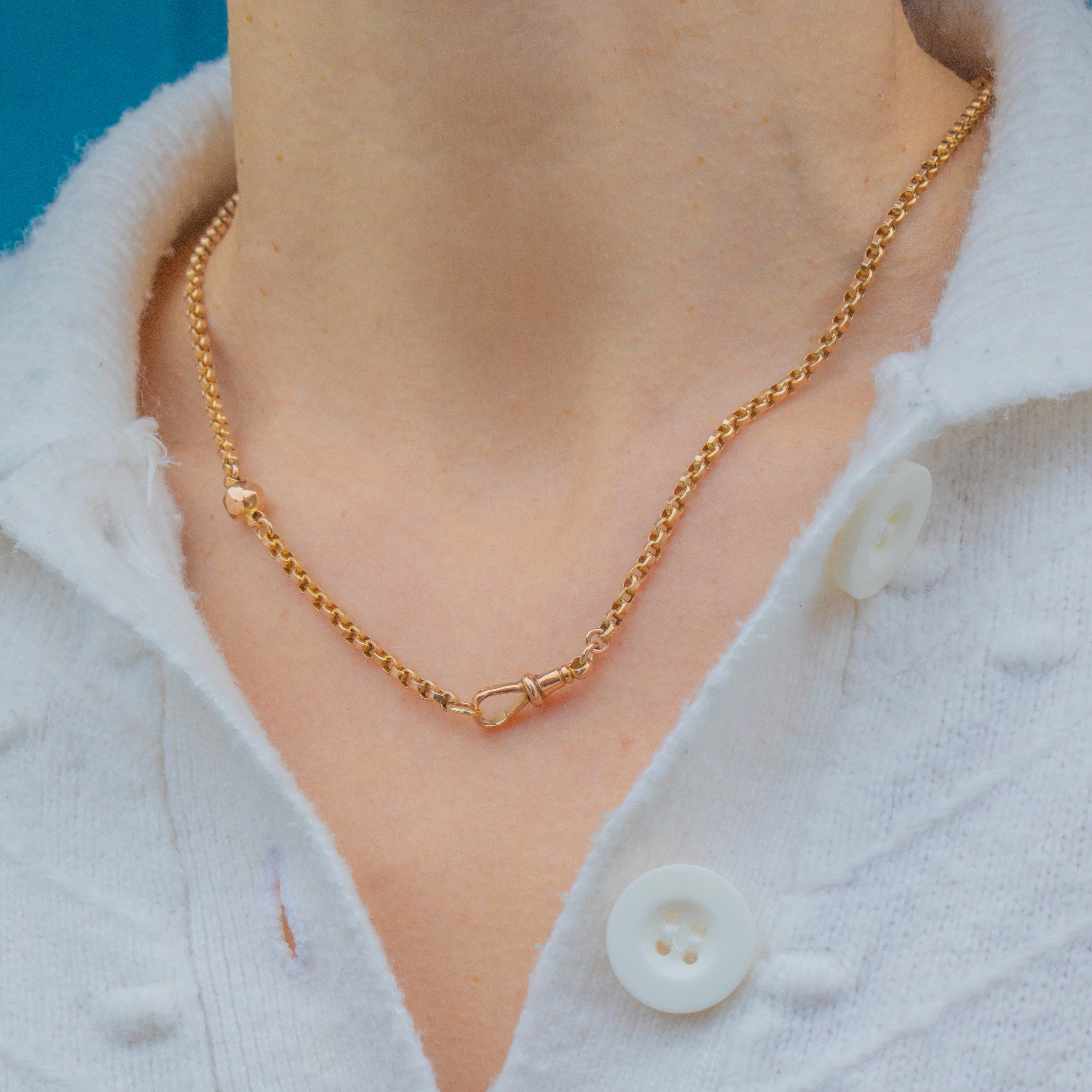 Measuring 18.5" long, this versatile chain can be worn alone or used to display a favourite pendant or charm. The classic dog-clip closure is both decorative and functional, typical of quality Victorian craftsmanship.