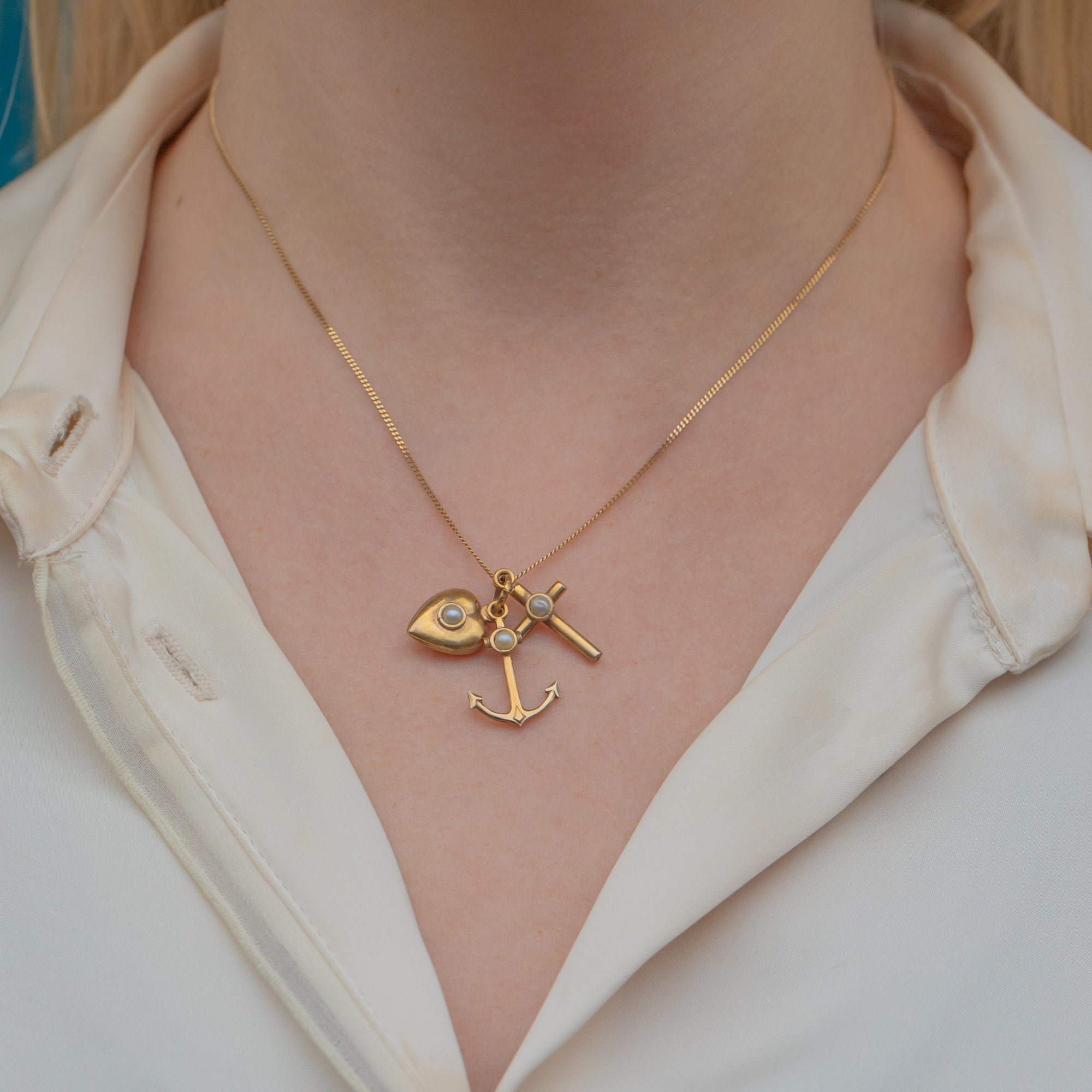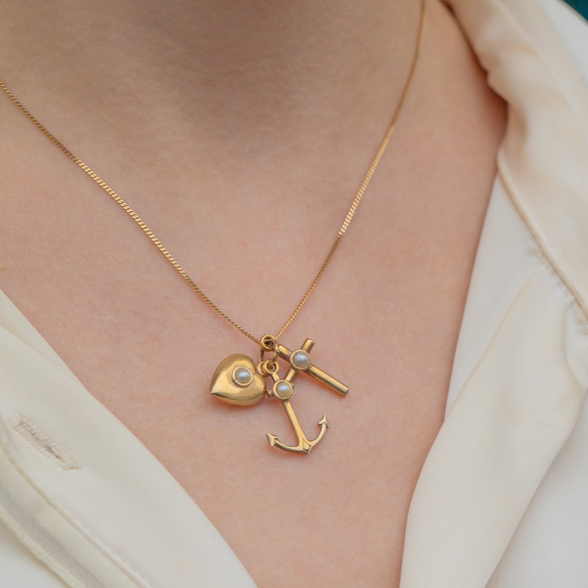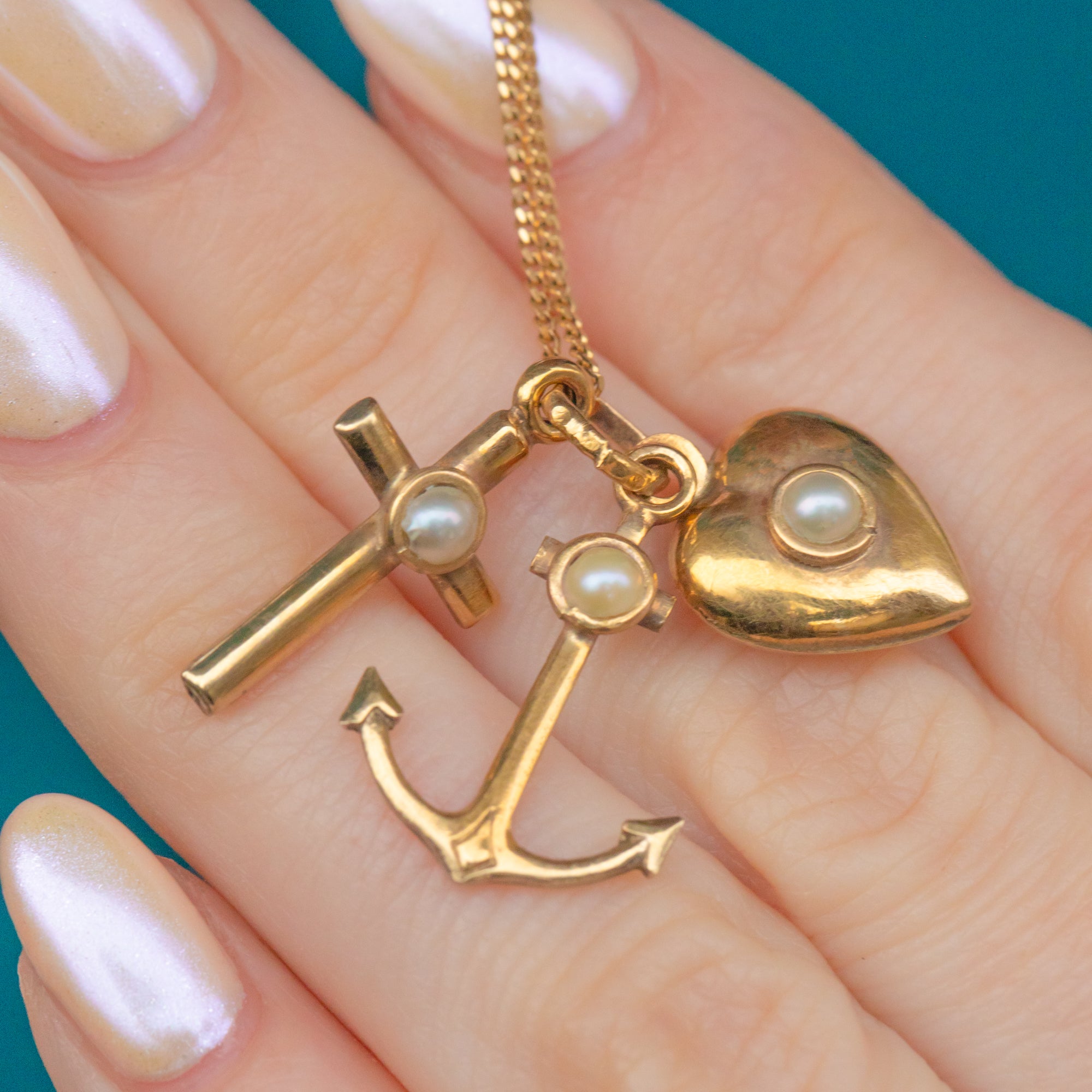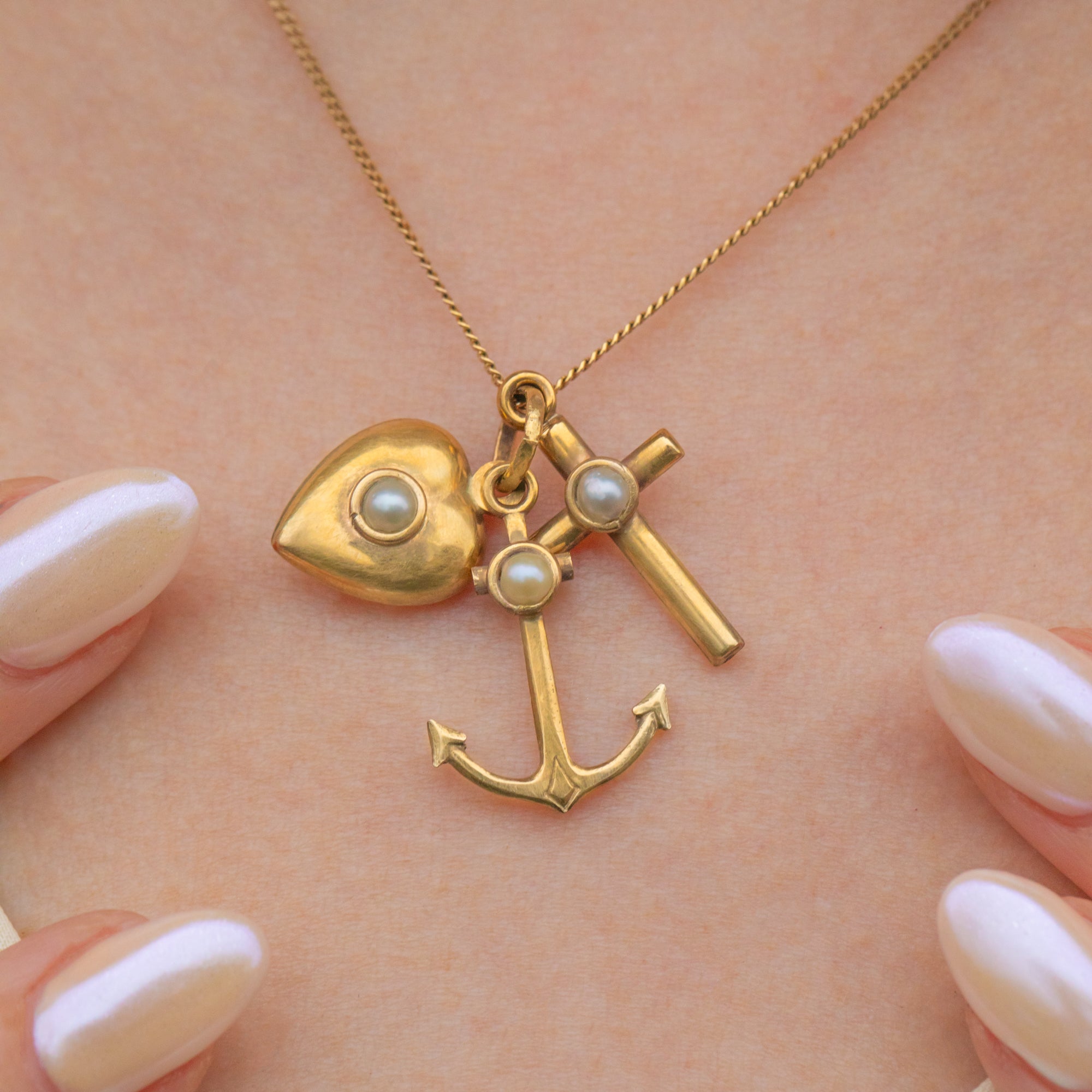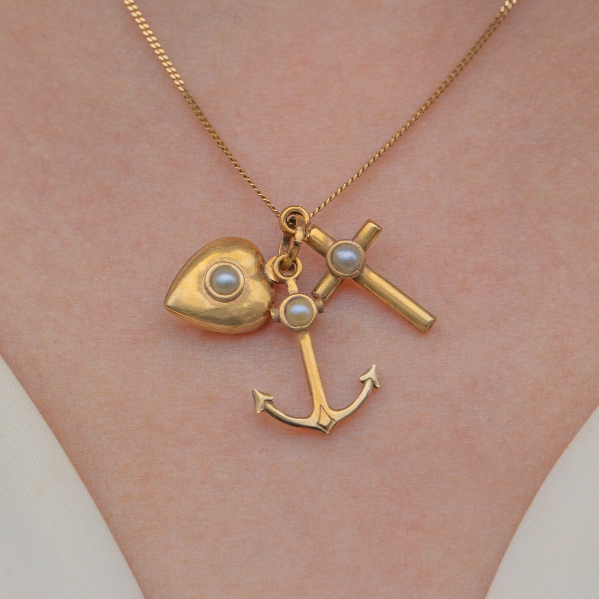 This antique 9ct Gold faith hope charity pendant is a fantastic piece of collector's jewellery steeped in romantic Victorian symbolism. This charm trio includes a cross for 'faith', anchor for 'hope' and heart for 'charity', making it the perfect piece to wear close to your heart suspended from a Gold chain.
