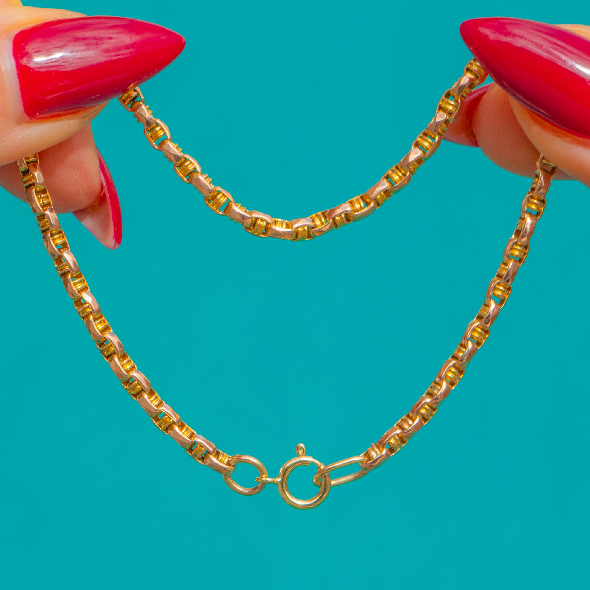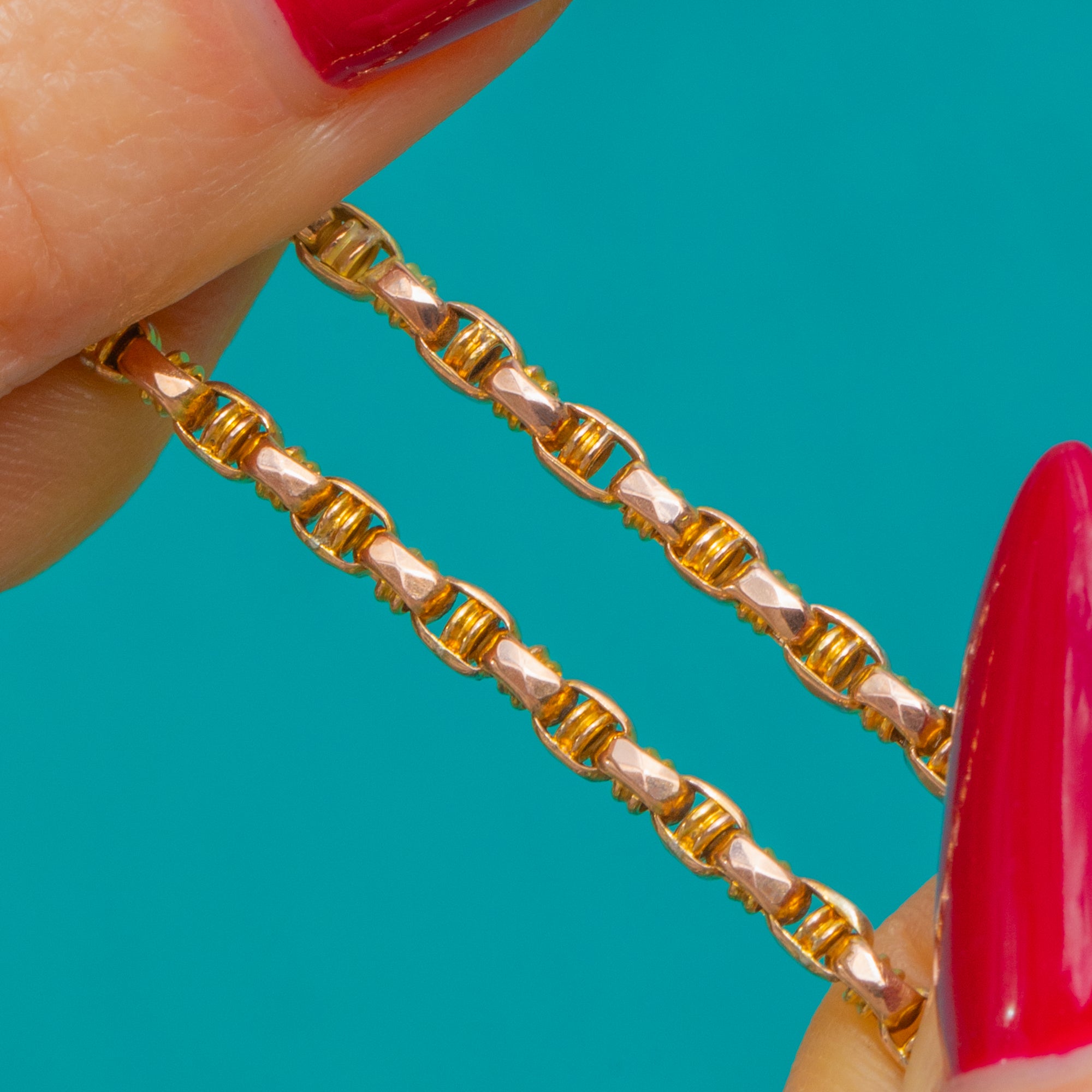 洗練されたVictorian期の逸品、アンティーク9ctゴールド ファンシーリンクブレスレットは、美しくカットされリブ加工が施されたリンクがリズミカルかつ幾何学的に配され、上品な輝きを放ちます。スリムなシルエットと高い鏡面仕上げが、動くたびに繊細な光のきらめきを生み出し、日常の装いにさりげないエレガンスを添えます。