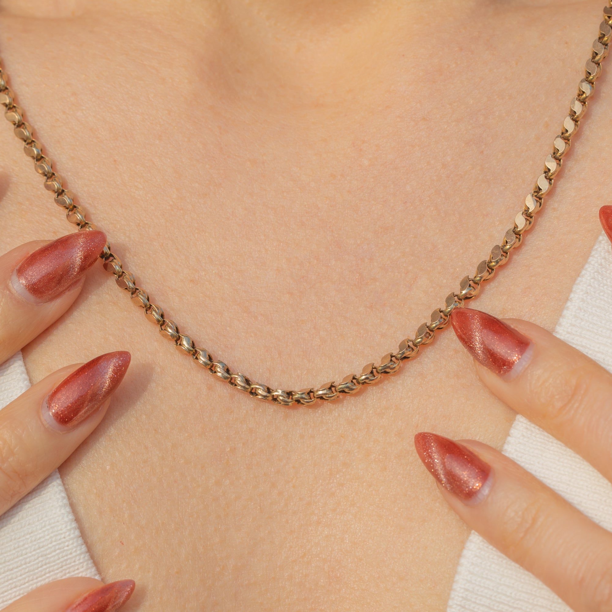 VERY GOOD-EXCELLENT: This antique 9ct Gold fancy tulip chain is in wonderful condition. The links are robust and secure, so you can wear this chain with the utmost confidence. The Golden hue is delicious and will last a lifetime of wear and beyond! There is an area on the dog-clip that has been previously filed to test the purity of the metal, but this has not impacted its structural integrity, and it functions perfectly.