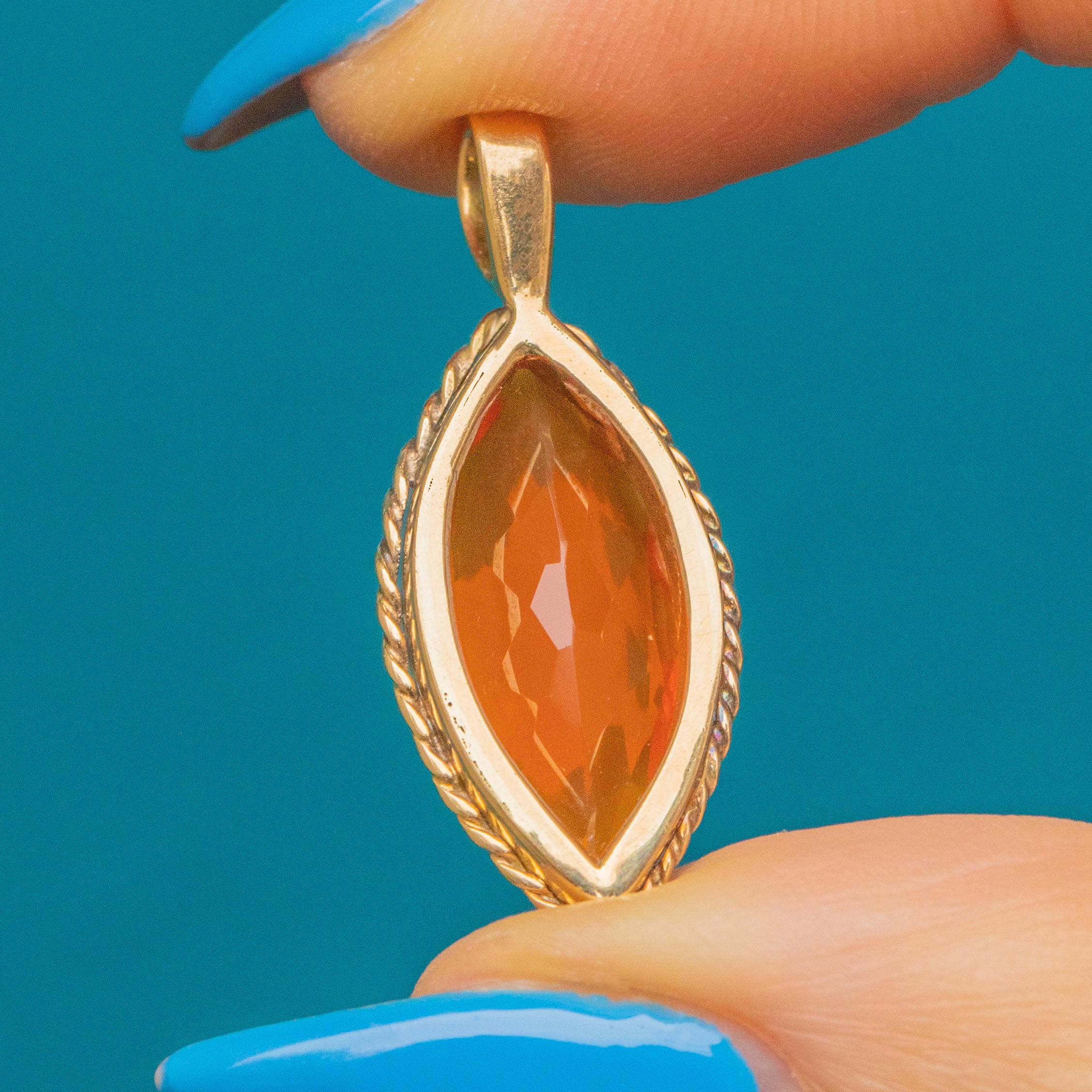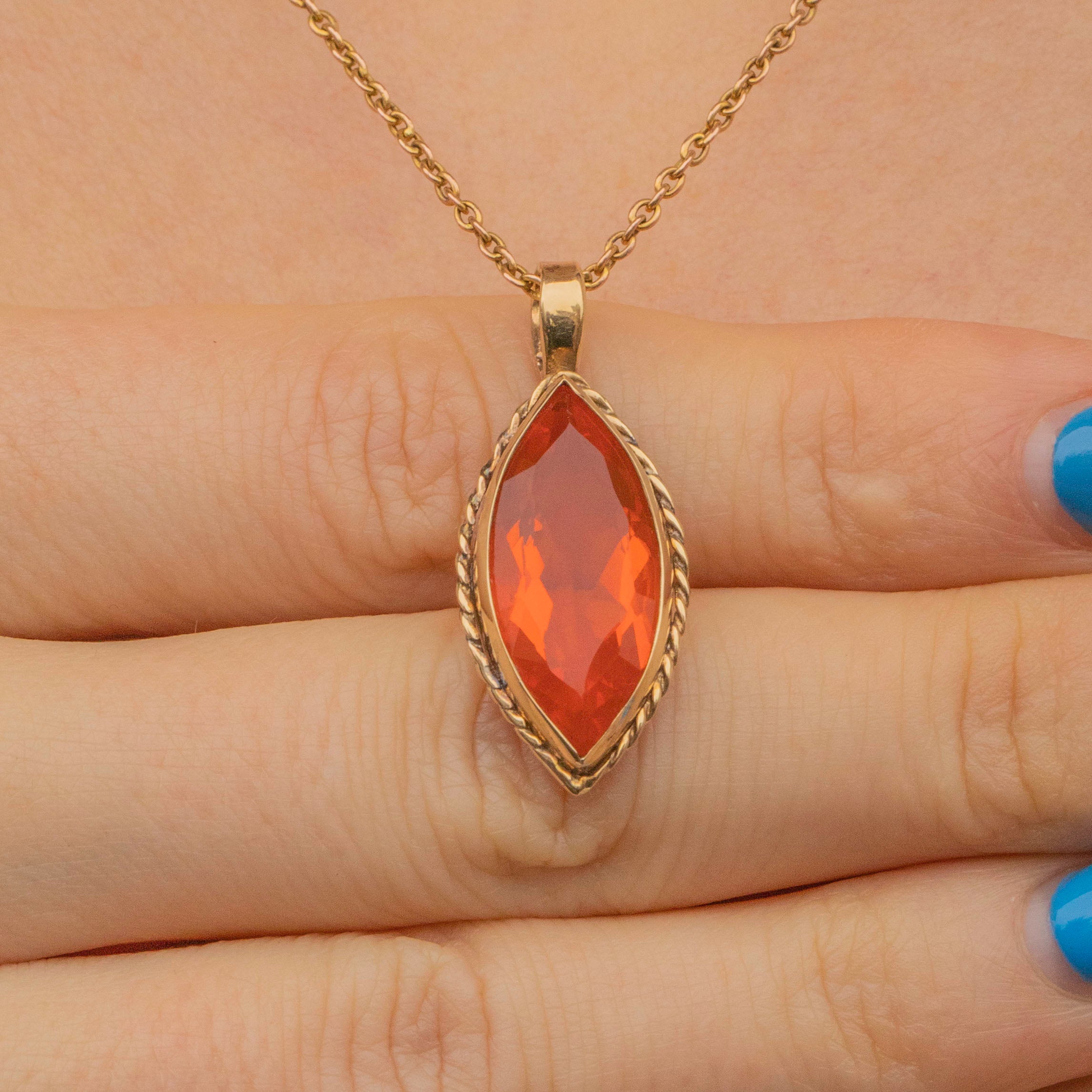 The marquise shaped Fire Opal is set within a 9ct Gold bezel, hugged tightly from all sides. Plump, sophisticated and highly sought after, we imagine this Tangerine hued Fire Opal pendant will leave your mouth watering!