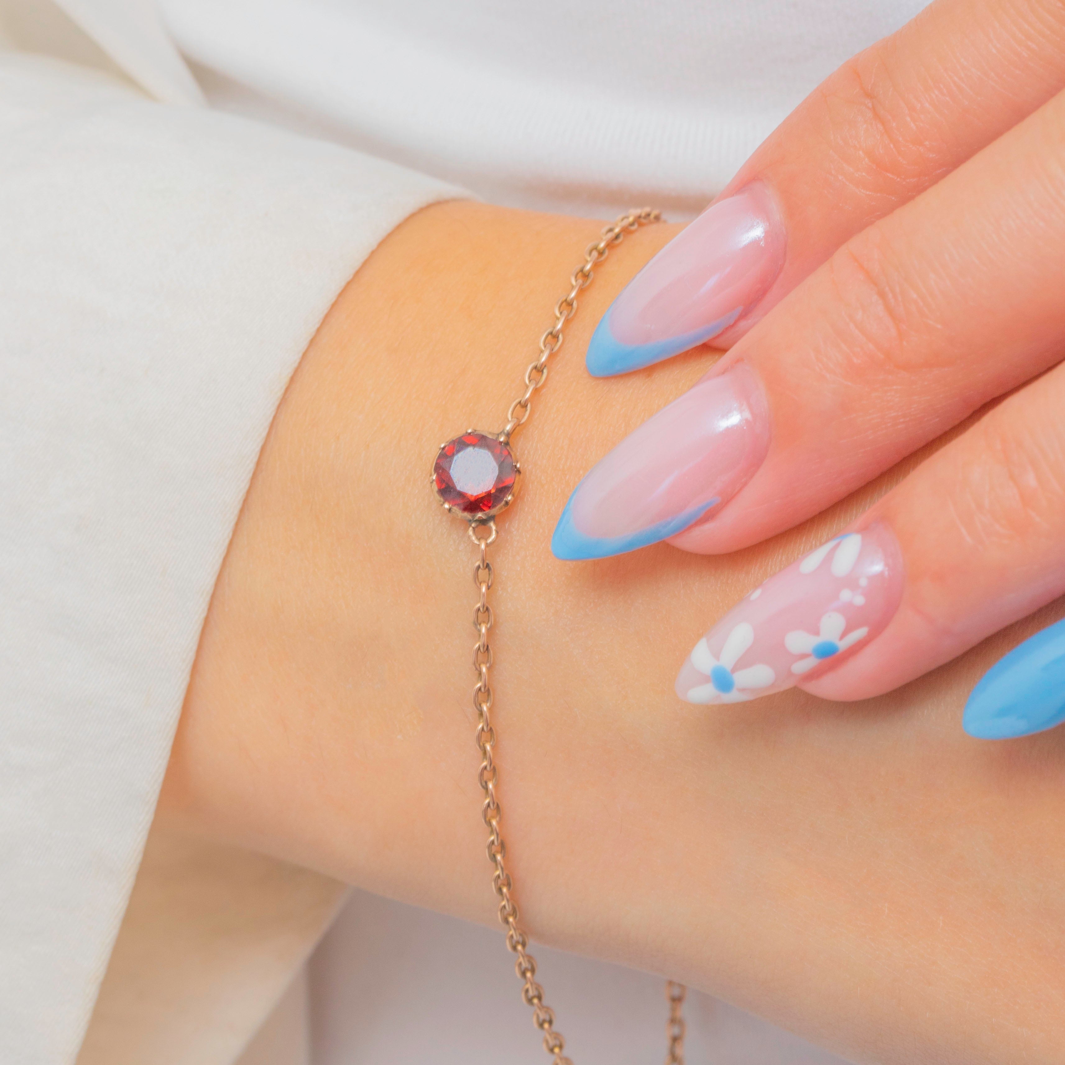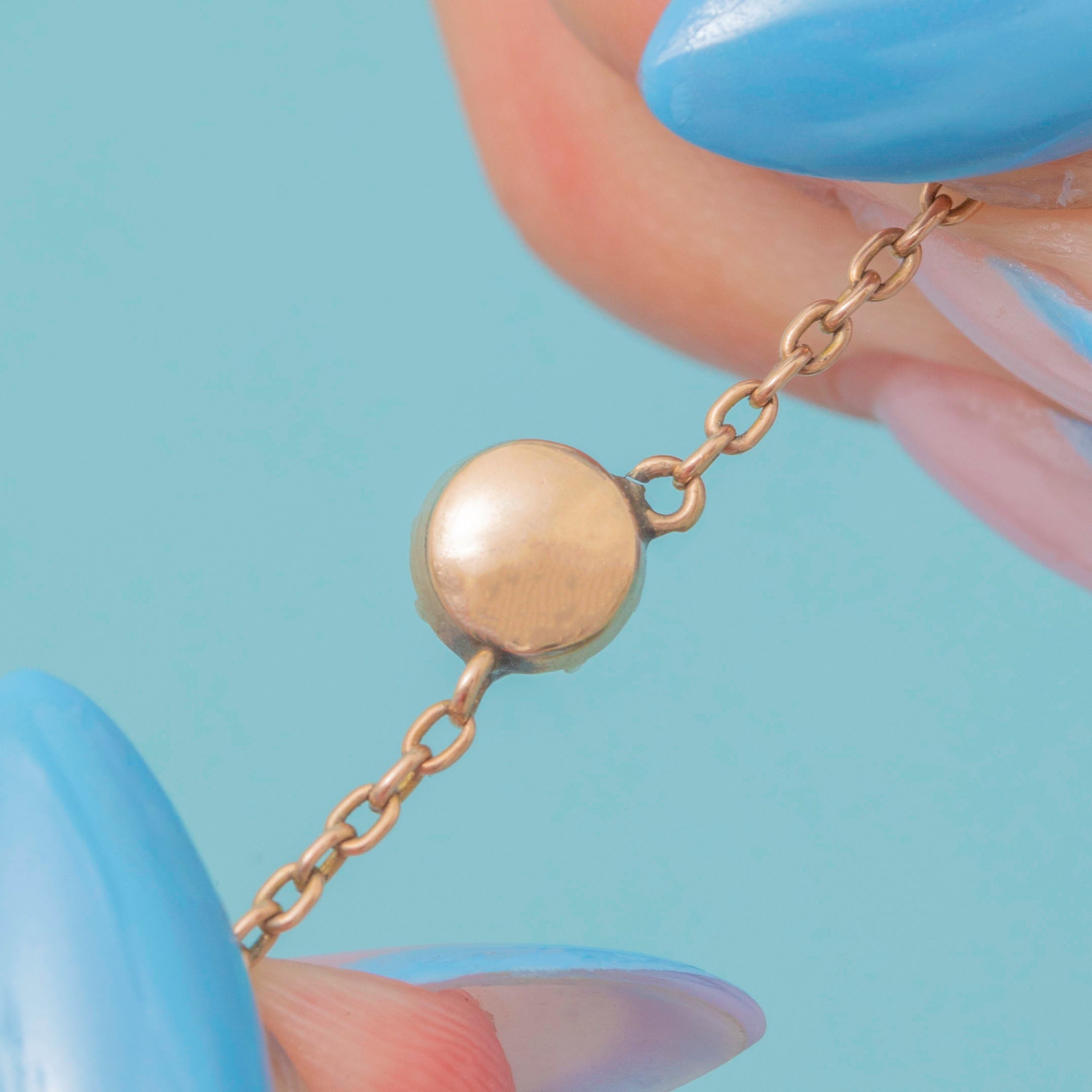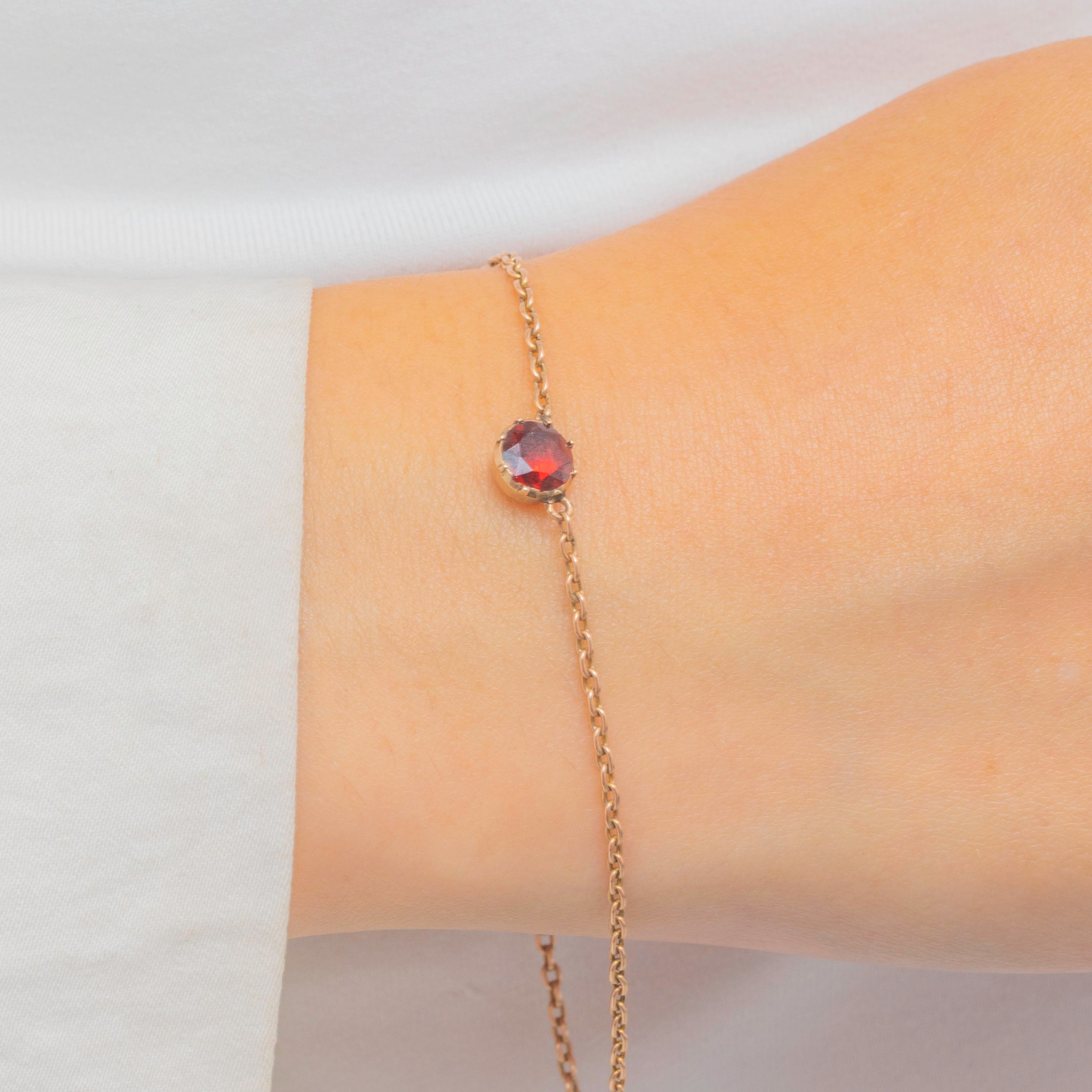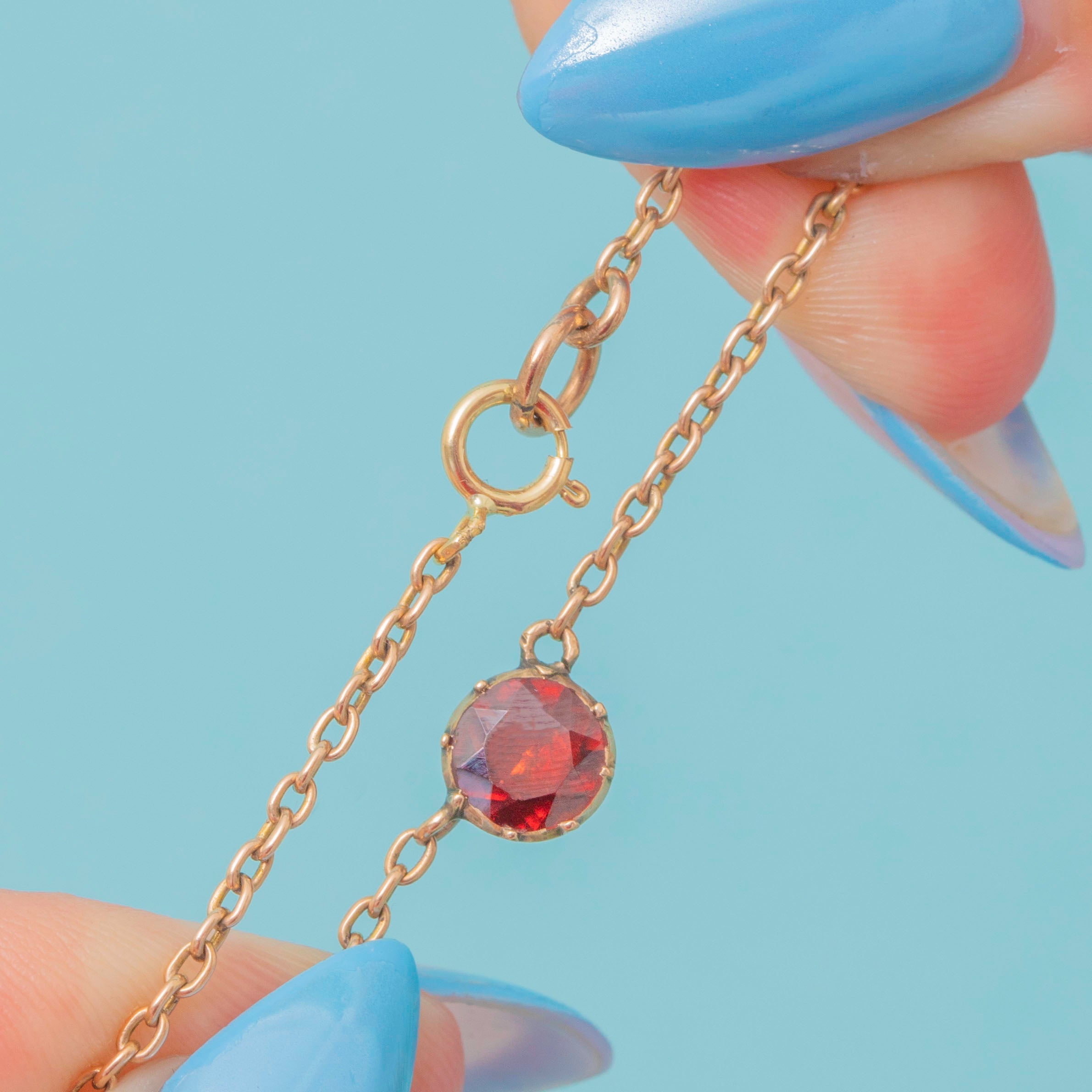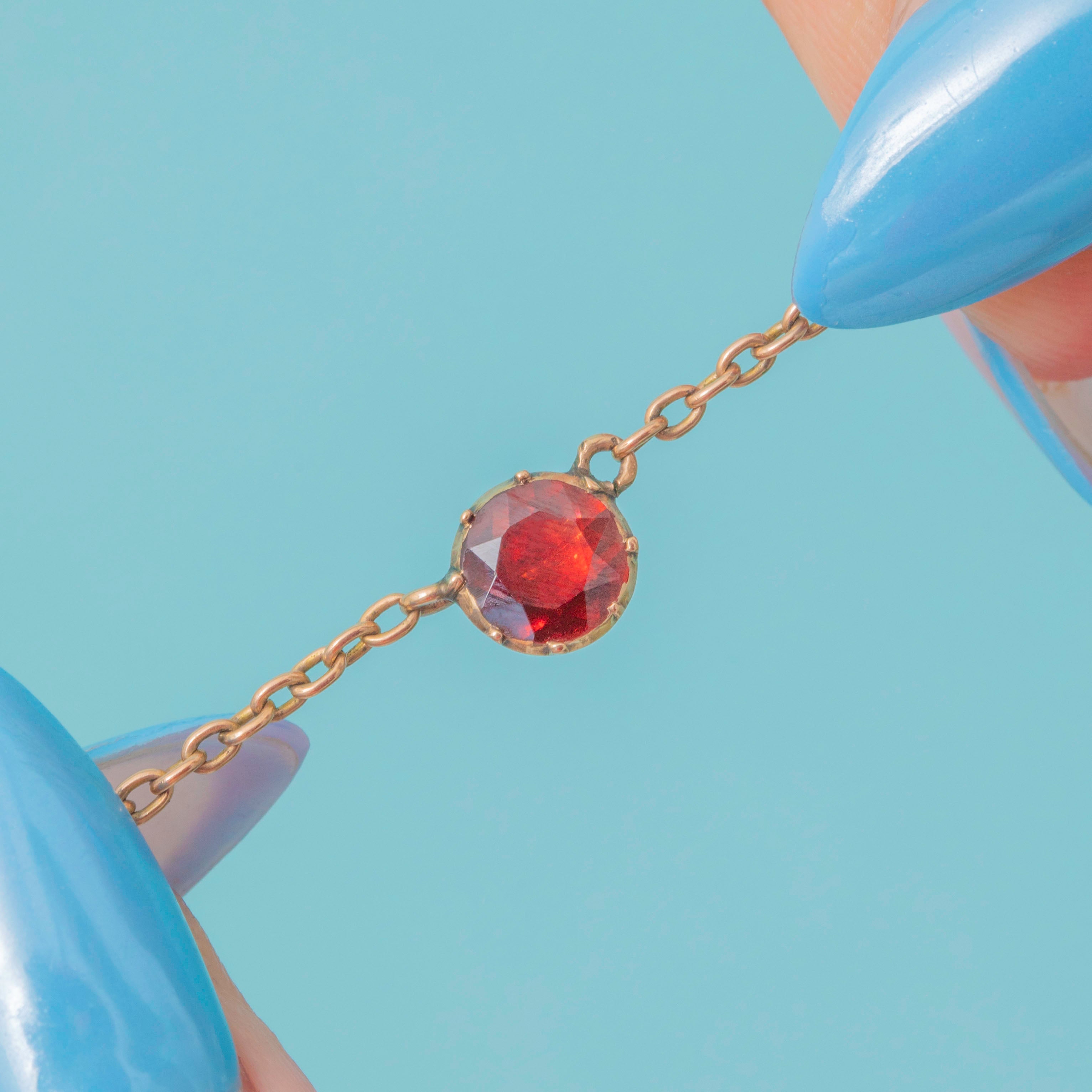 This elegant Victorian bracelet displays a 0.30ct, round closed-back Garnet, radiating deep sangria hues from its crisp facets. The Garnet rests on a warm 9ct Gold chain and at a desirable 7.5" in length, this sophisticated bracelet will make a versatile addition to your collection!