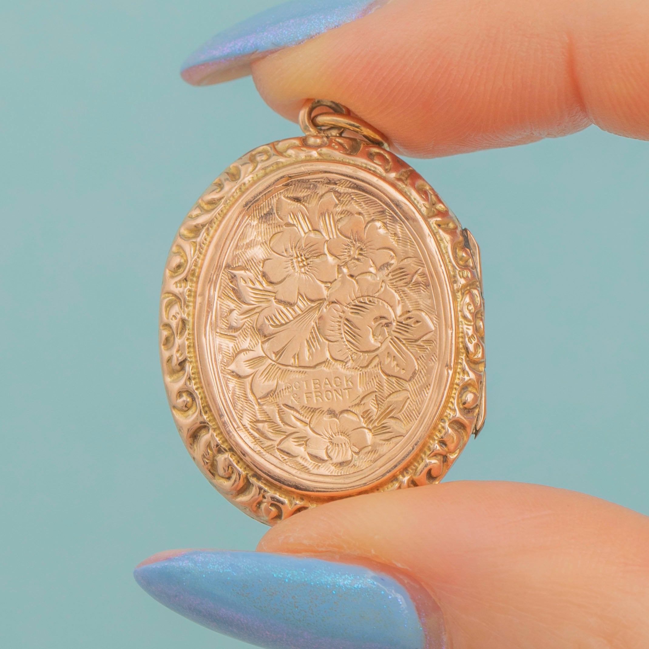 Antique 9ct Gold Forget-Me-Not Engraved Oval Locket