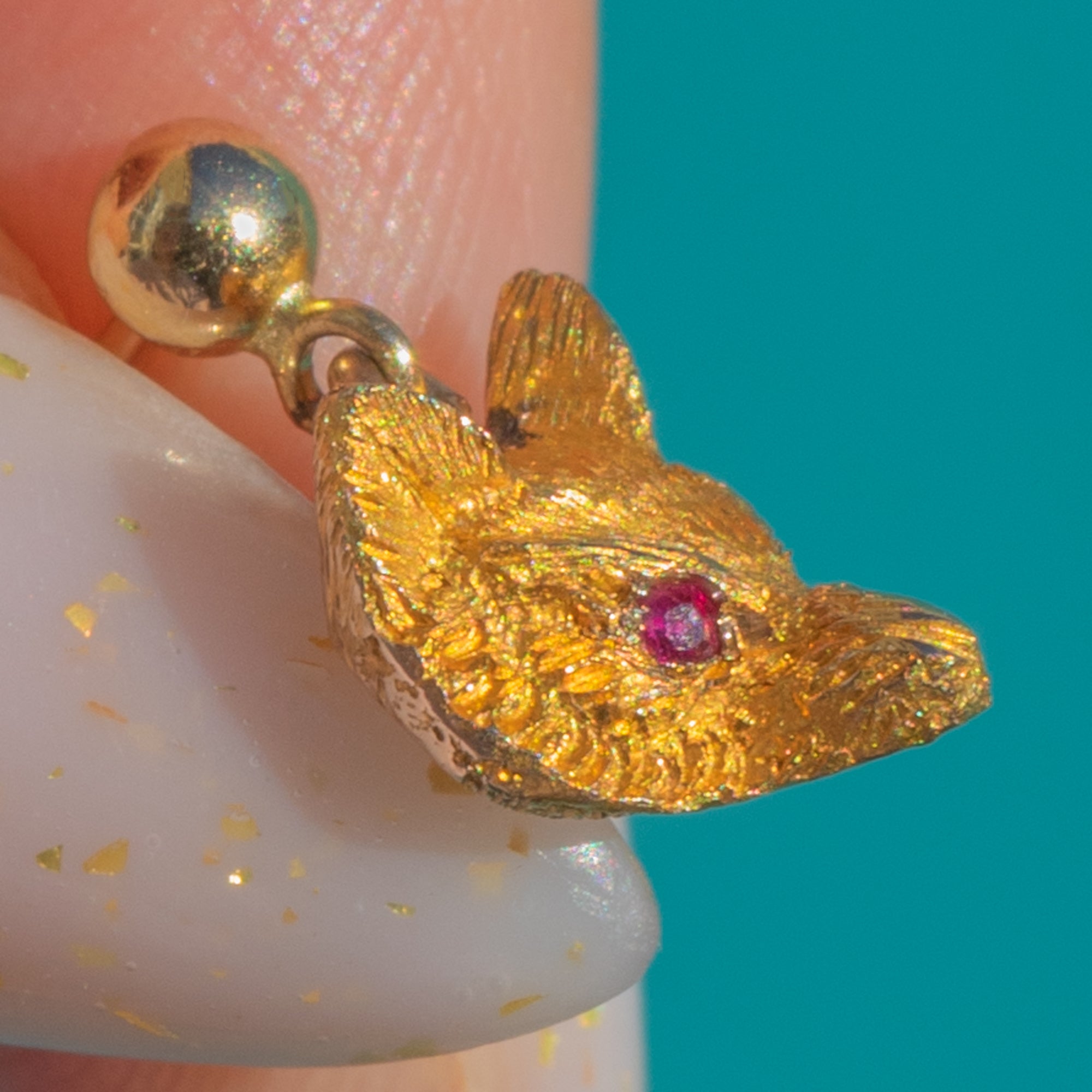 Charming and beautifully detailed, these petite fox-head stud drops capture the playful sporting spirit of the Victorian era. Finely modelled in 9ct Gold with crisp fur texture, each fox is brought to life with glowing Ruby eyes that twinkle with every movement.