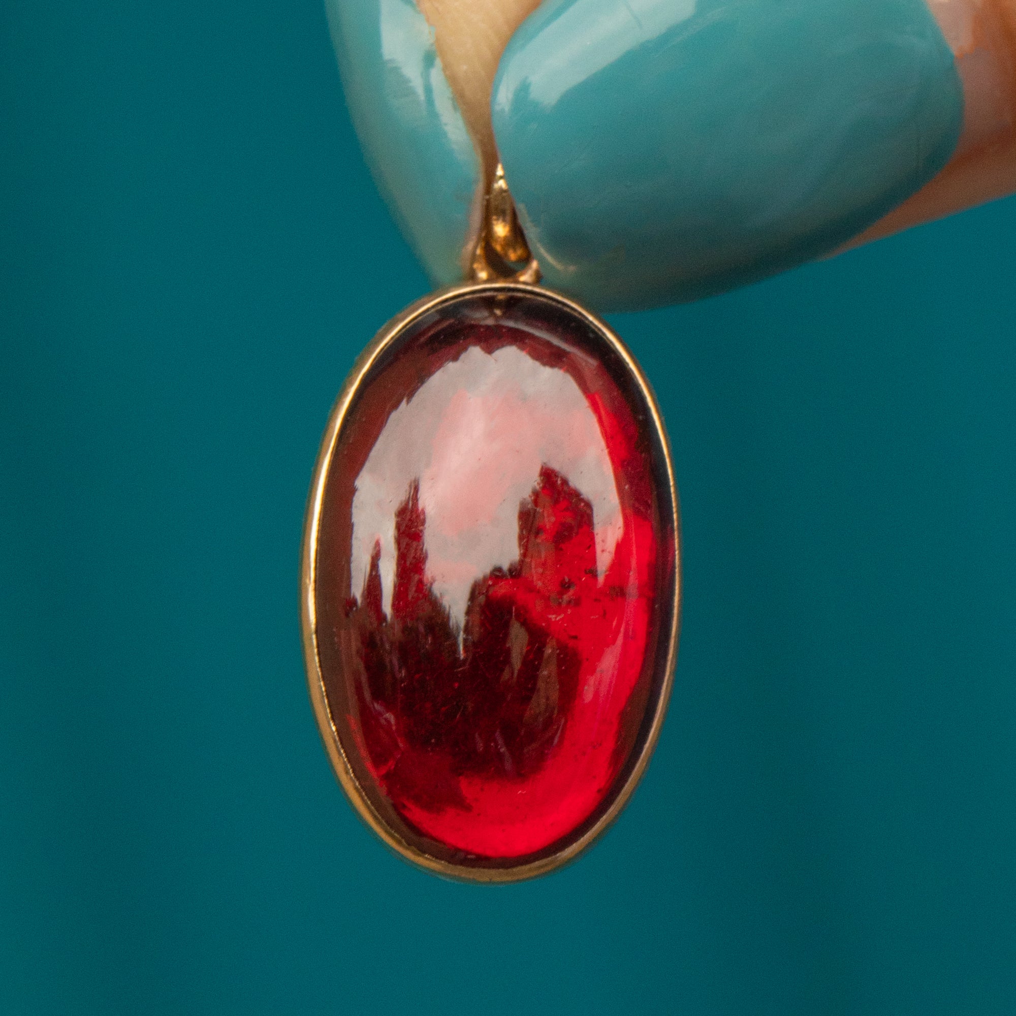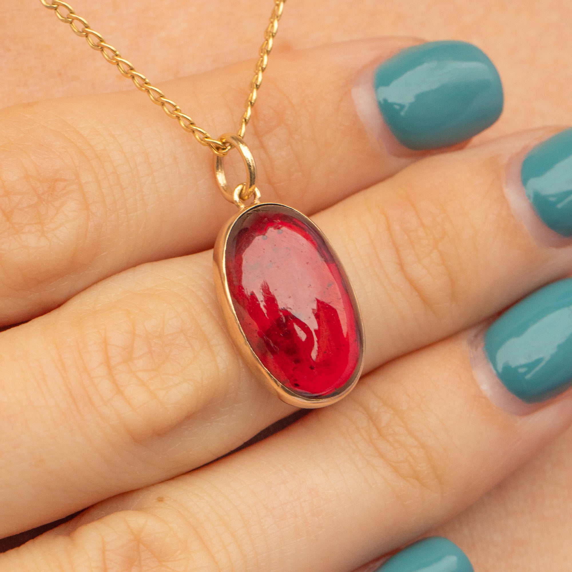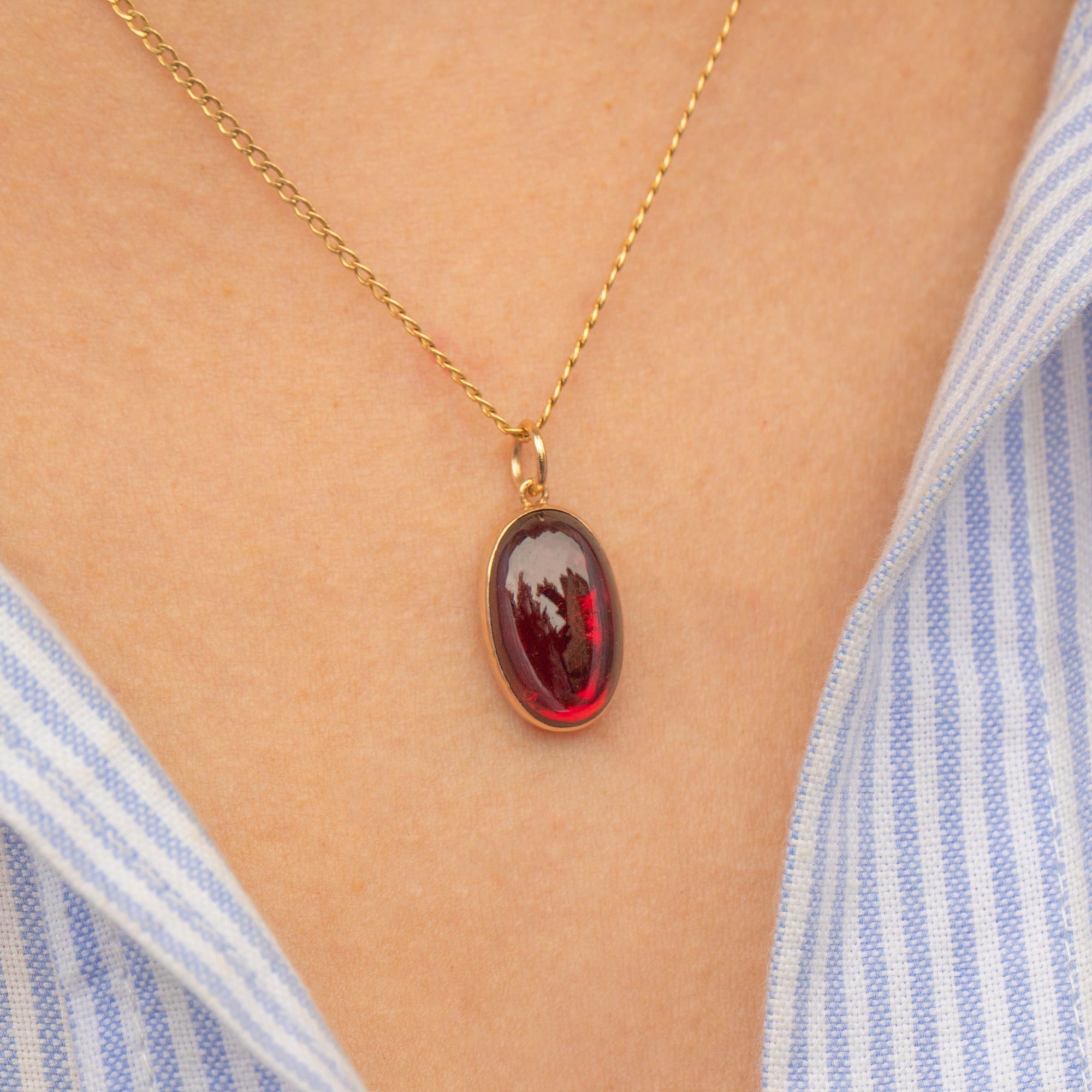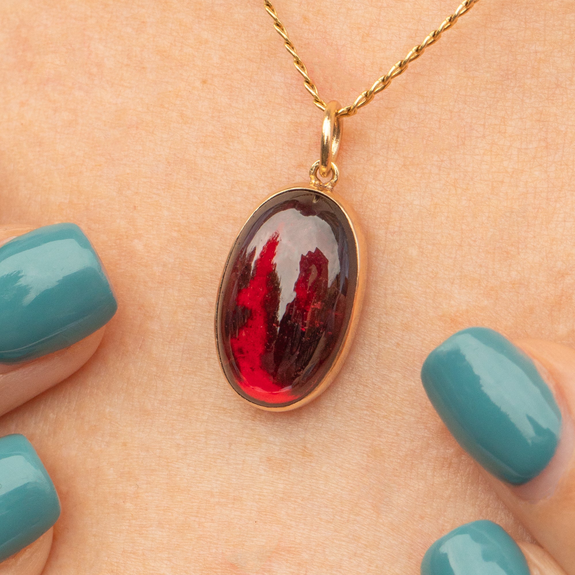 If you are looking for a pendant that packs a punch, then look no further than this antique 9ct Gold Garnet cabochon pendant that boasts 10.69ct of delicious maroon red and flashes of crimson as the light hits.