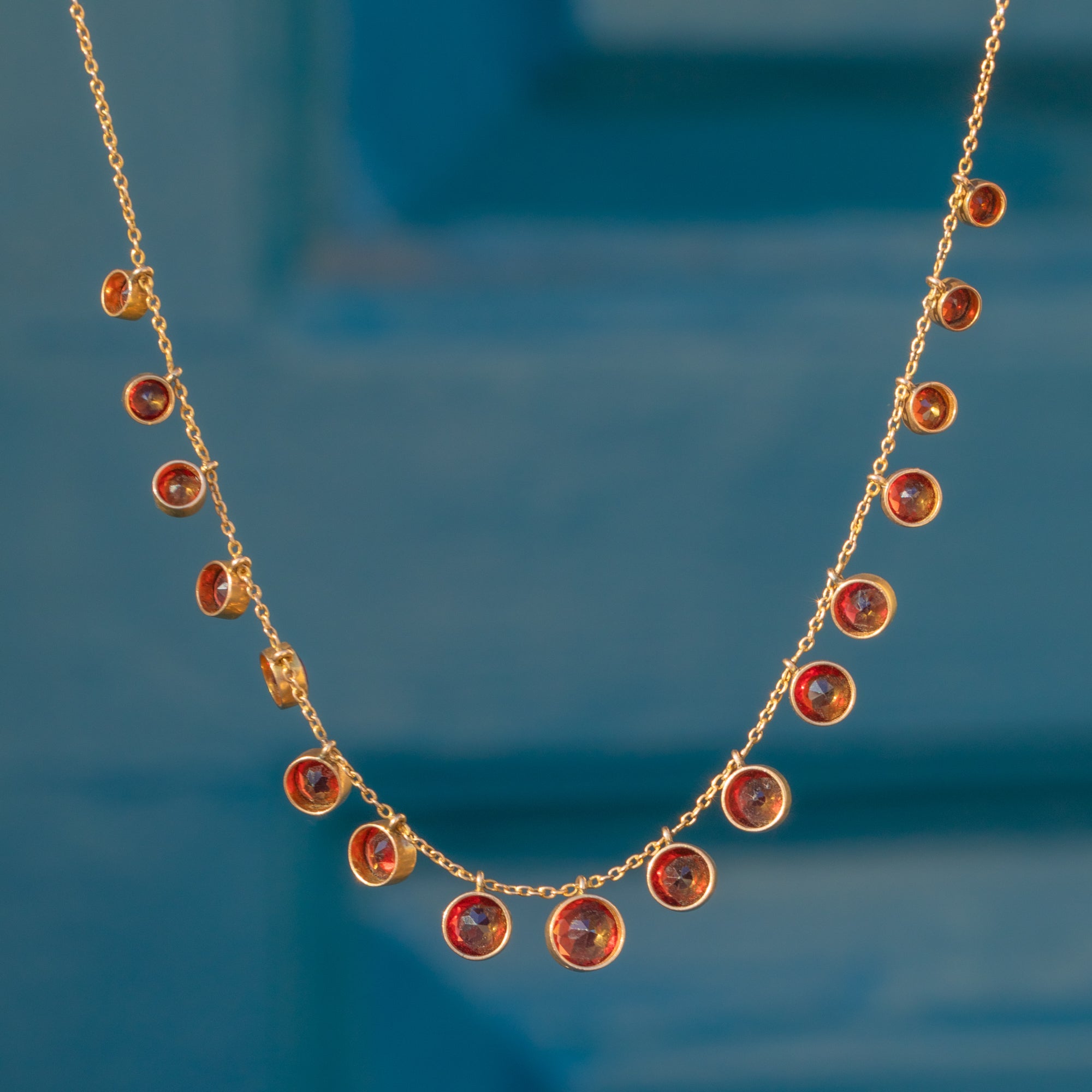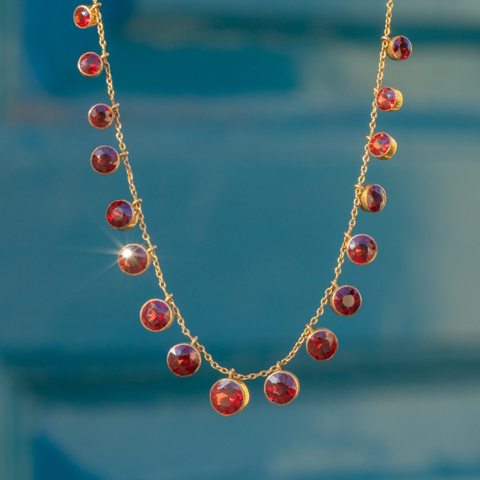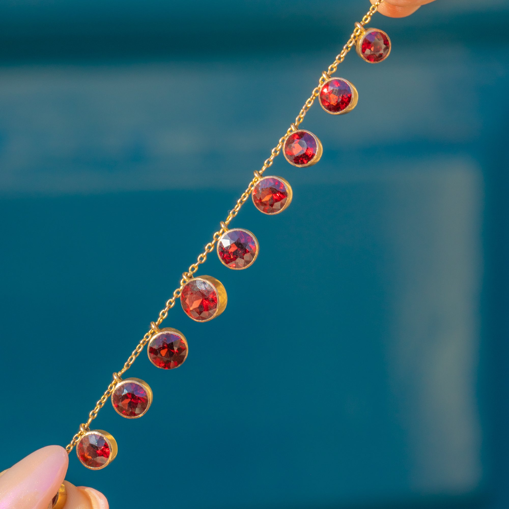 Boasting a combined weight of 11.30ct, this fringe necklace features graduating Garnets, each faceted wonderfully catching the light to reveal rich scarlet hues. Her Garnets sit within buttery 9ct Gold bezels and are suspended from a delicate chain, draping delicately across your décolletage.