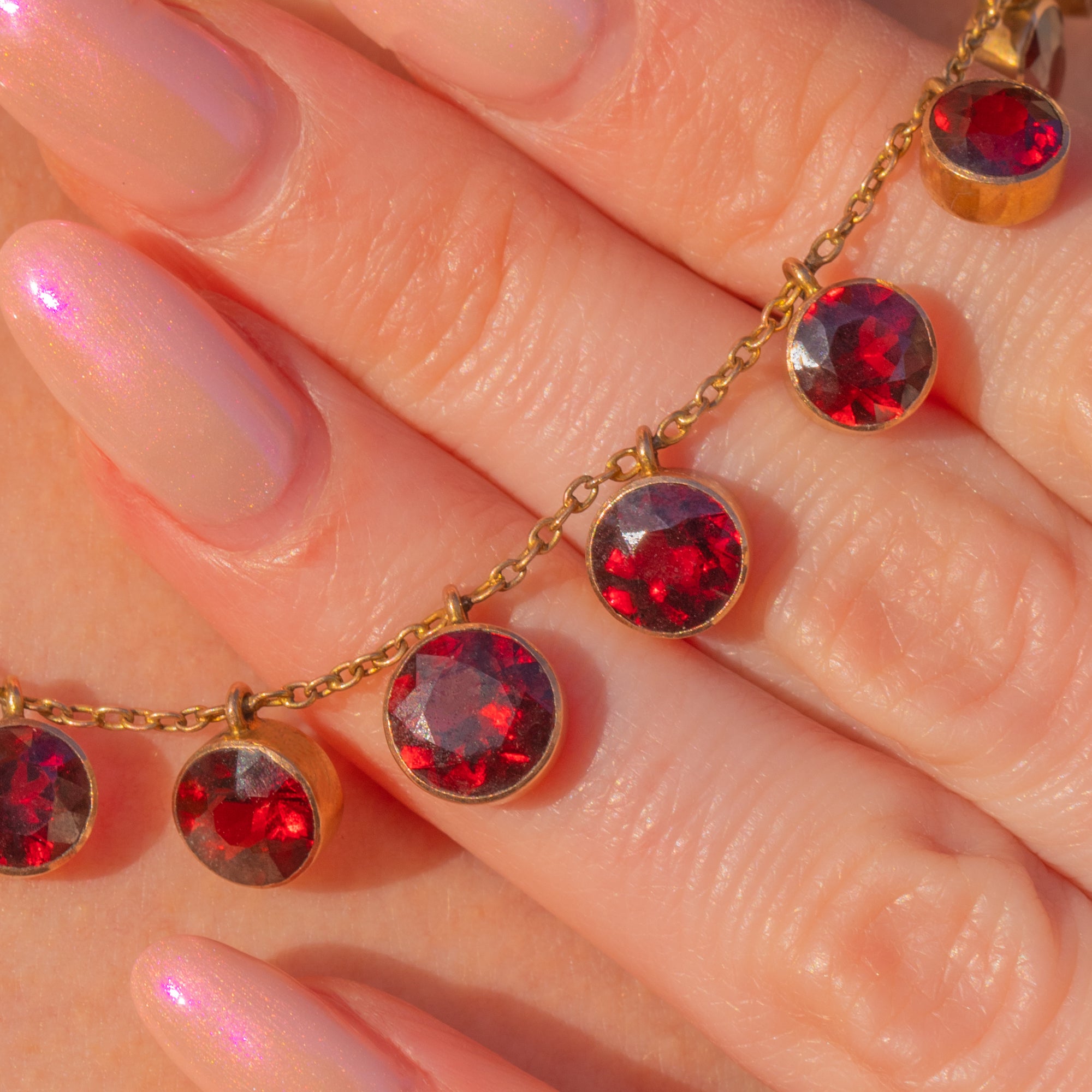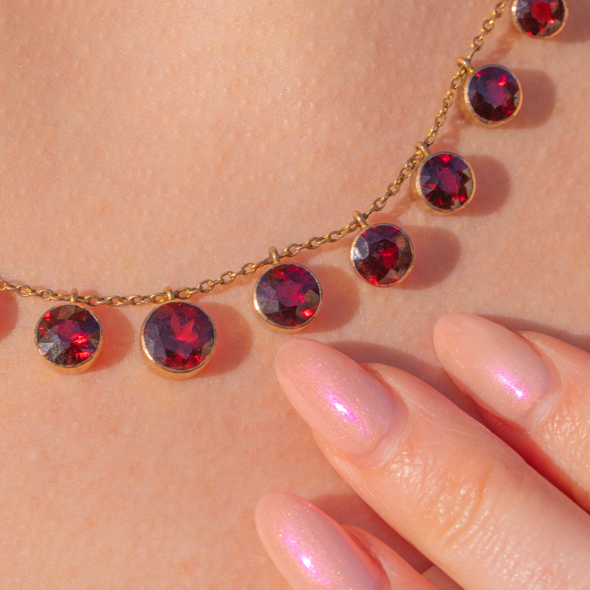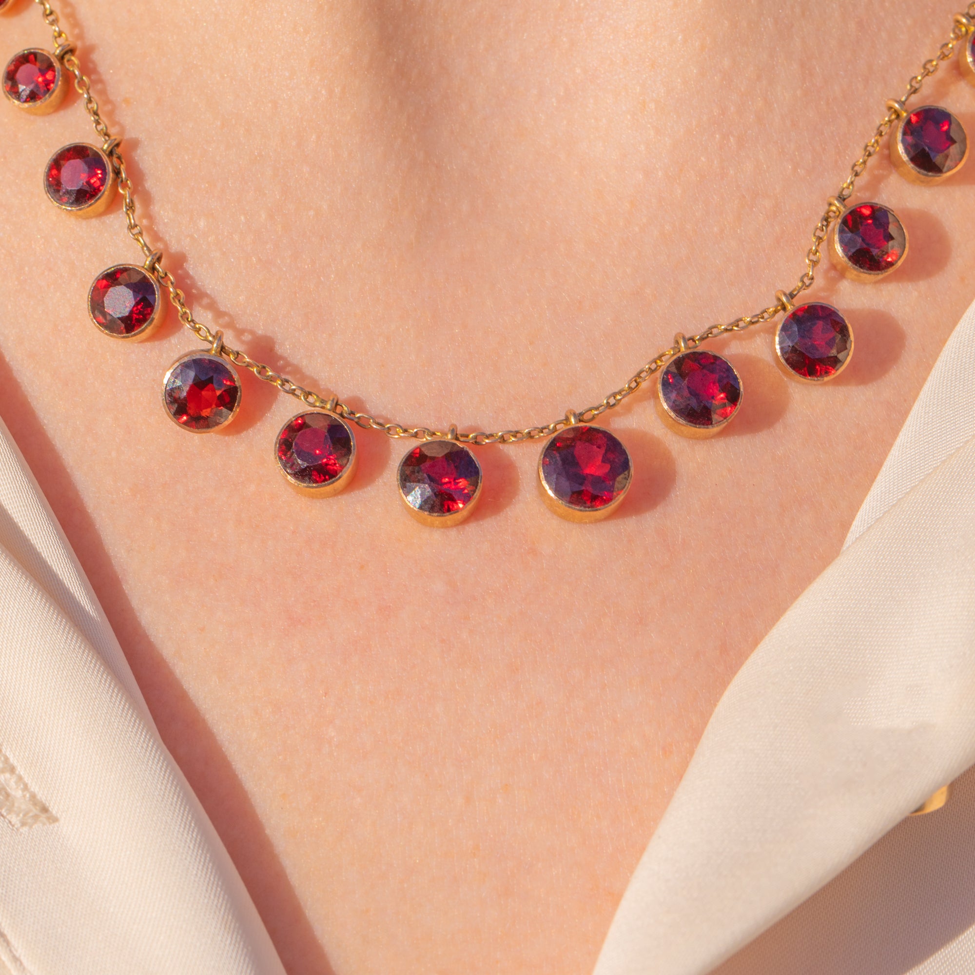 Add a touch of refined luxury and winter warmth to your collection with this antique 9ct Gold Garnet fringe necklace!
