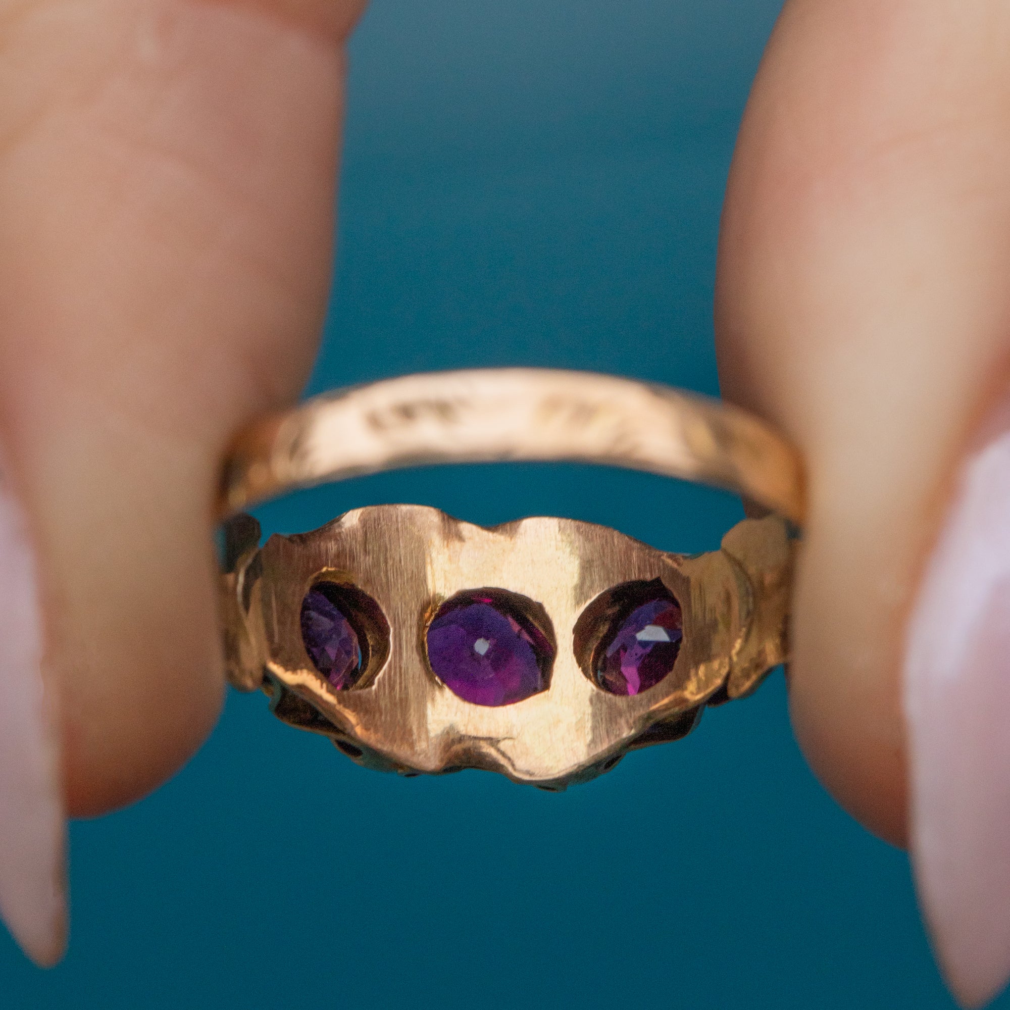 Surrounding her flourish of gemstones is buttery 9ct Gold scroll work following the length of the band, met by whimsical engravings to the back, ensuring her beauty can be appreciated from all angles. Fully hallmarked to 1891, the beauty of this Victorian Garnet ring never fades, looking just as exquisite today as when she was first created over 100 years ago!