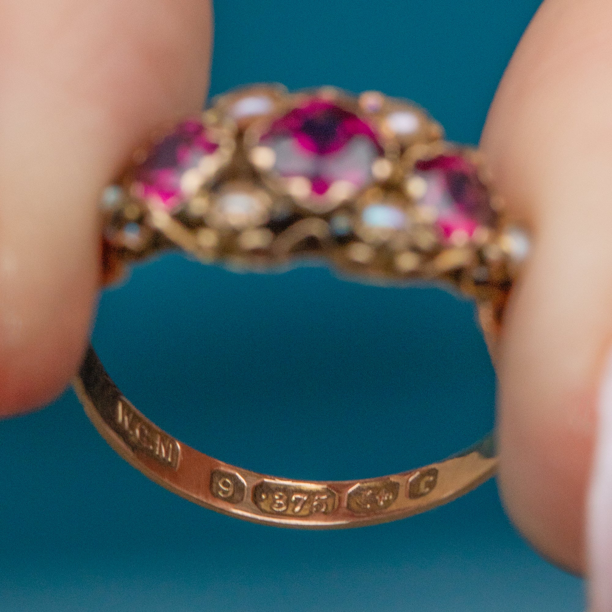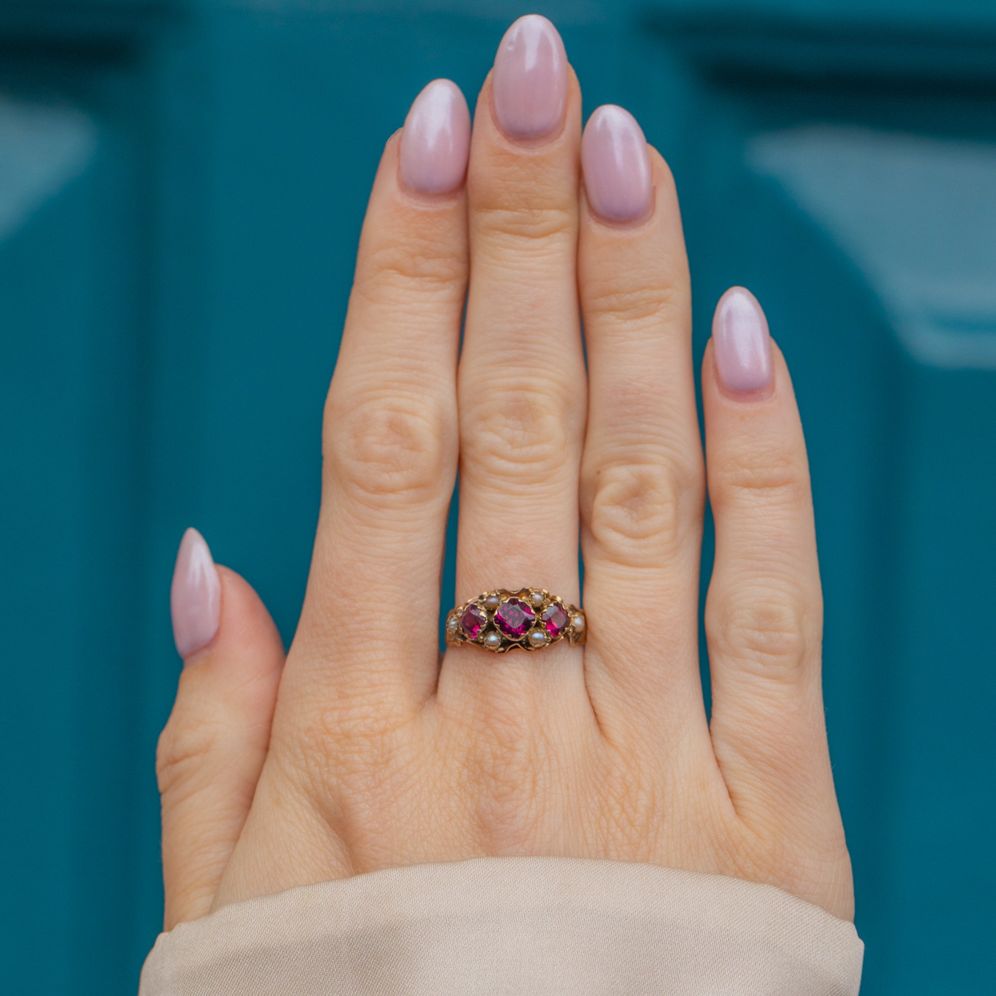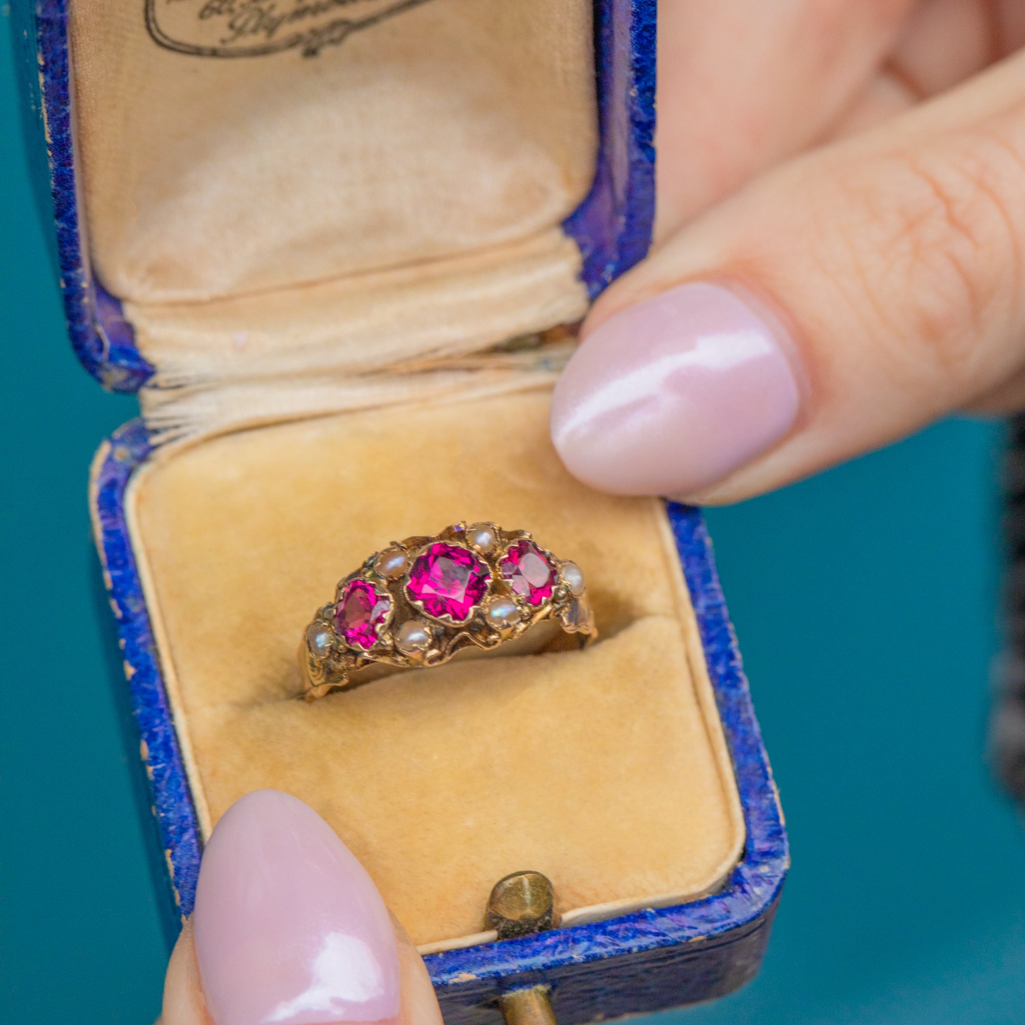 This antique 9ct Gold Garnet Pearl ring is an extraordinary find! Rich with detail, this Victorian ring boasts three Garnets with hot fuchsia flashes, flanked between four shimmering Pearls for a feminine finish.