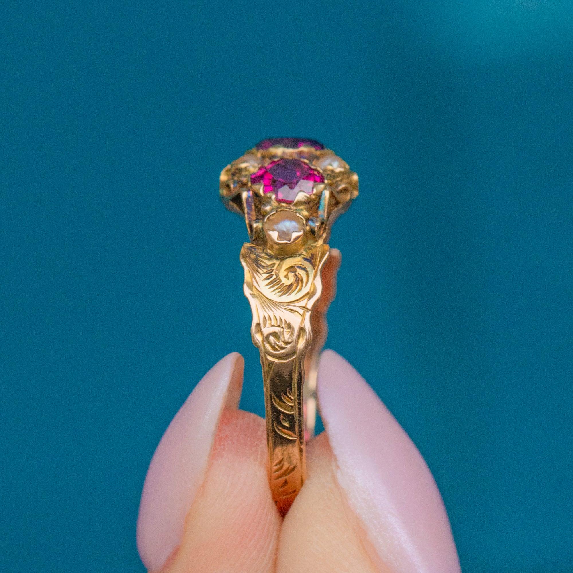 Antique 9ct Gold Garnet Pearl Ring c.1891, Engraved Band
