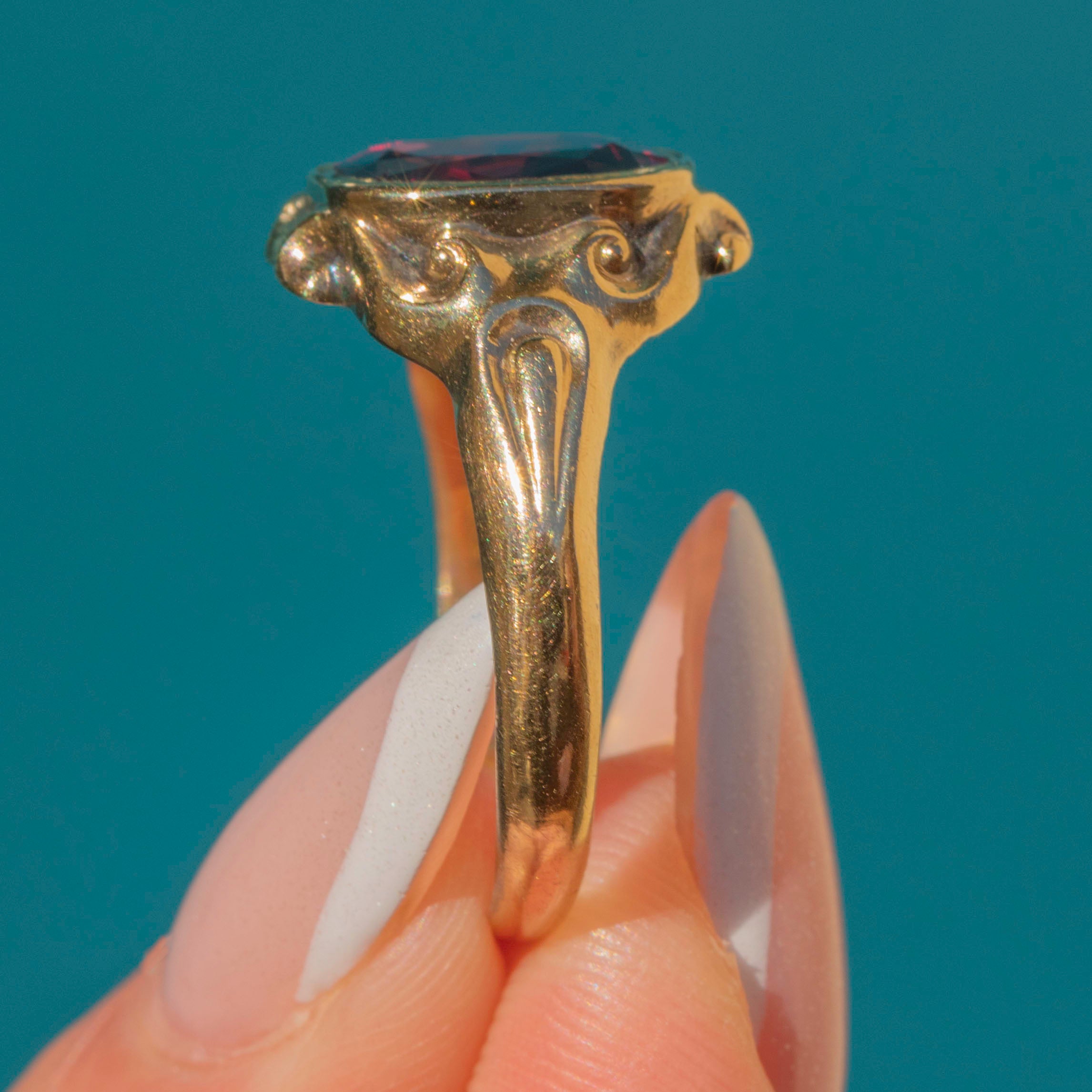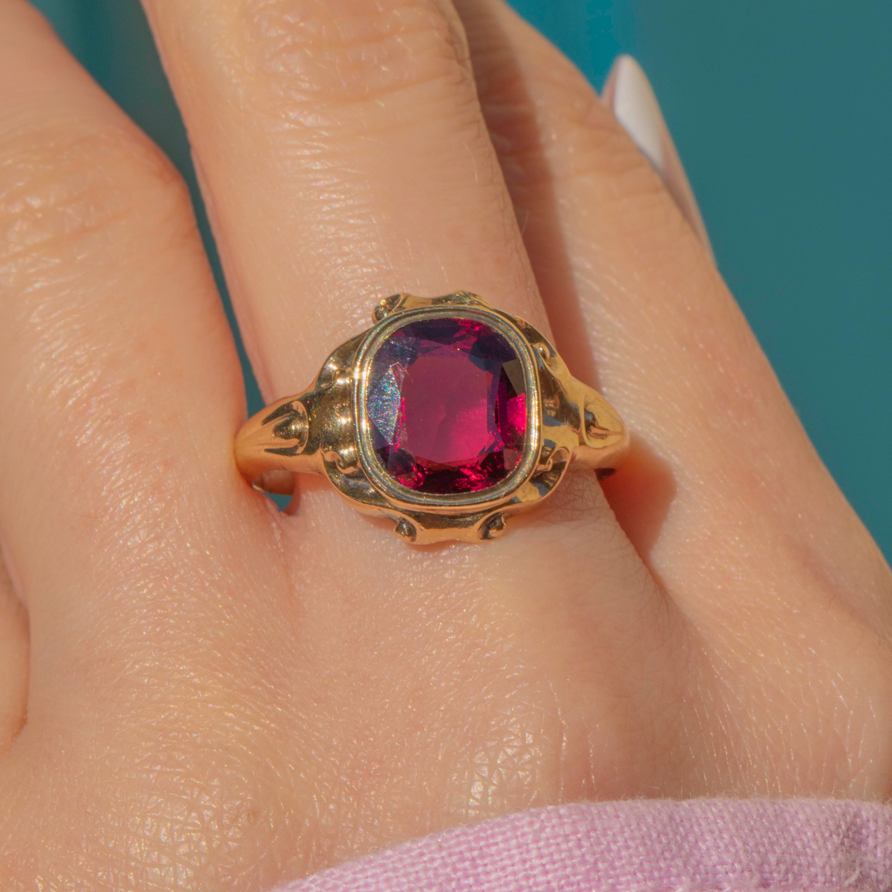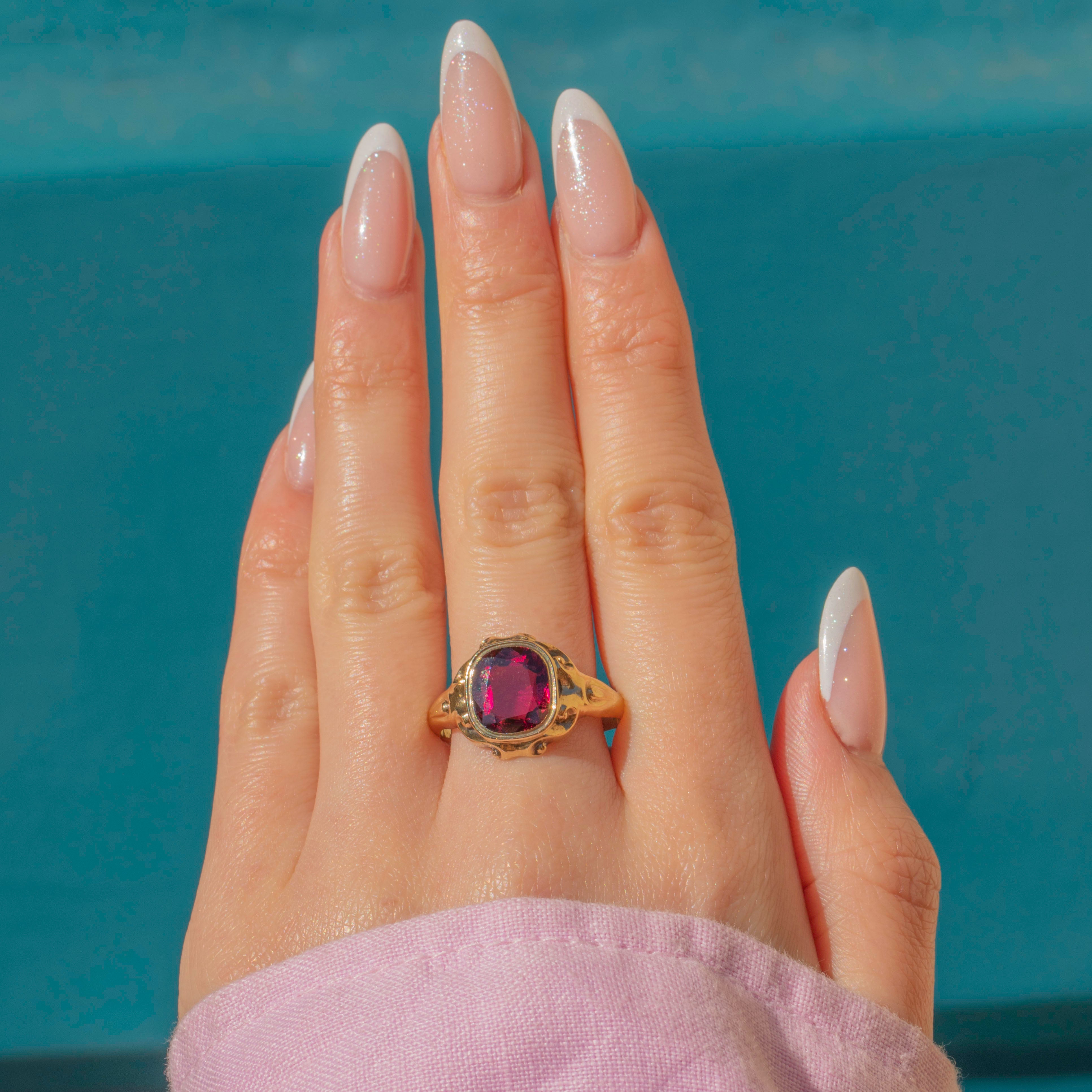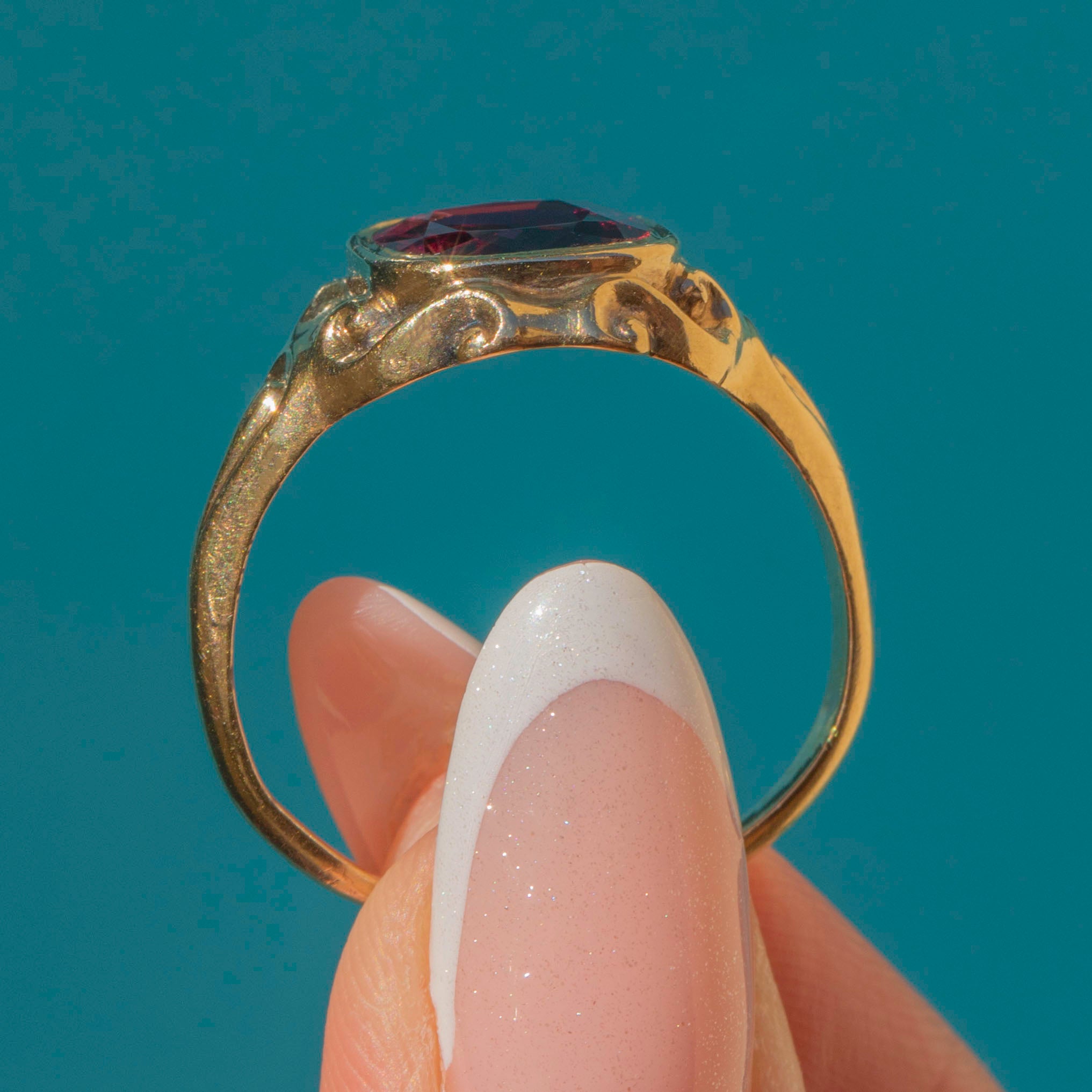 Encapsulating the essence of Victorian glamour, this antique 9ct Gold Garnet signet ring is sublime! Offering a fabulously faceted 1.30ct Garnet, flaunting deep sangria sparkles, nestled within a chunky 9ct Gold bezel setting to create a stand-out design.