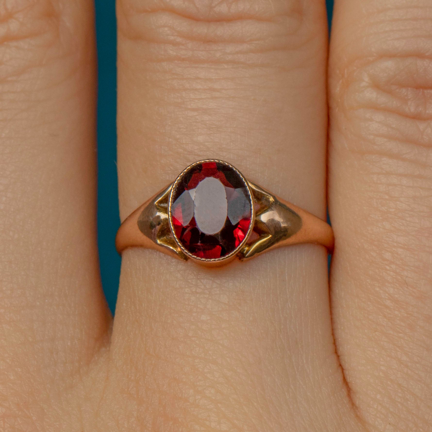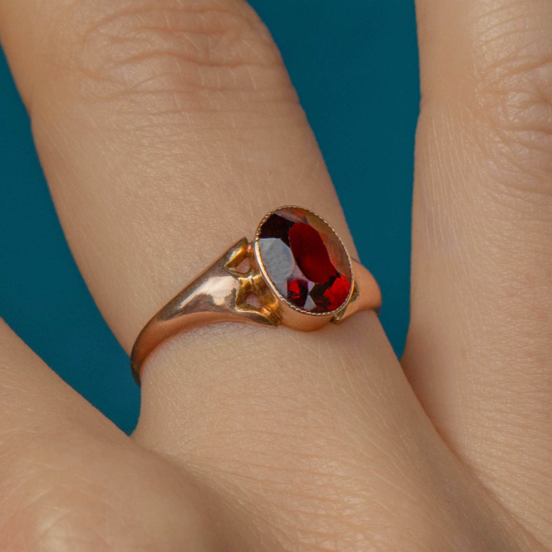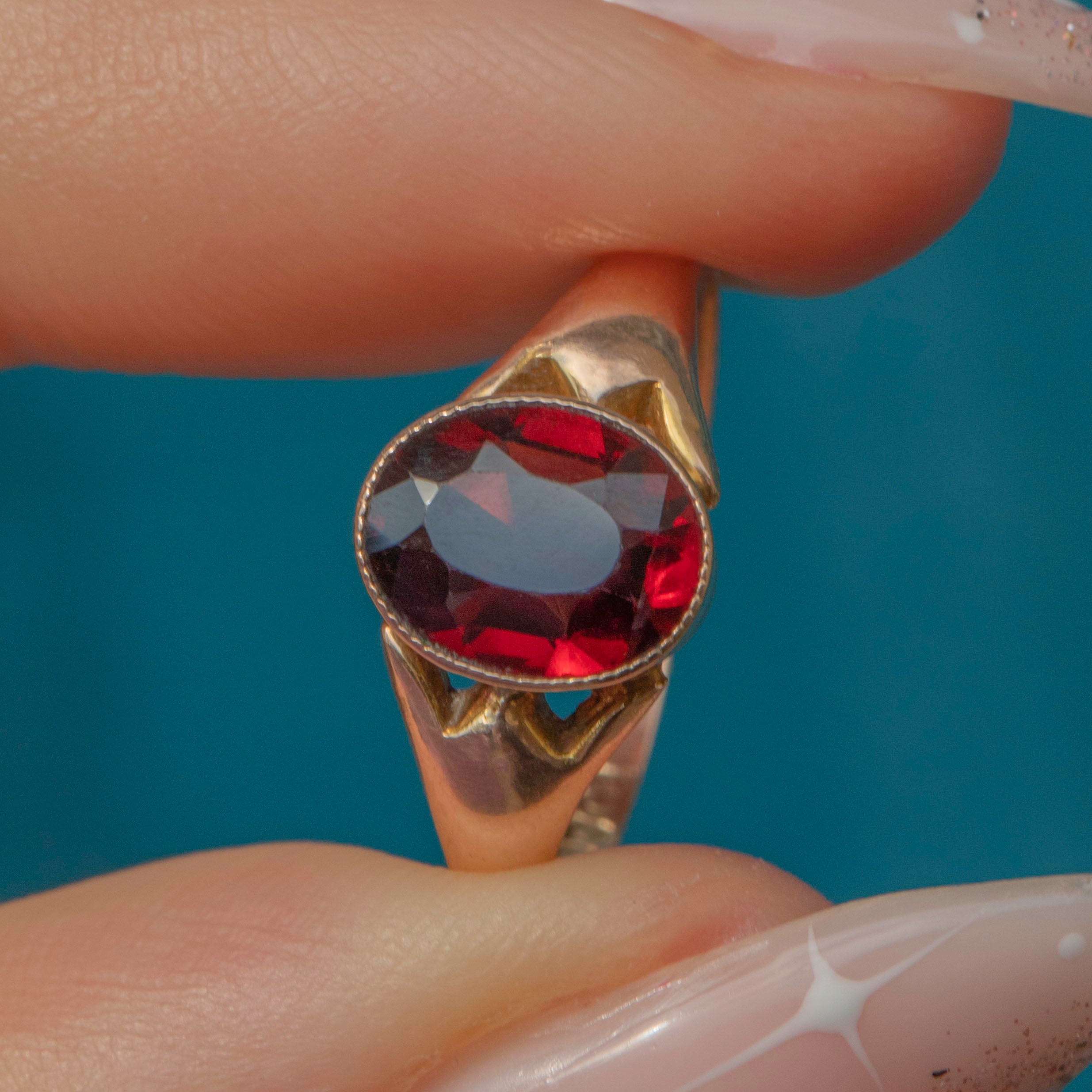 Bring a touch of elegance to your ring stack with this sultry antique 9ct Gold Garnet solitaire ring! The fabulously hand-faceted 0.95ct will instantly seduce you with her crimson hues glinting in the light, framed by a chunky Gold band with defined tapered shoulders that will provide you with ample finger coverage.