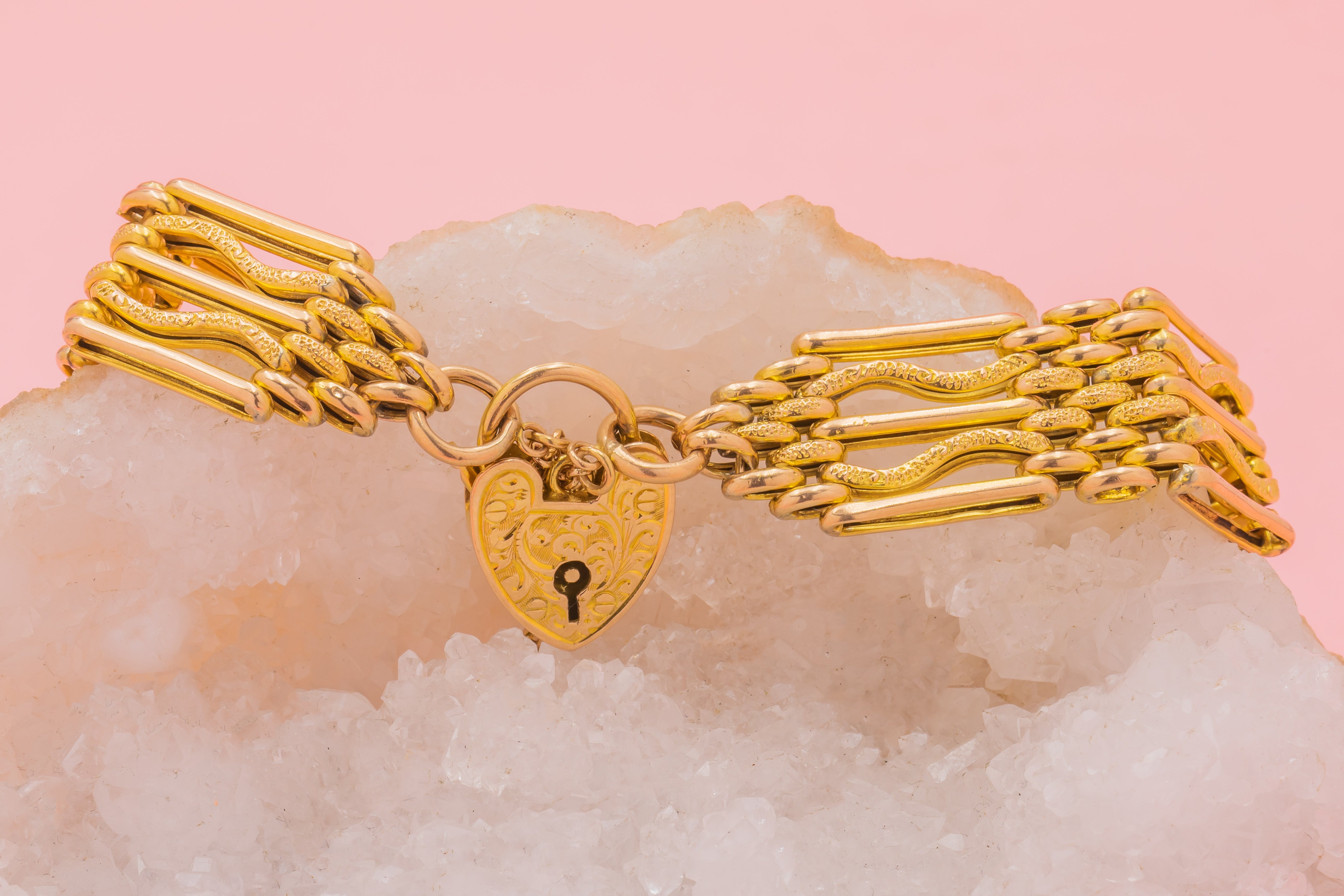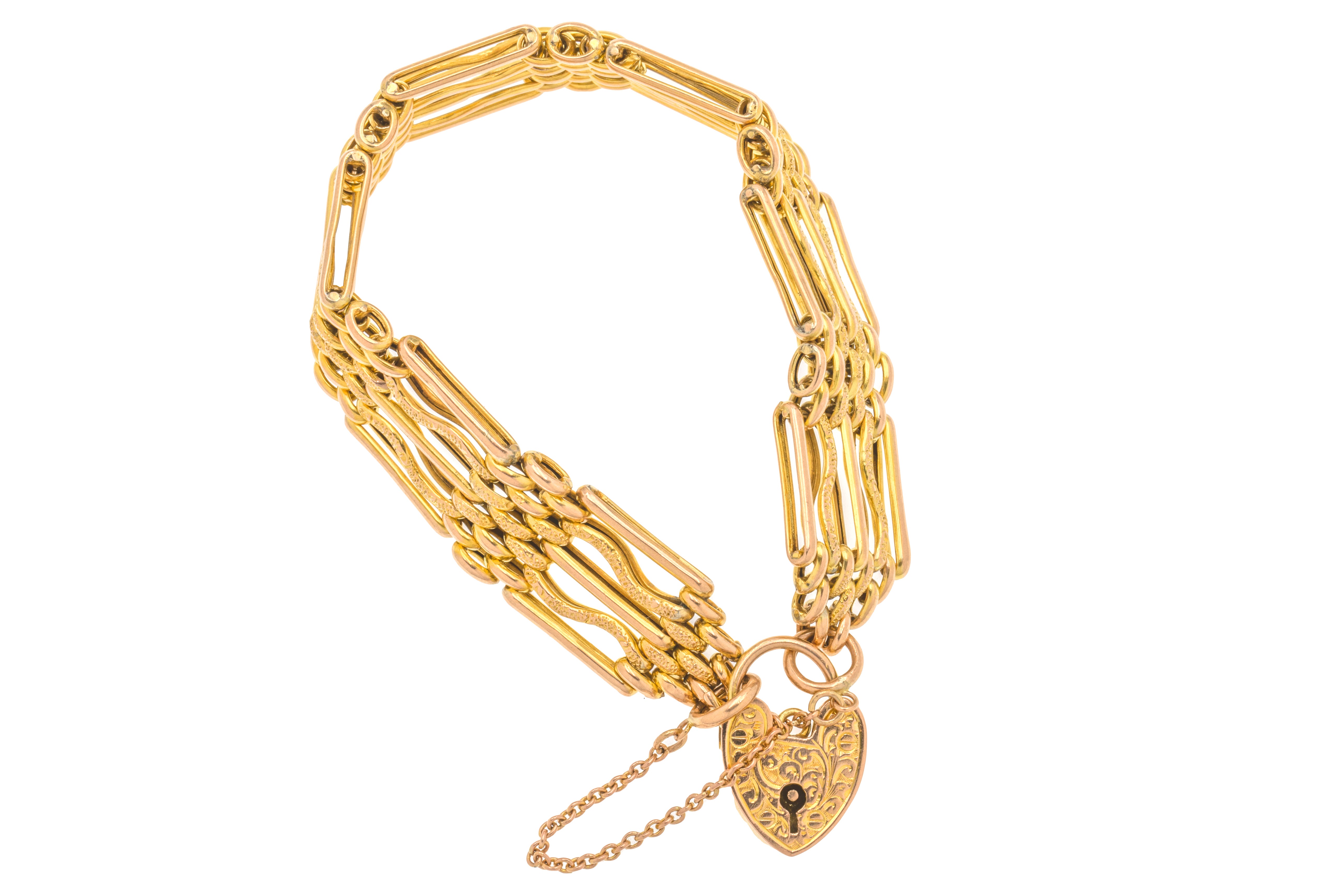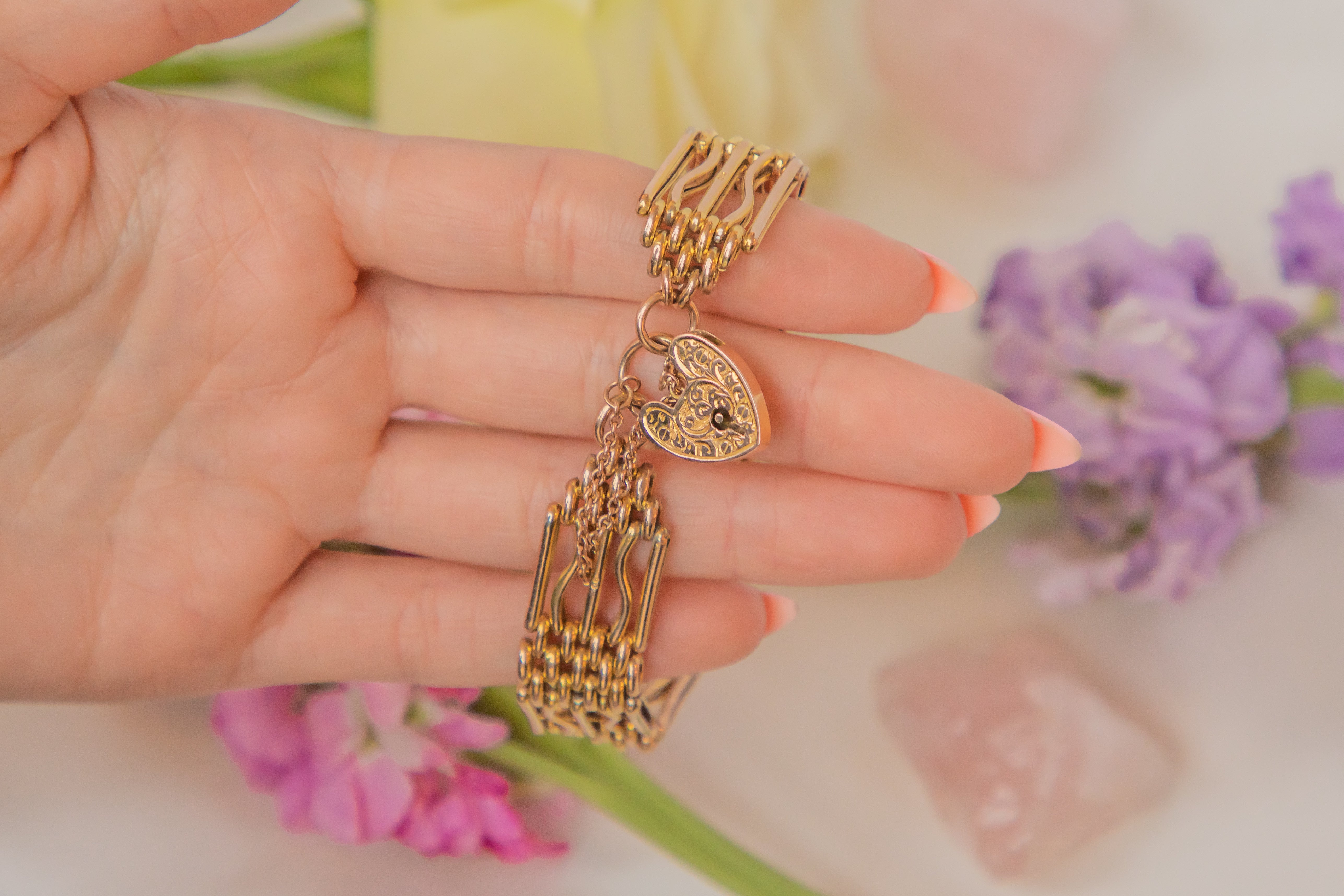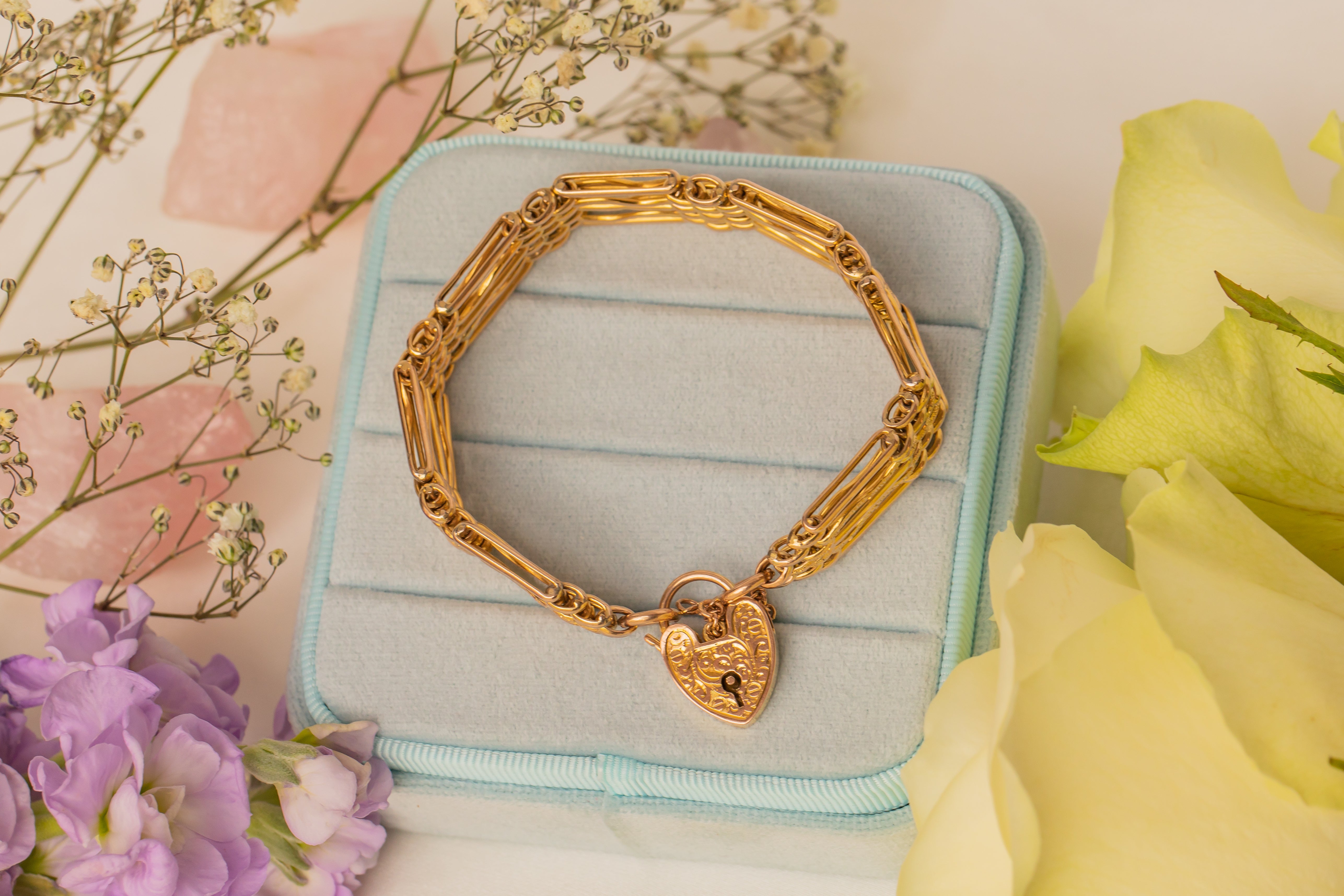 アンティーク 9ct ゴールド ゲート ブレスレット、彫刻入りハートパドロック、16.5g