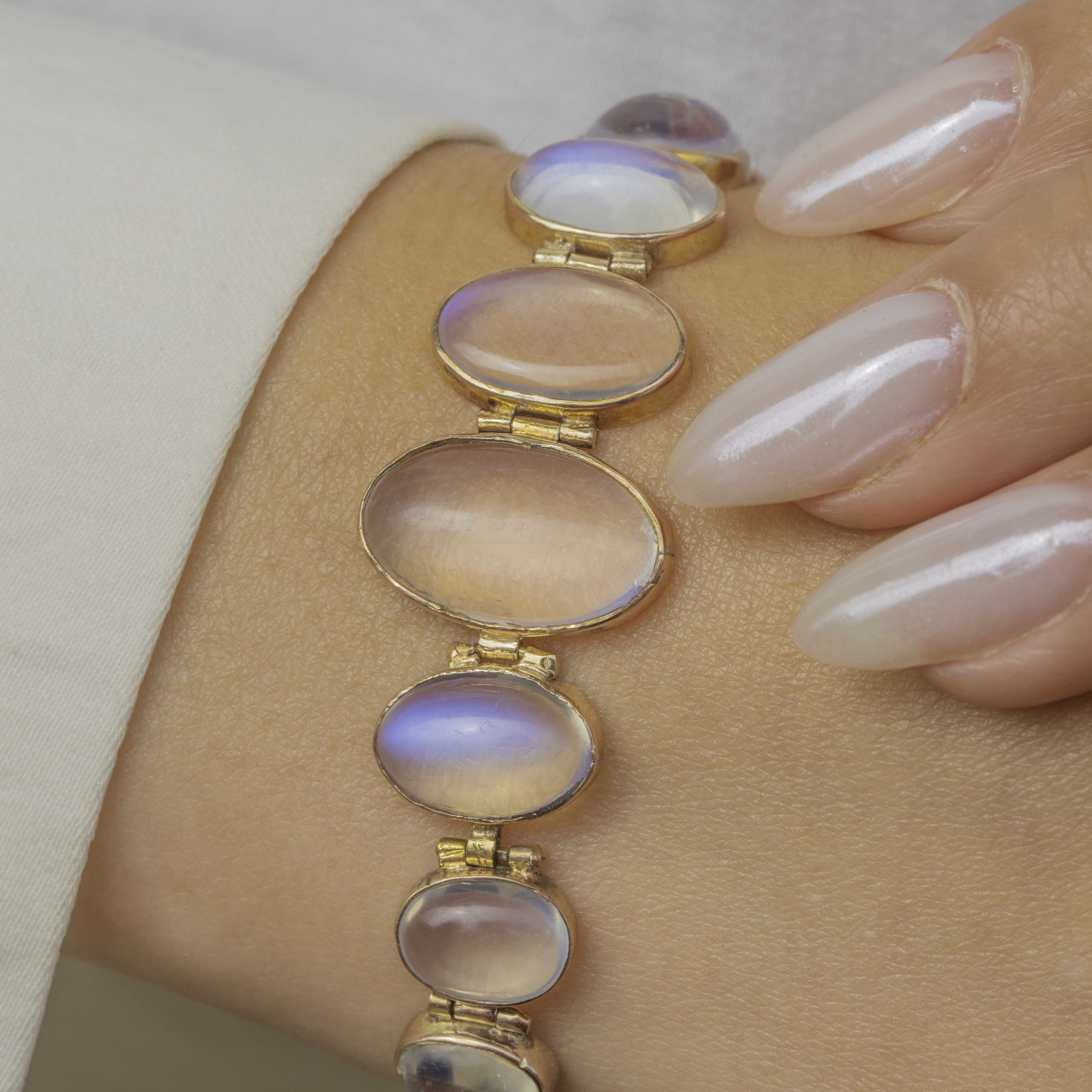 An Art Deco delight, flaunting eight graduating celestial Moonstones, boasting 8.45ct combined! Each oval Ceylon Moonstone billows the light wonderfully, revealing a soft blue adularescence.