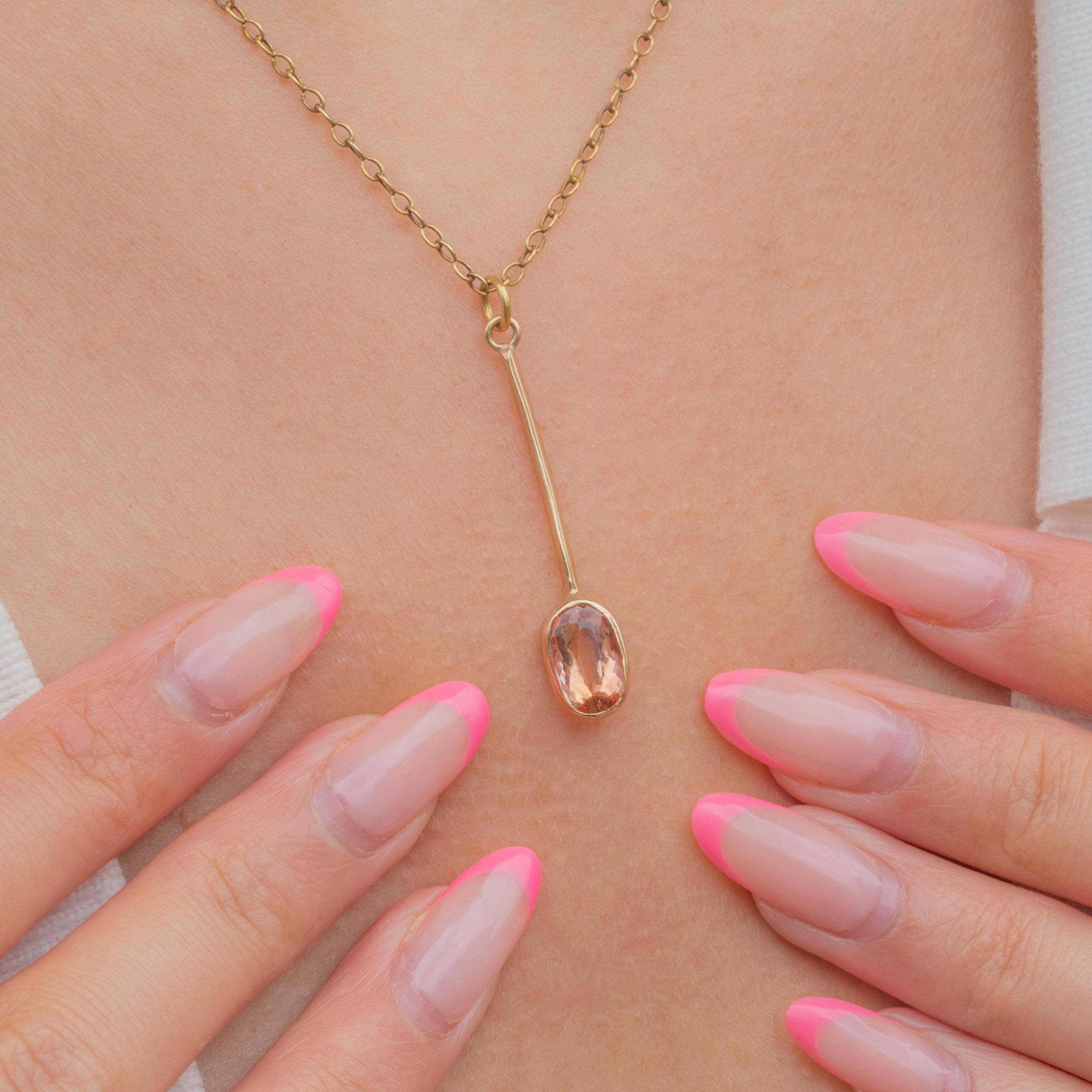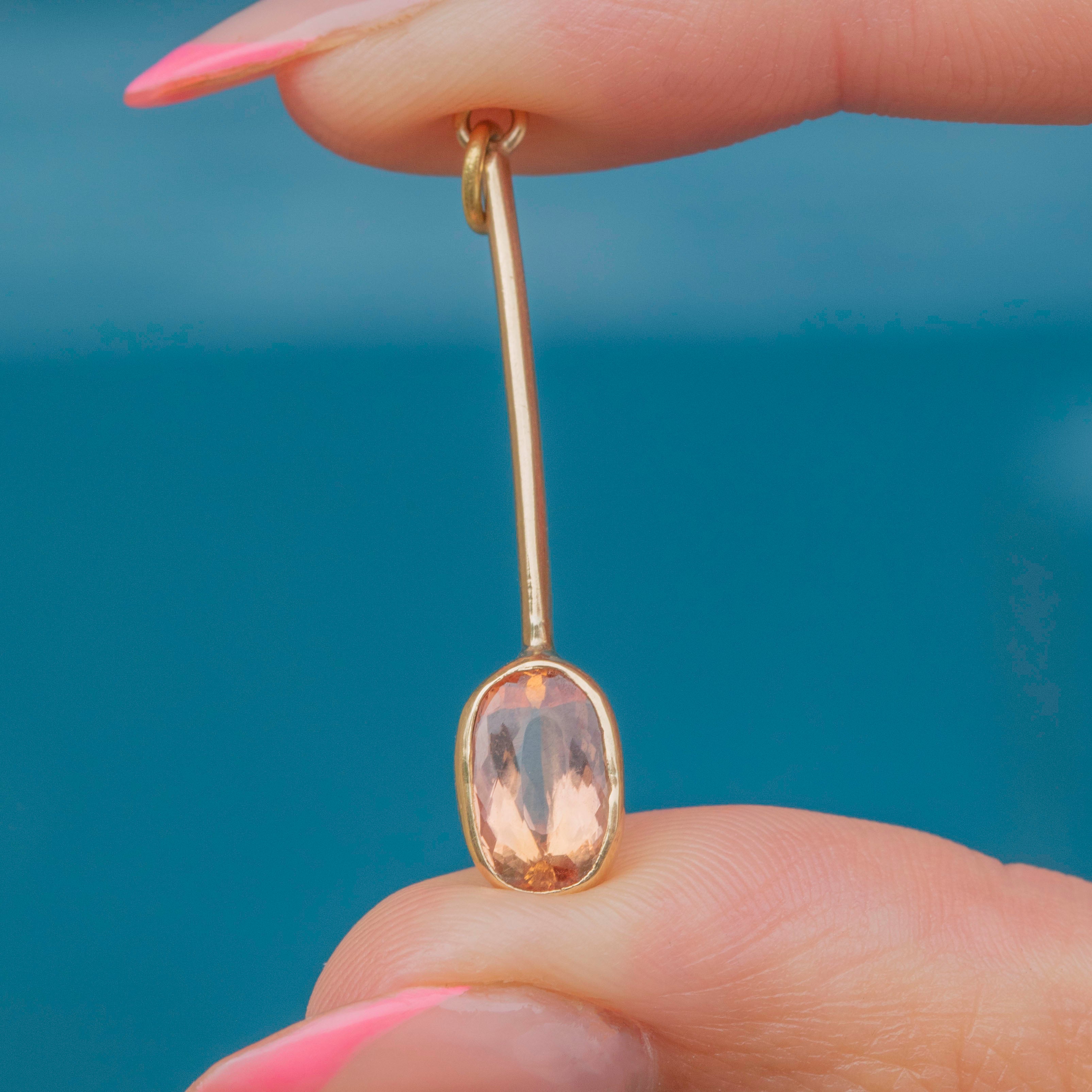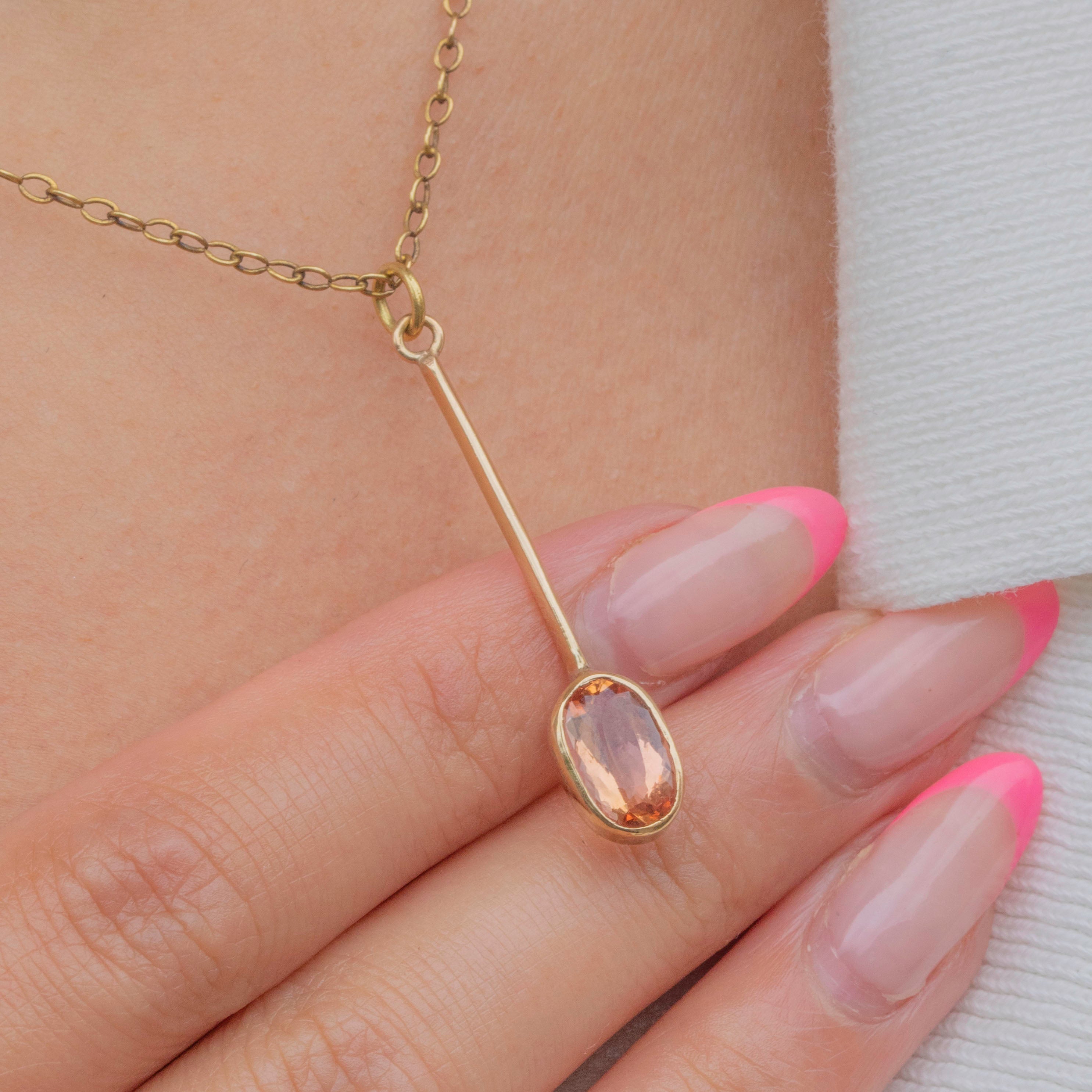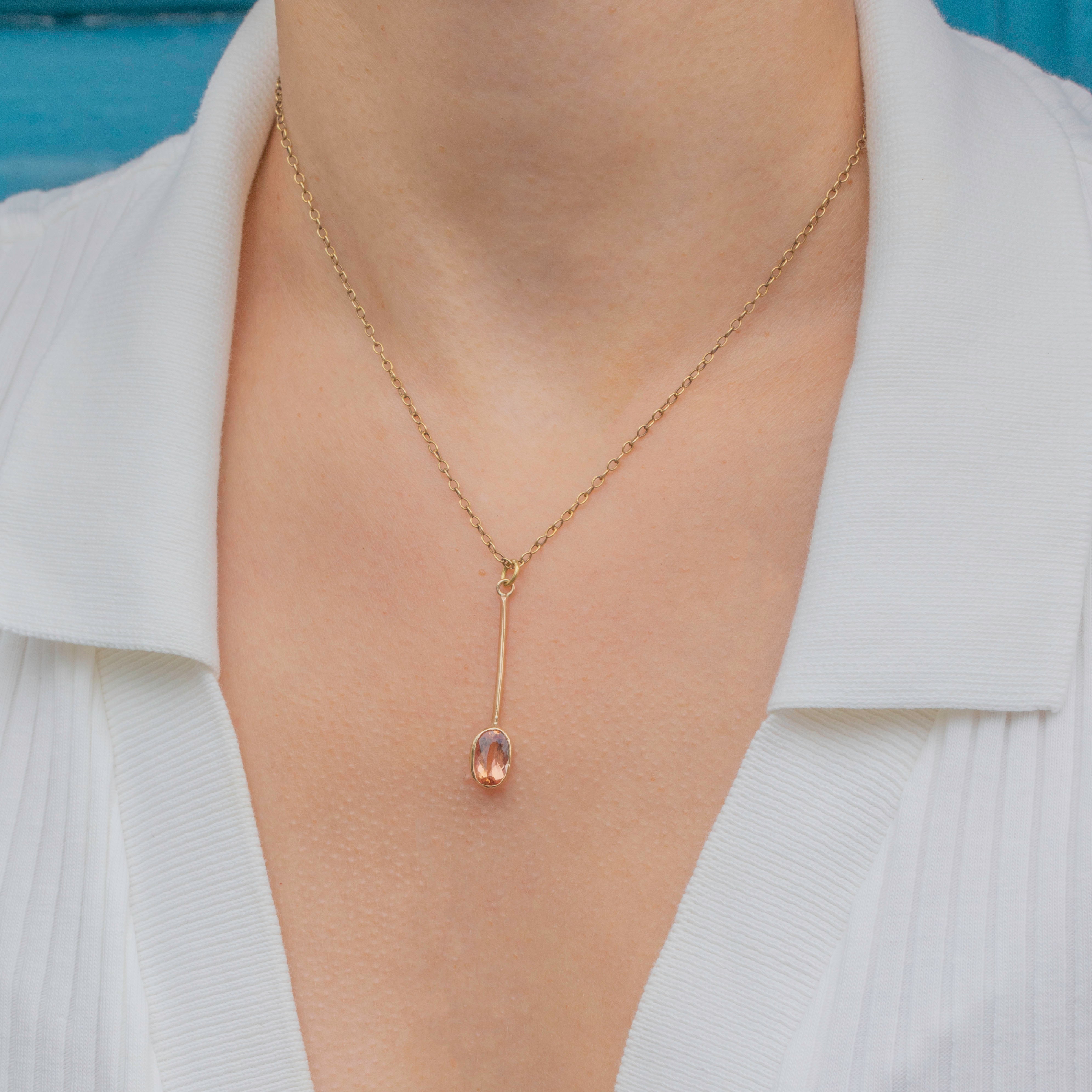 The Topaz is set in a smooth bezel, and when suspended from a fine Gold chain, the bar drop creates a sophisticated silhouette that will flatter your neckline. Endlessly appealing, this Victorian Imperial Topaz pendant will make a timeless addition to your collection!