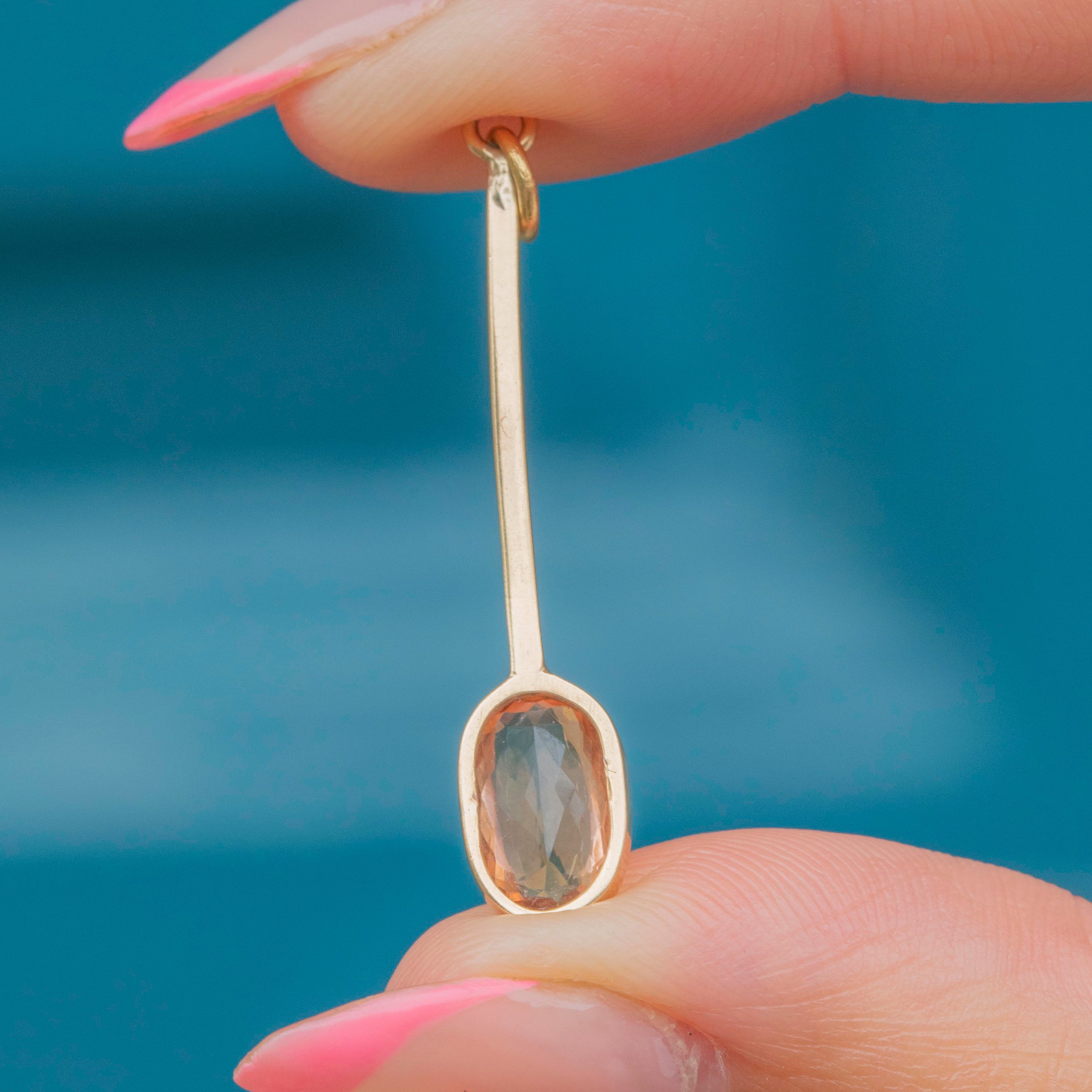 If you are looking for an elegant adornment for your décolletage, look no further than this antique 9ct Gold Imperial Topaz pendant! Crafted from solid 9ct Gold, this Victorian pendant displays a 1.02ct Imperial Topaz with a delightful peachy hue, glimmering subtly as its faceted oval form catches the light.