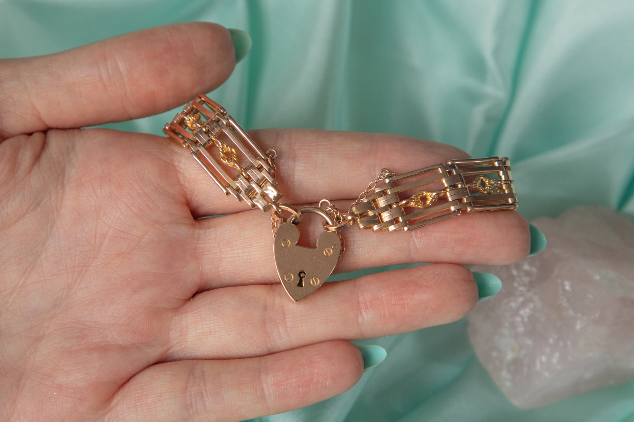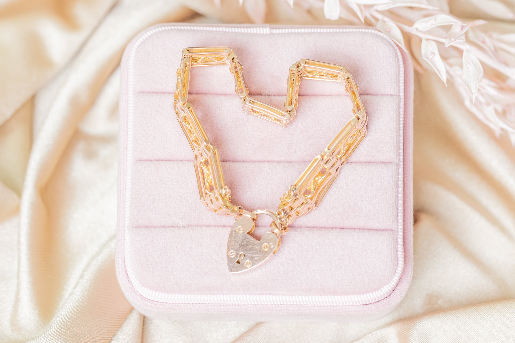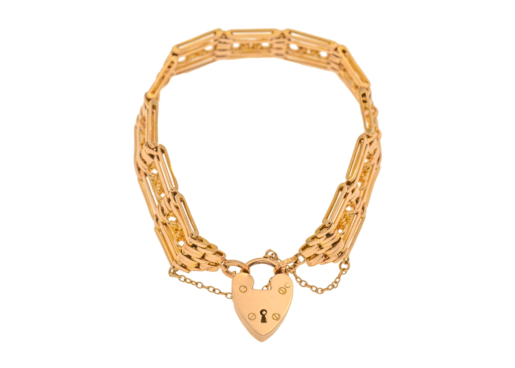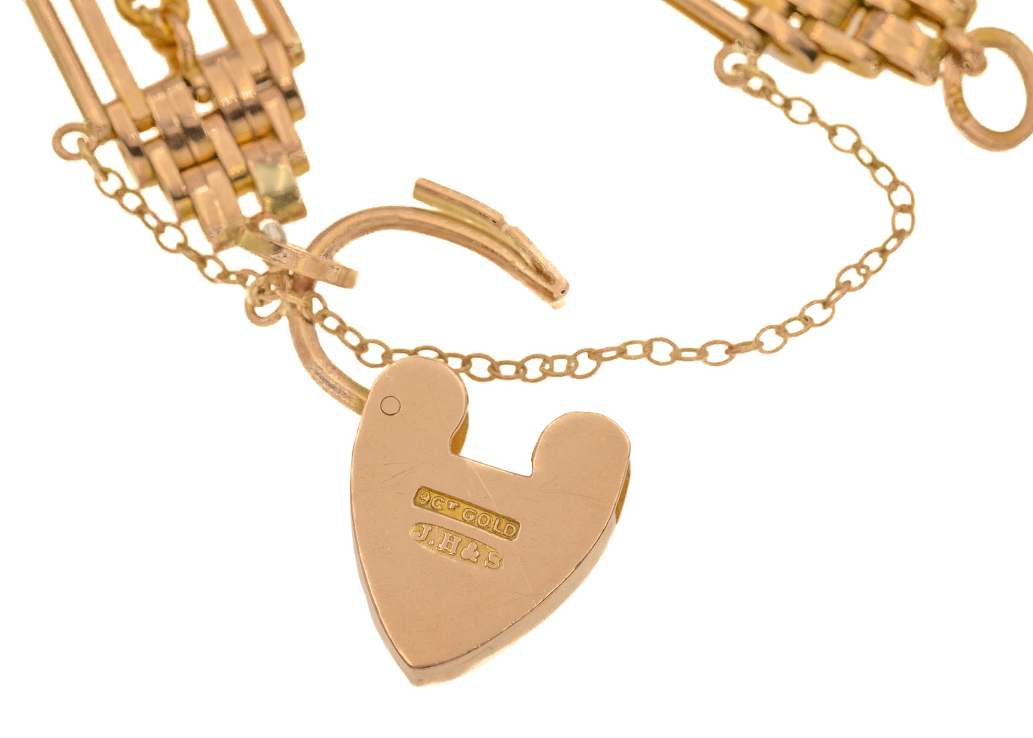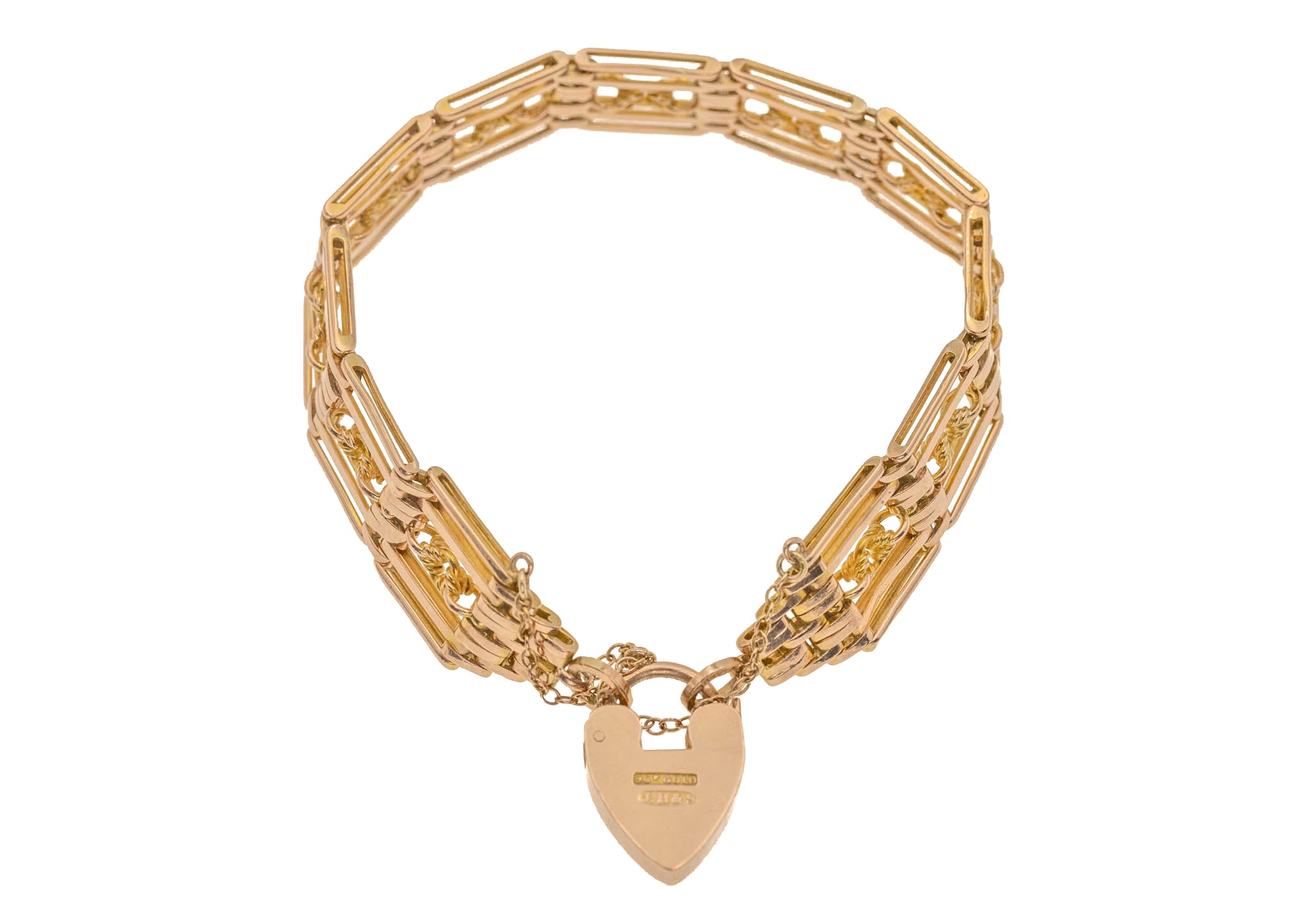 7インチ アンティーク 9ct ゴールド ラバーズノット ゲート ブレスレット ハートパドロック付き、26.4g