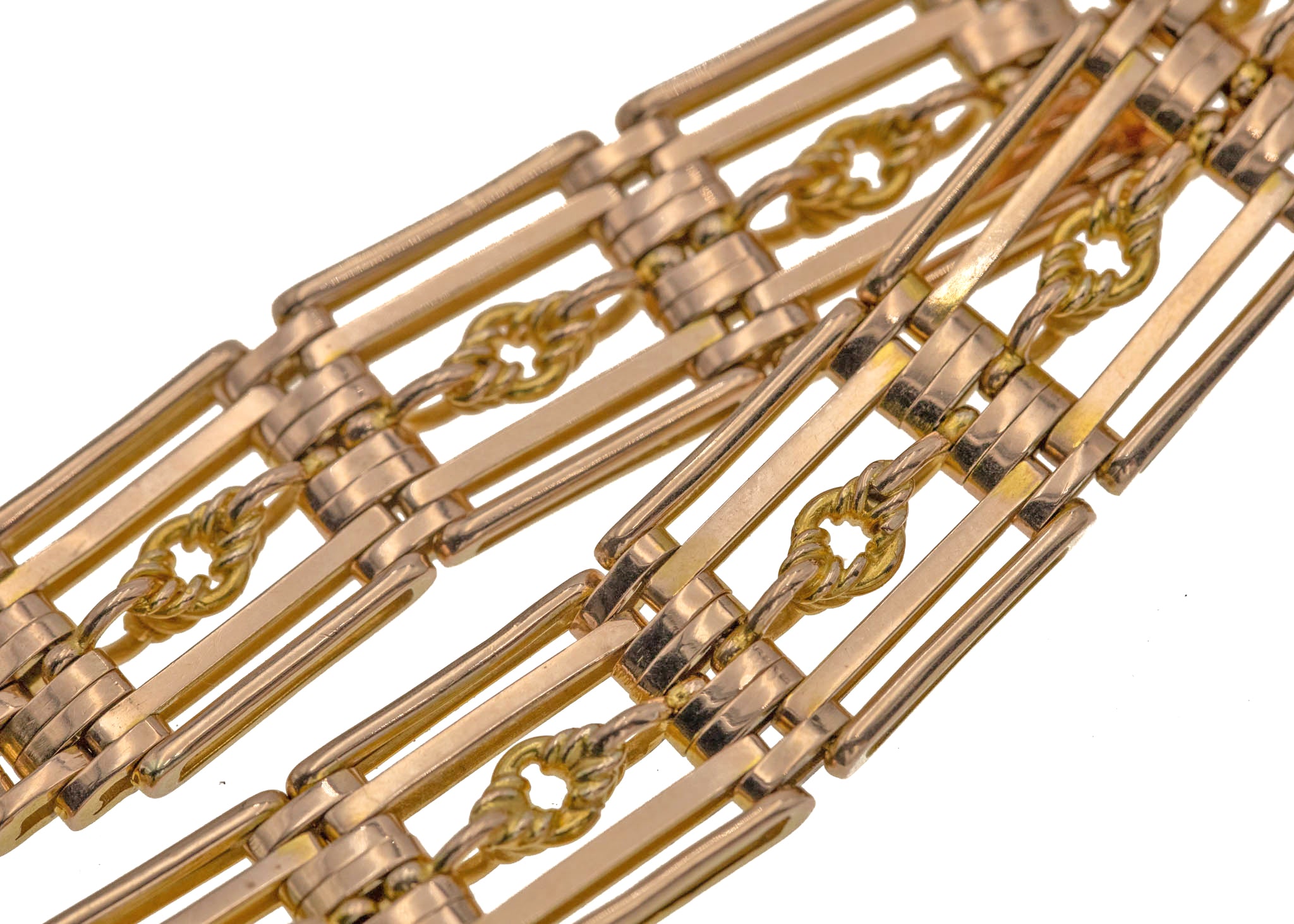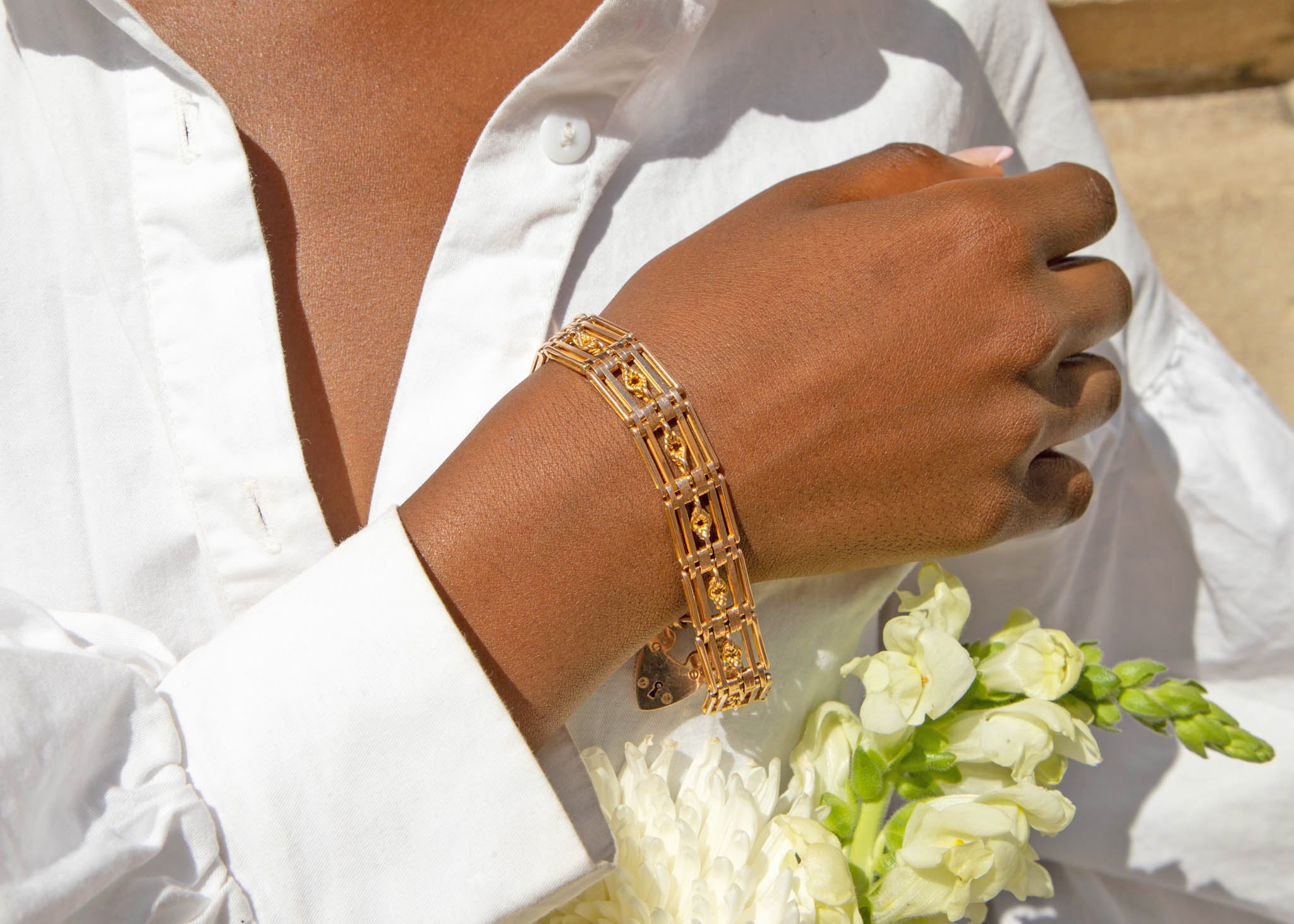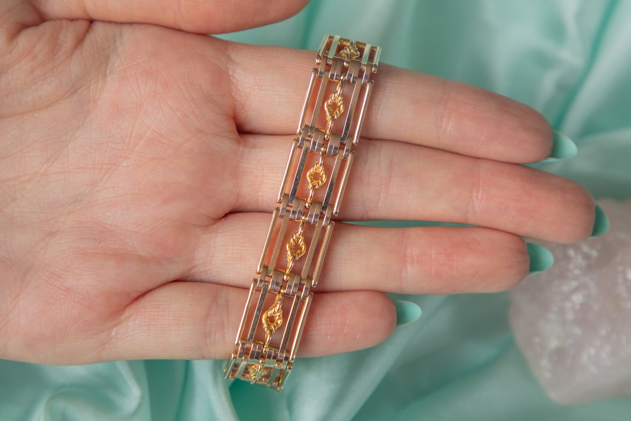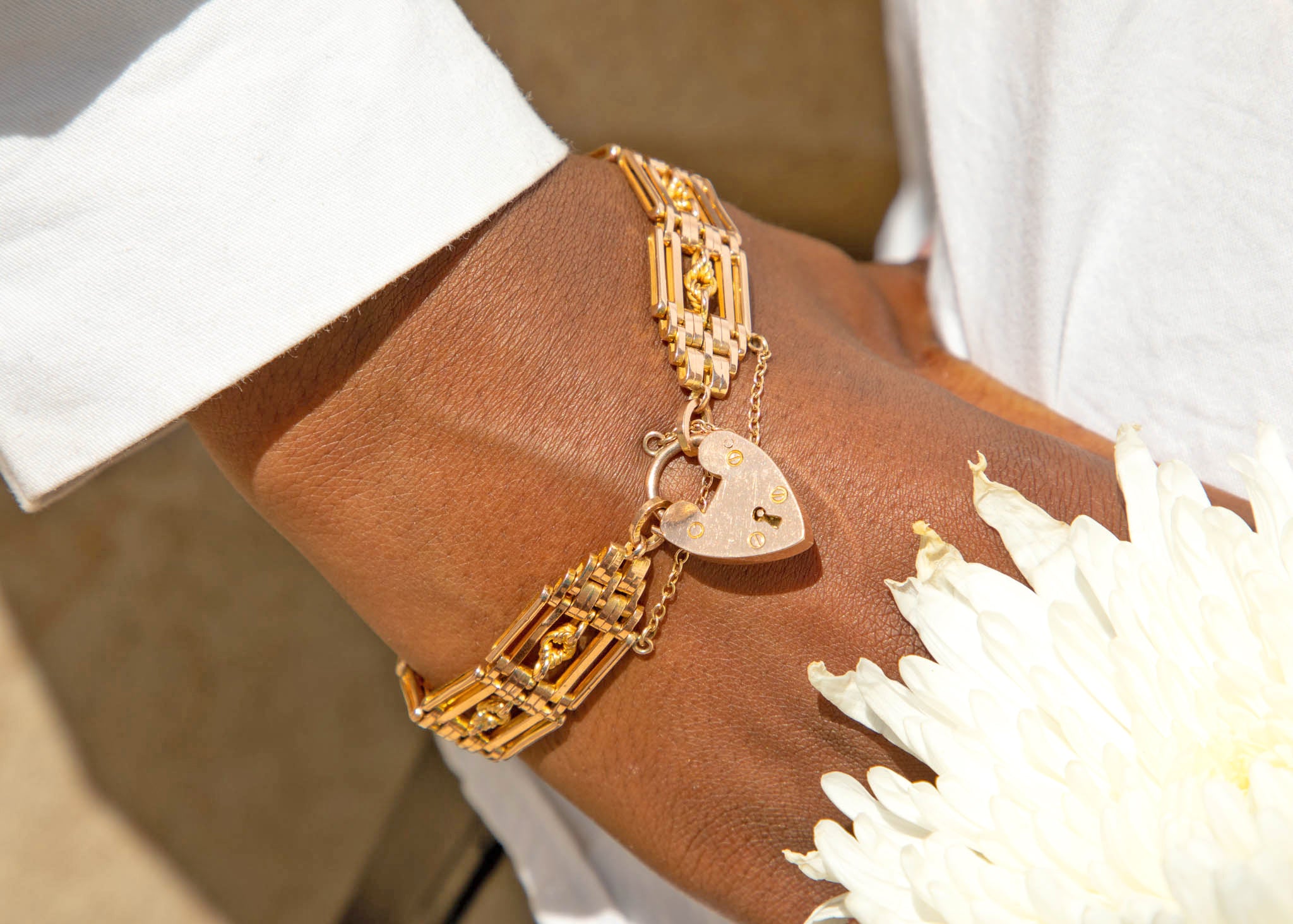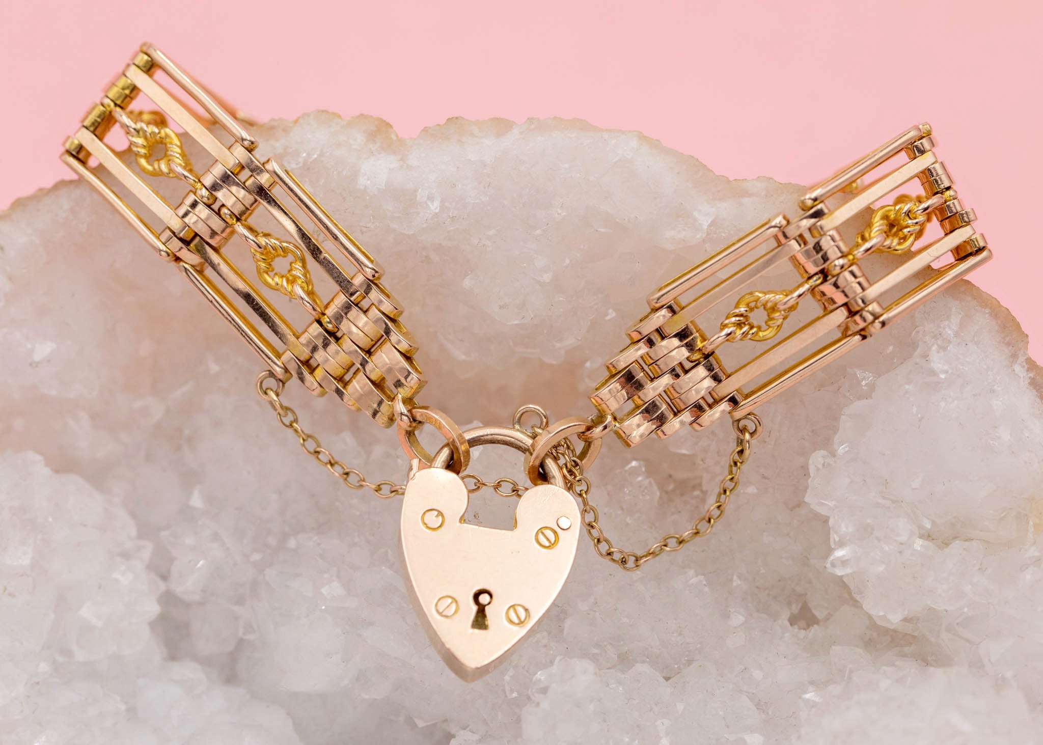 7インチ アンティーク 9ct ゴールド ラバーズノット ゲート ブレスレット ハートパドロック付き、26.4g
