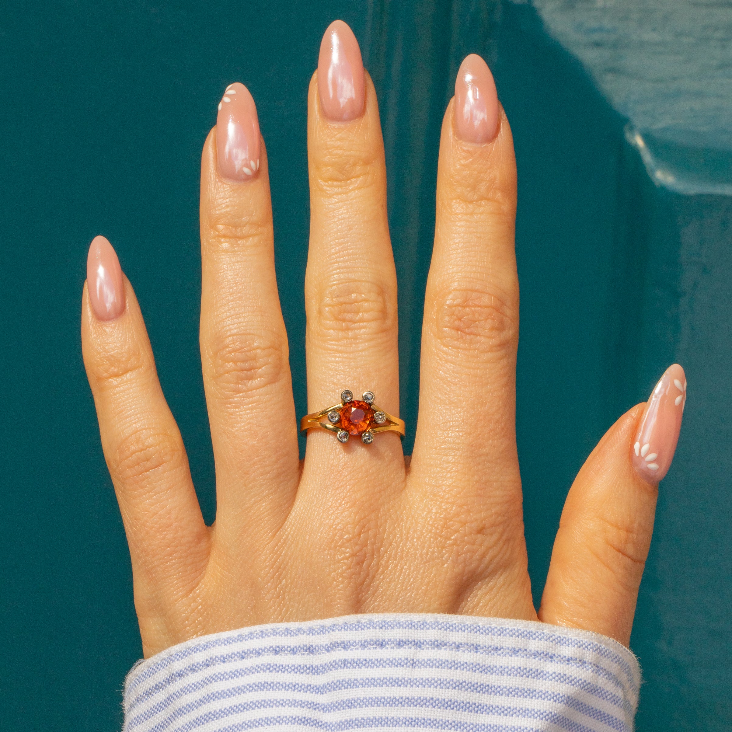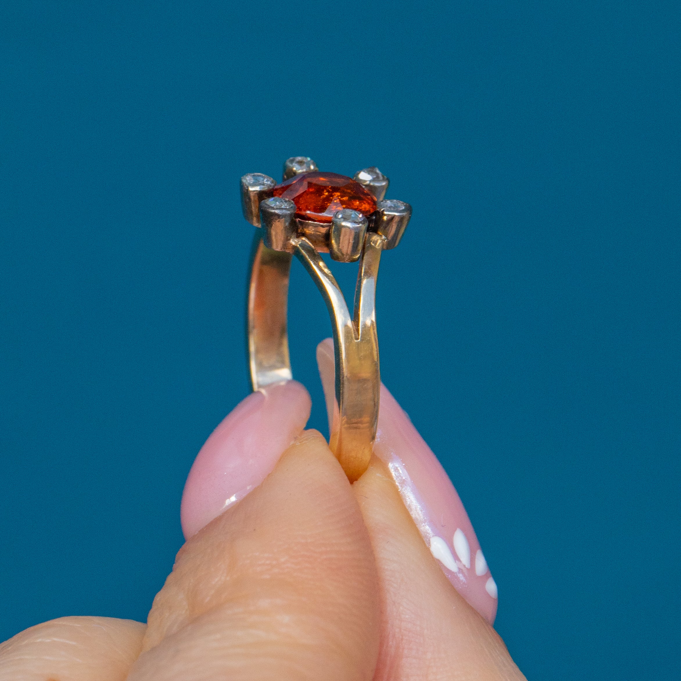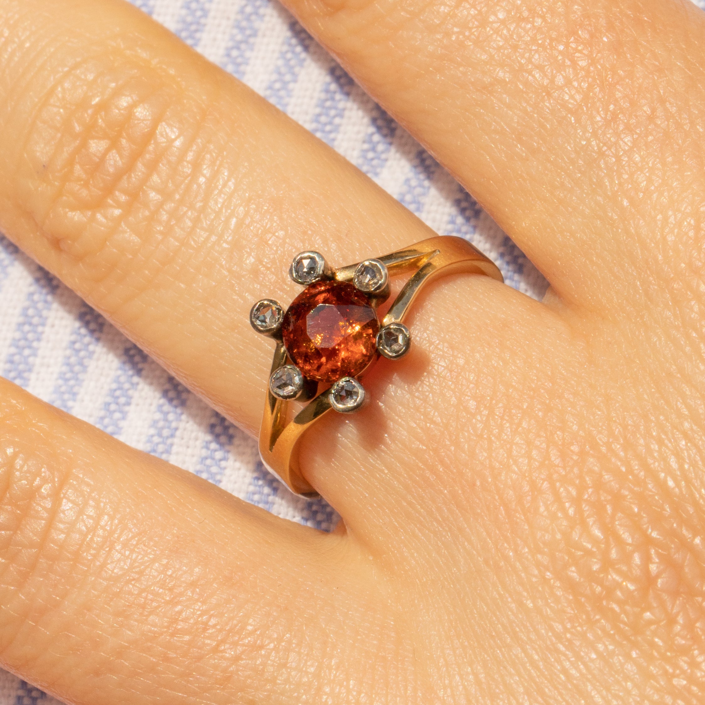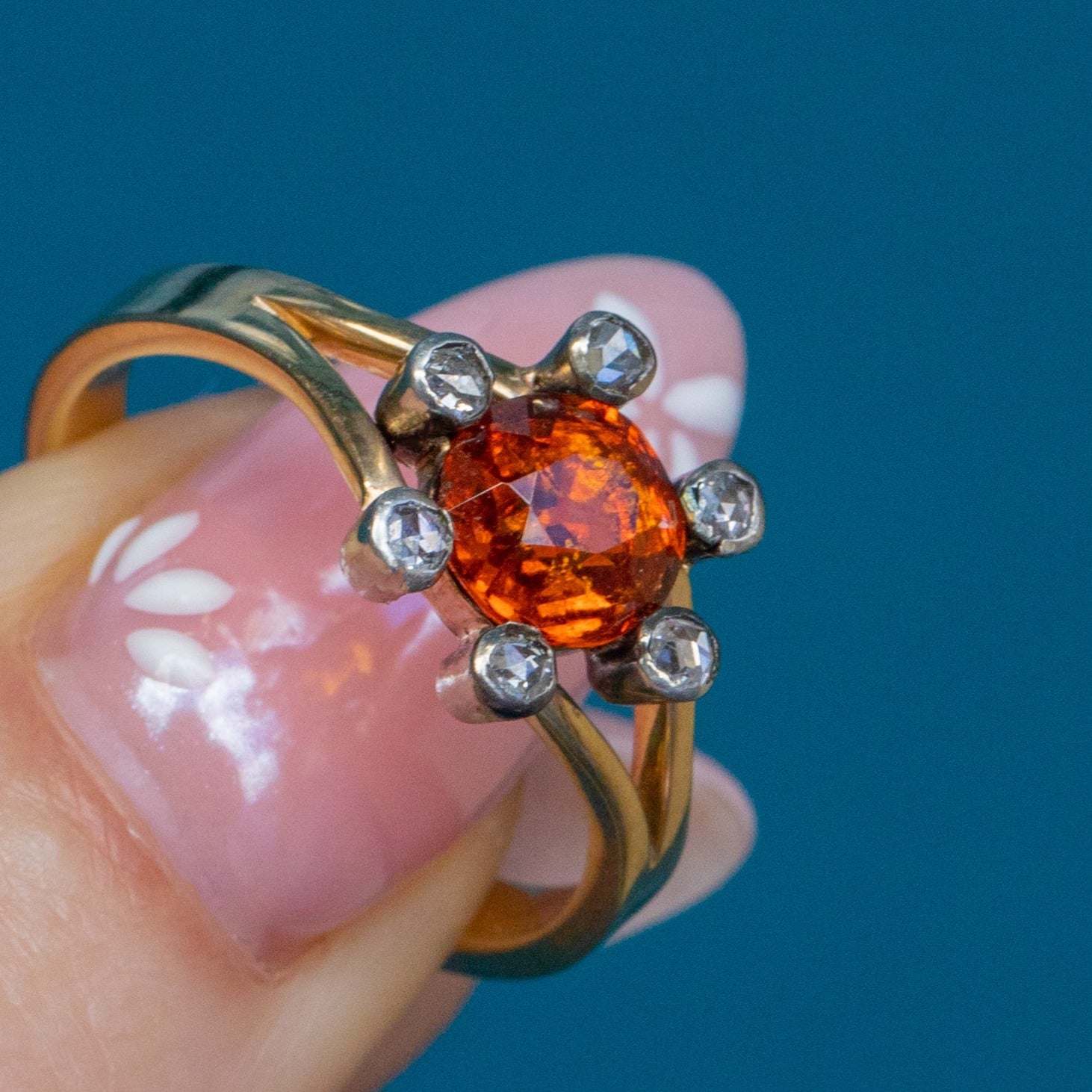 We adore this antique 9ct Gold Madeira Citrine Diamond ring! The ring band has been made from 9ct Yellow Gold splitting at the shoulders to meet a sumptuous Madeira Citrine and rose-cut Diamond cluster.