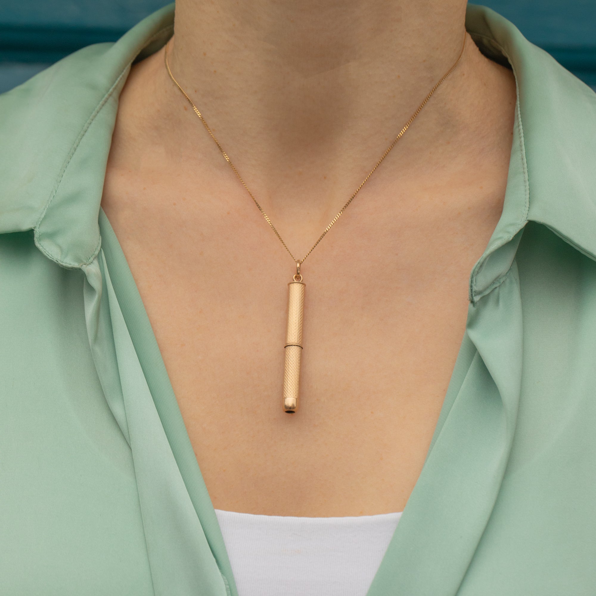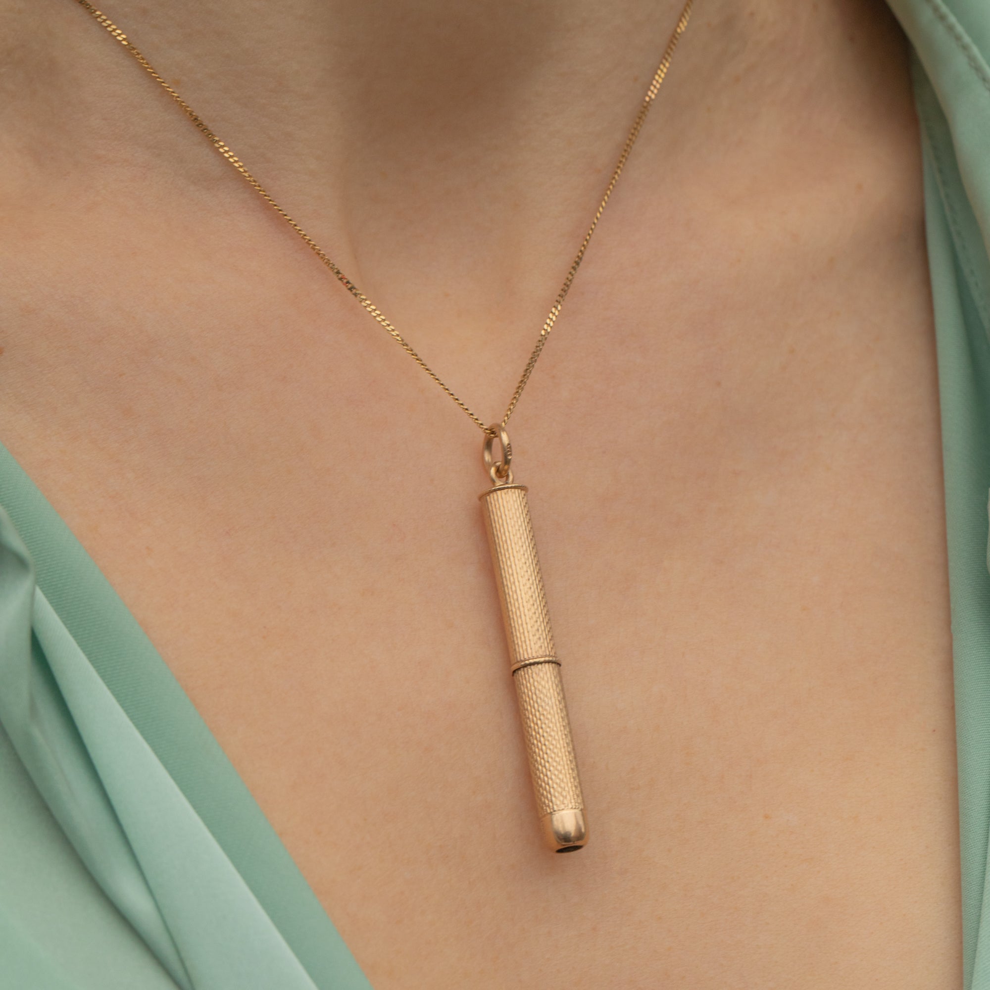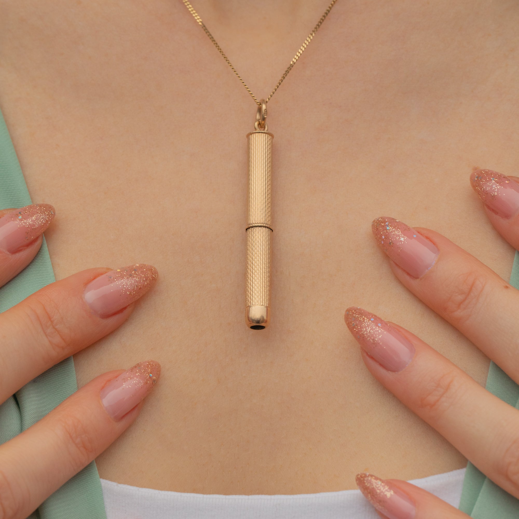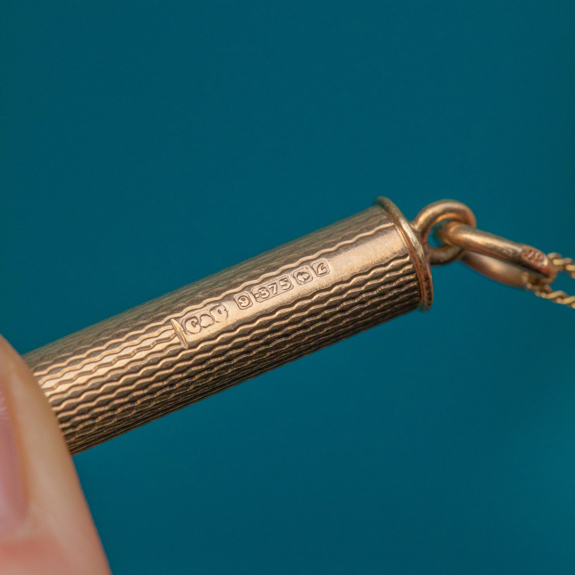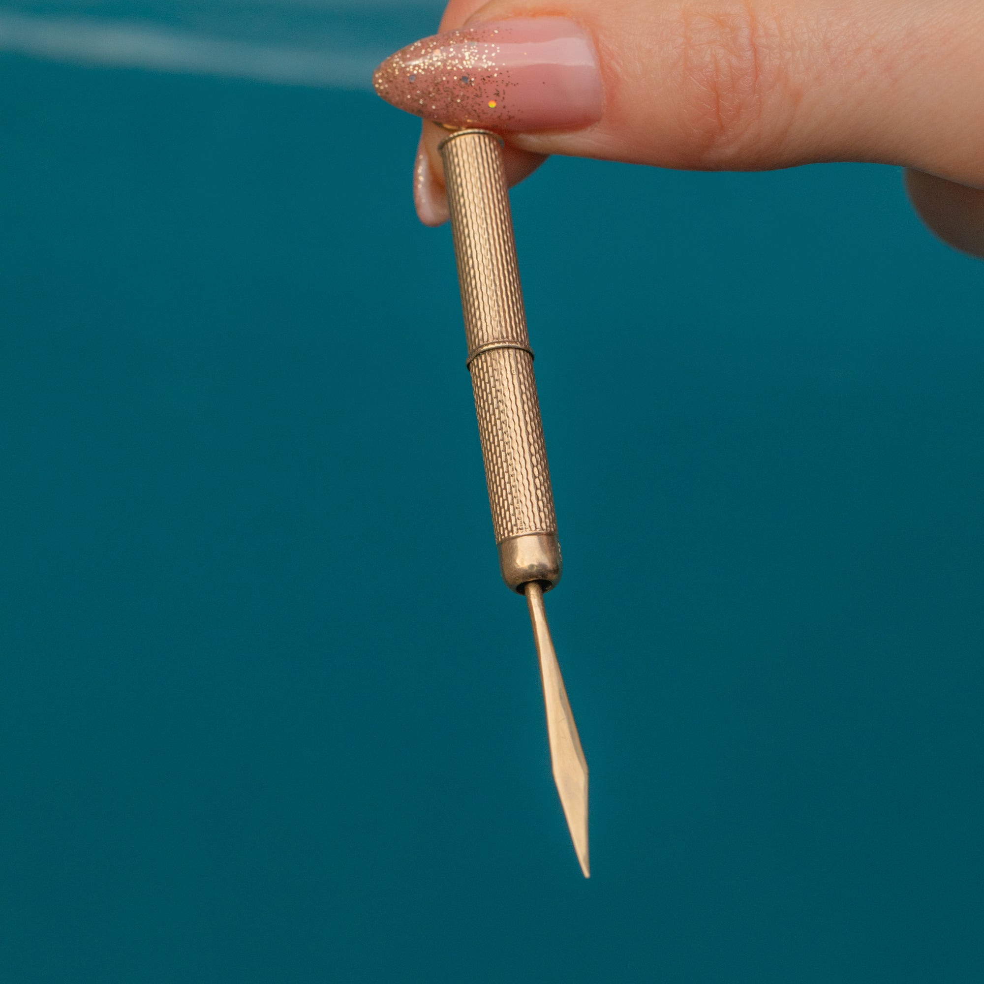 EXCELLENT An impeccable Antique 9ct Gold Mechanical Toothpick Pendant. Her engravings are crisp and clear throughout, and the Gold bright and glossy, too. The extension mechanism is in fine working order, ensuring she functions not only as a pendant, but also as a toothpick, and even a letter opener or stirrer!