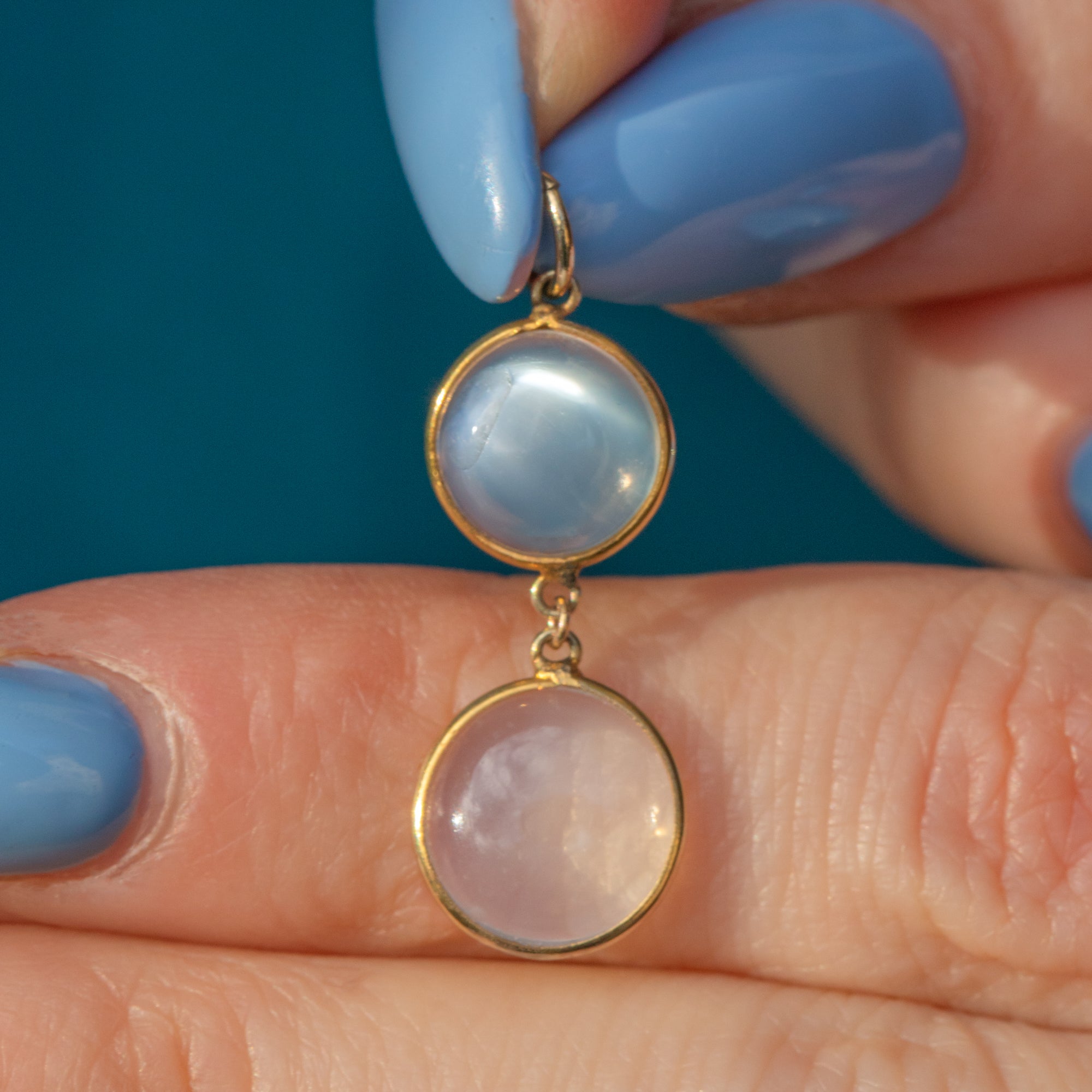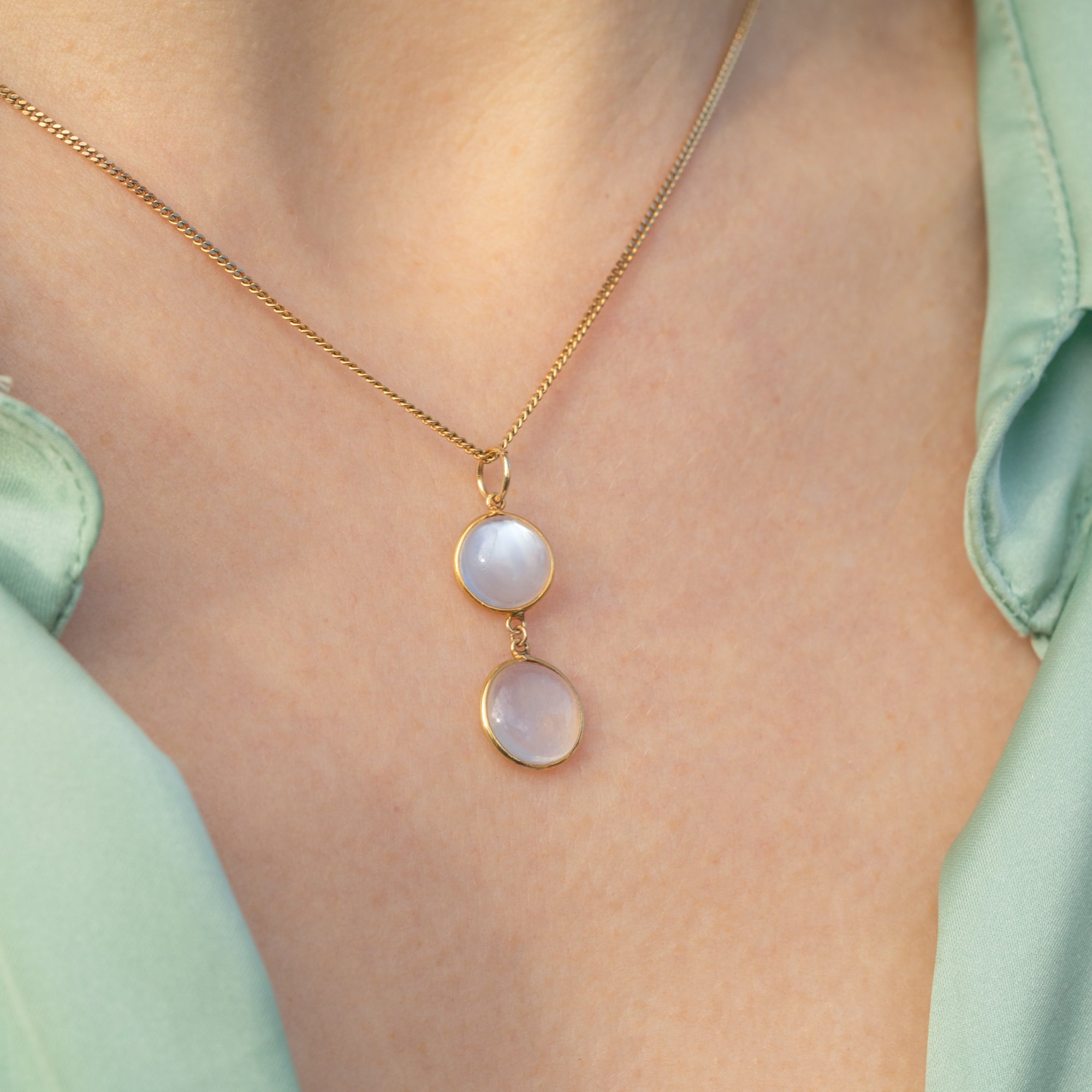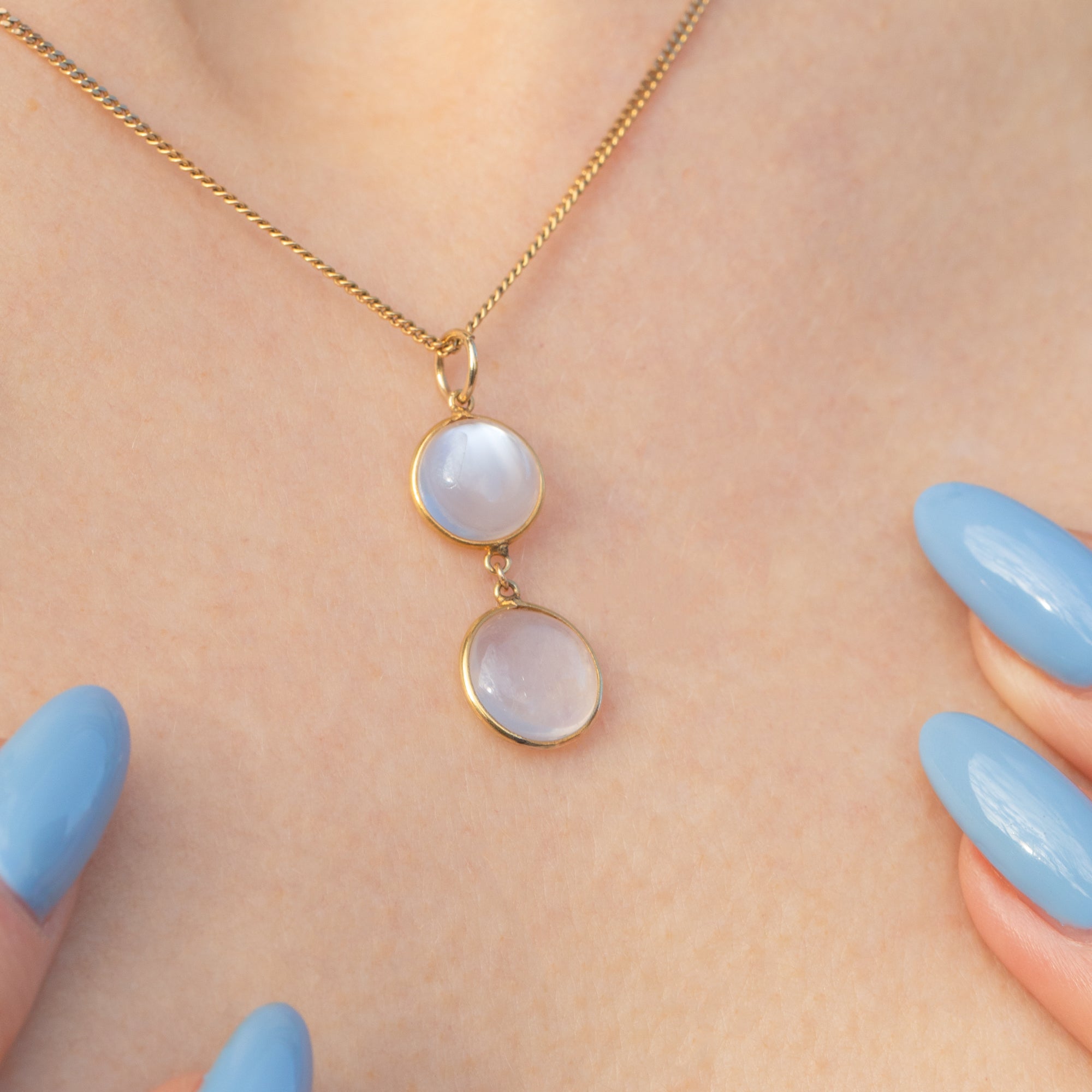This antique 9ct Gold Moonstone cabochon drop pendant is a magical piece to add to your collection! The Moonstones possess a perfectly ethereal blue-violet schiller, encased in warm 9ct Gold bezel settings.